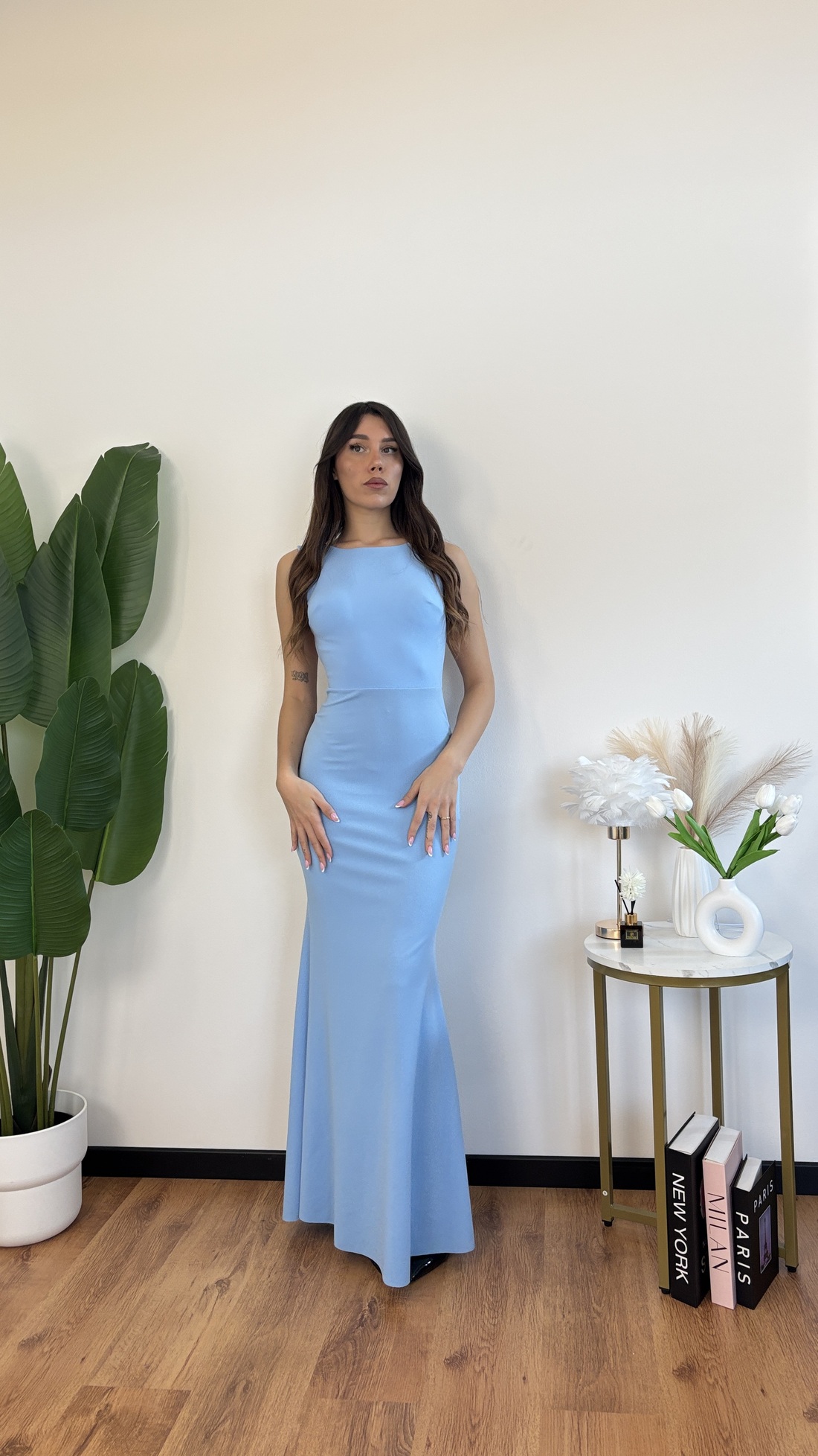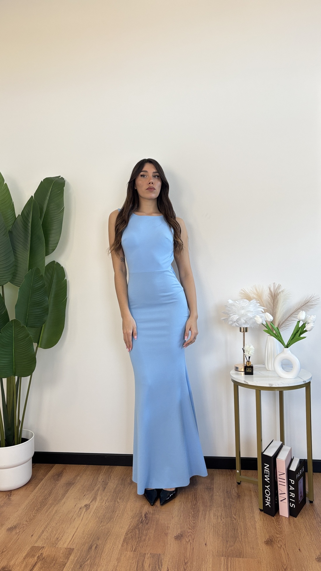 Abito lungo con schiena nuda e fiocco sul dietro.
