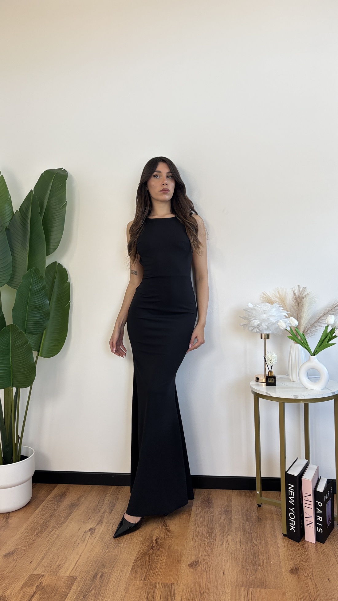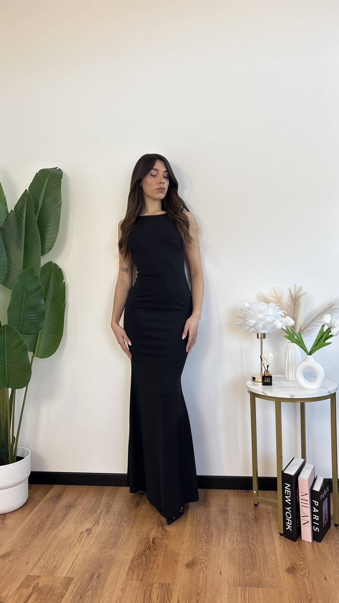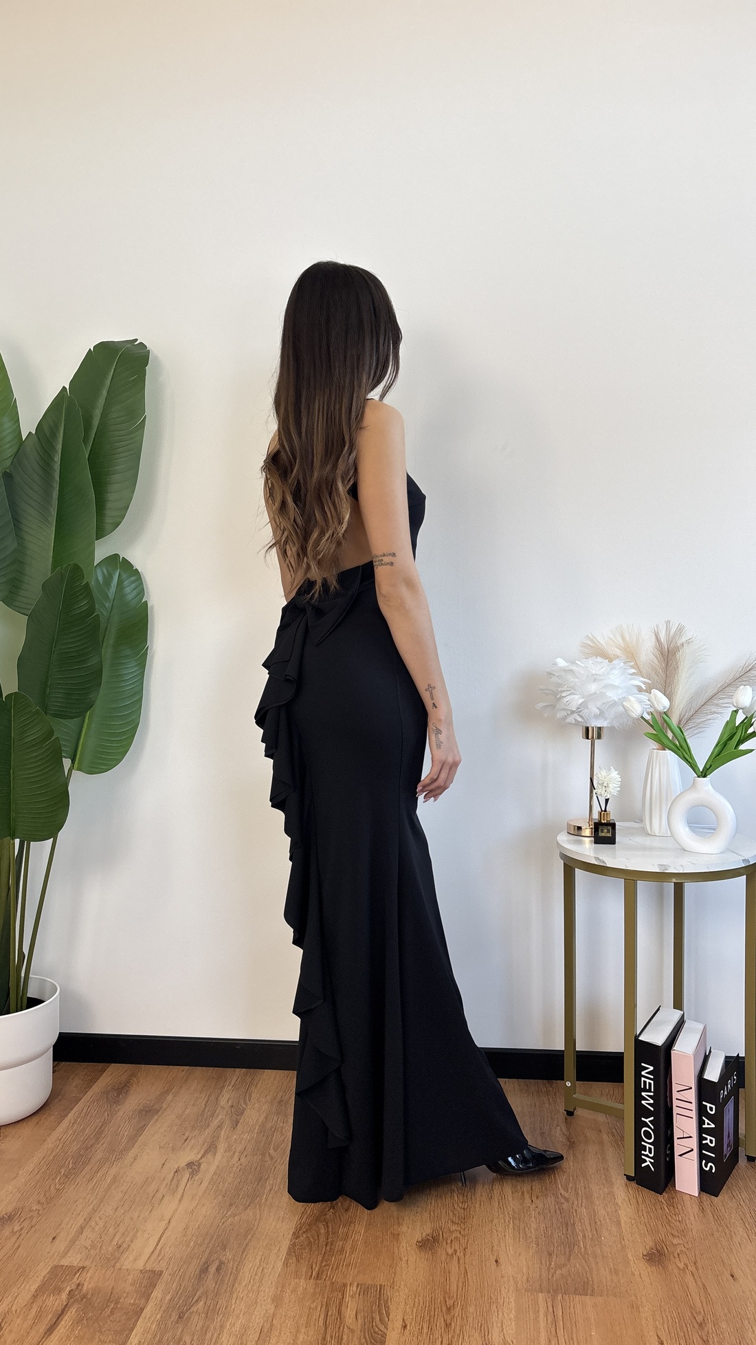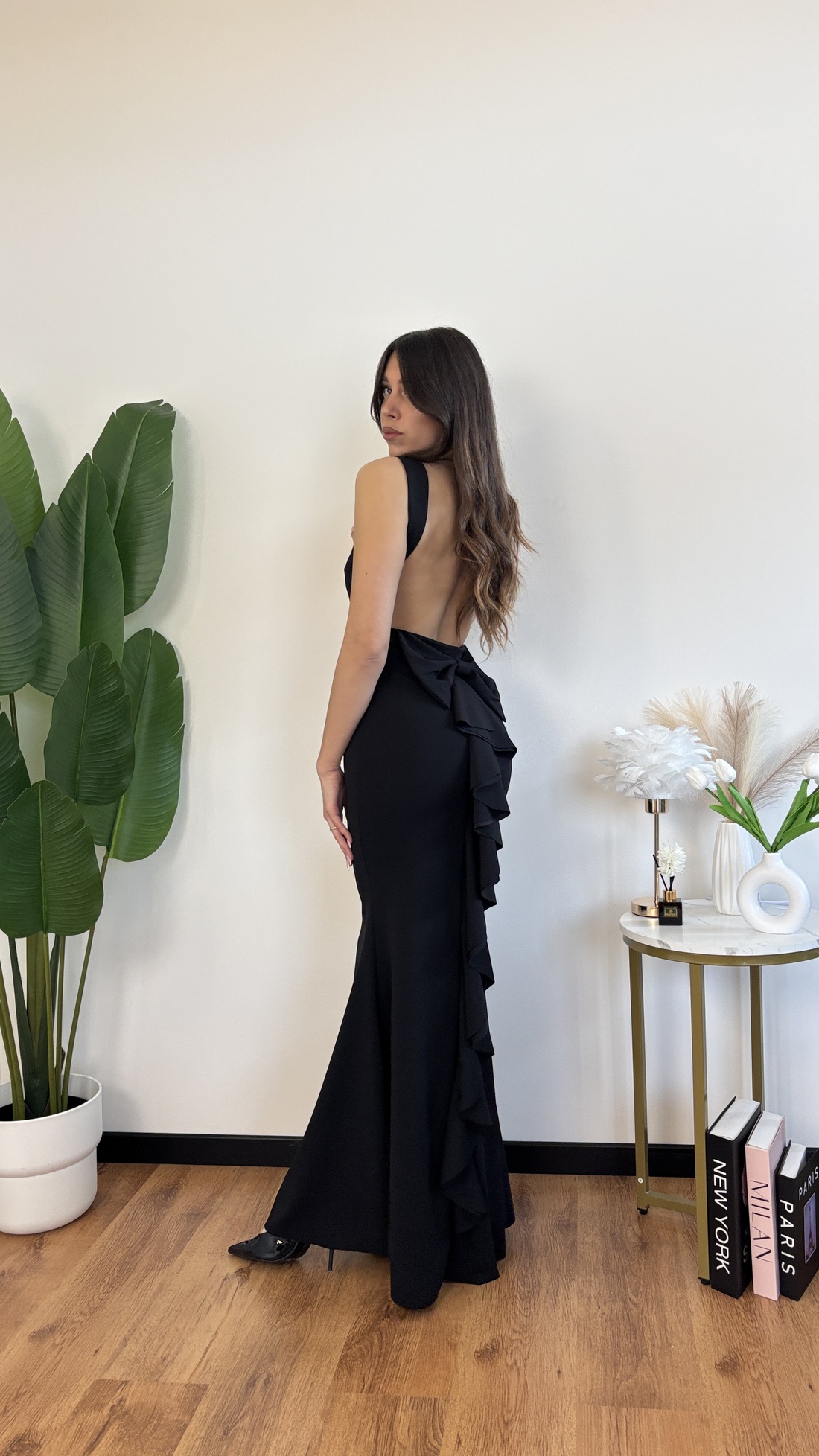 Abito lungo con schiena nuda e fiocco sul dietro.