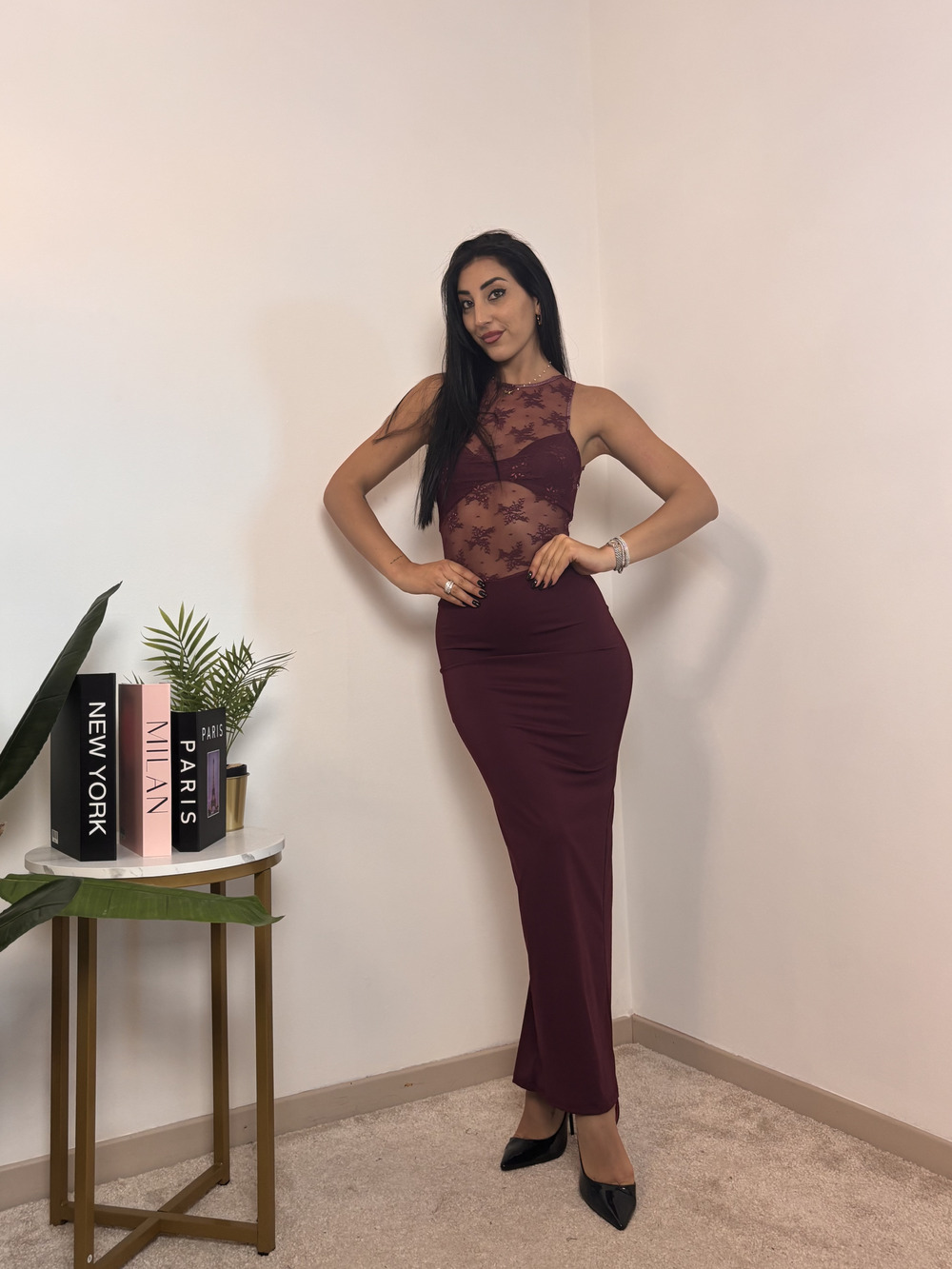Abito lungo con coppette imbottite, schiena nuda, elasticizzato, con spacco sul retro.