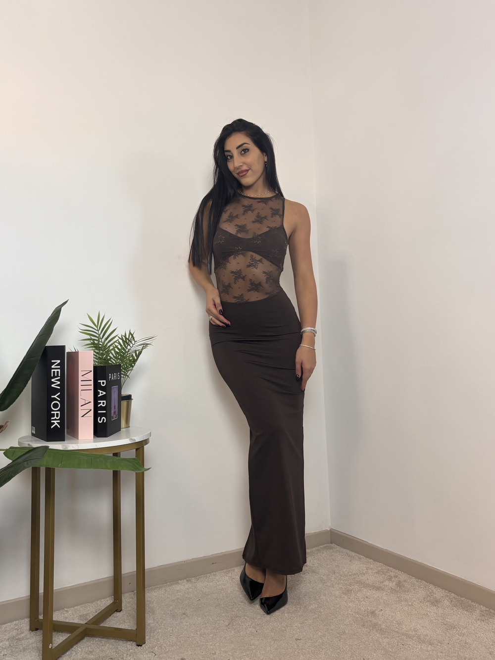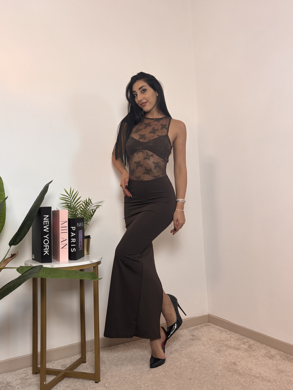 Abito lungo con coppette imbottite, schiena nuda, elasticizzato, con spacco sul retro.