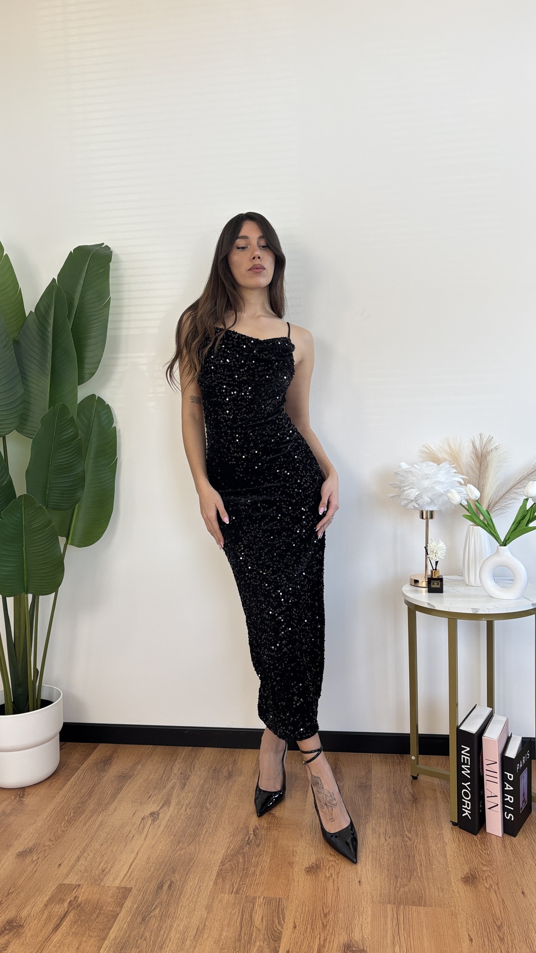 Abito lungo in velluto con paillettes, schiena nuda arricciato sul dietro, spalline con lacci regolabili.