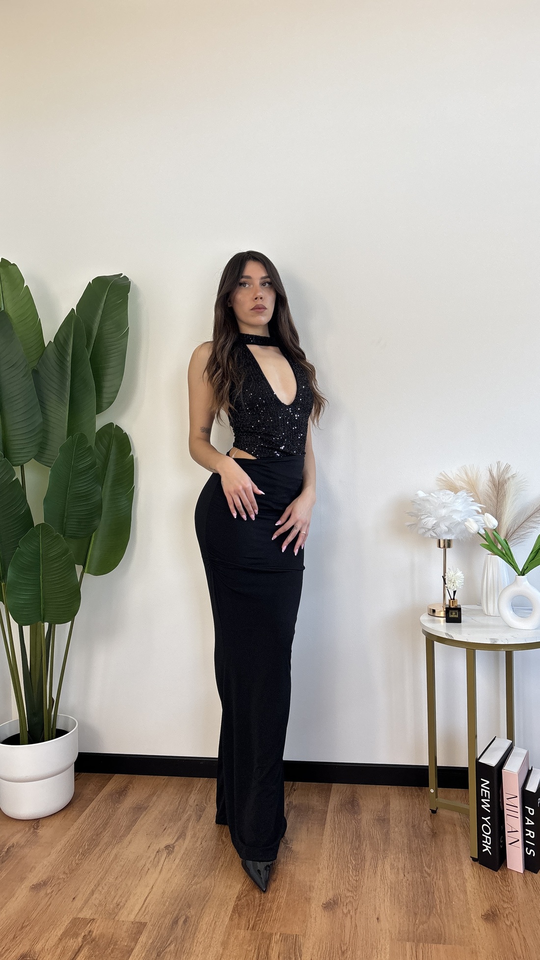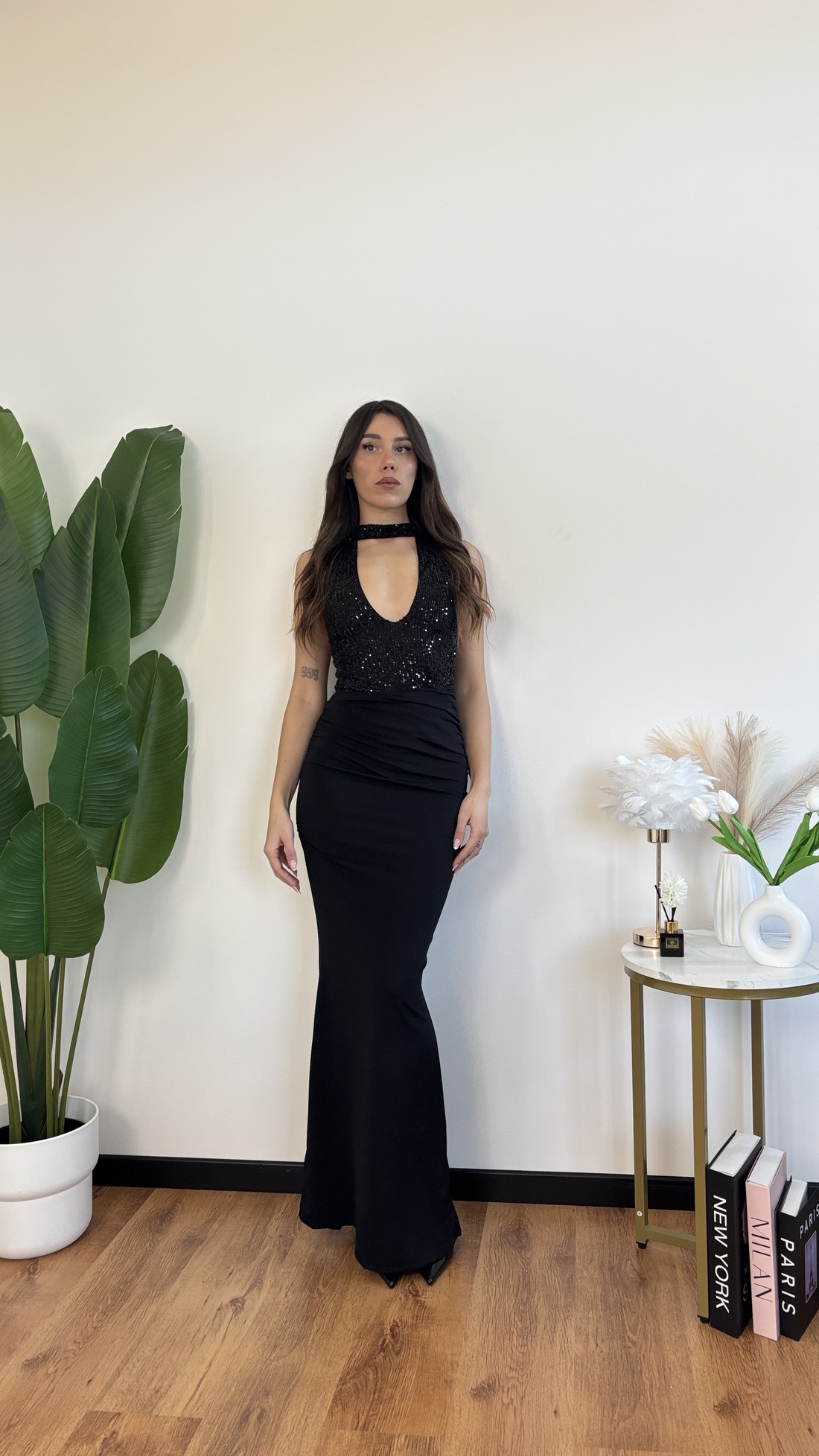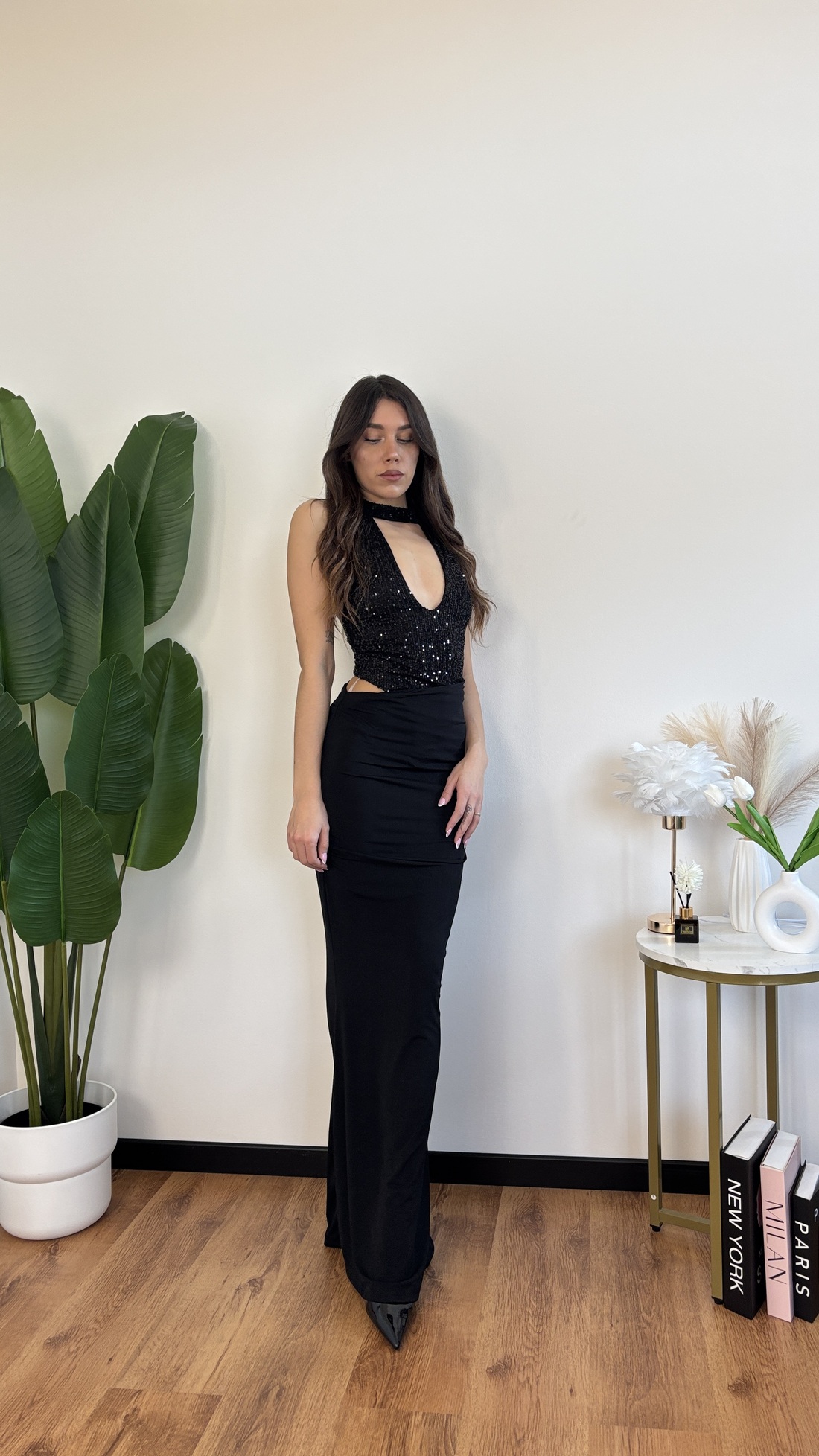 Abito lungo con scollo all’americana, cut out laterale, schiena nuda.