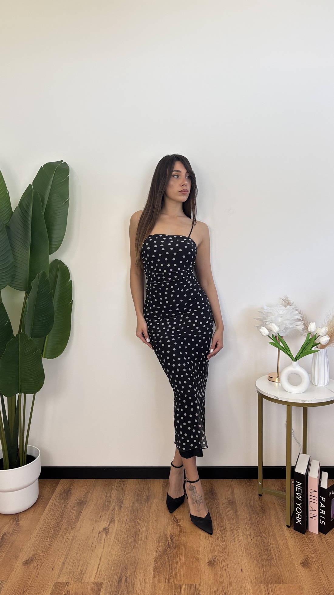 modello con tulle a pois e sottoveste.