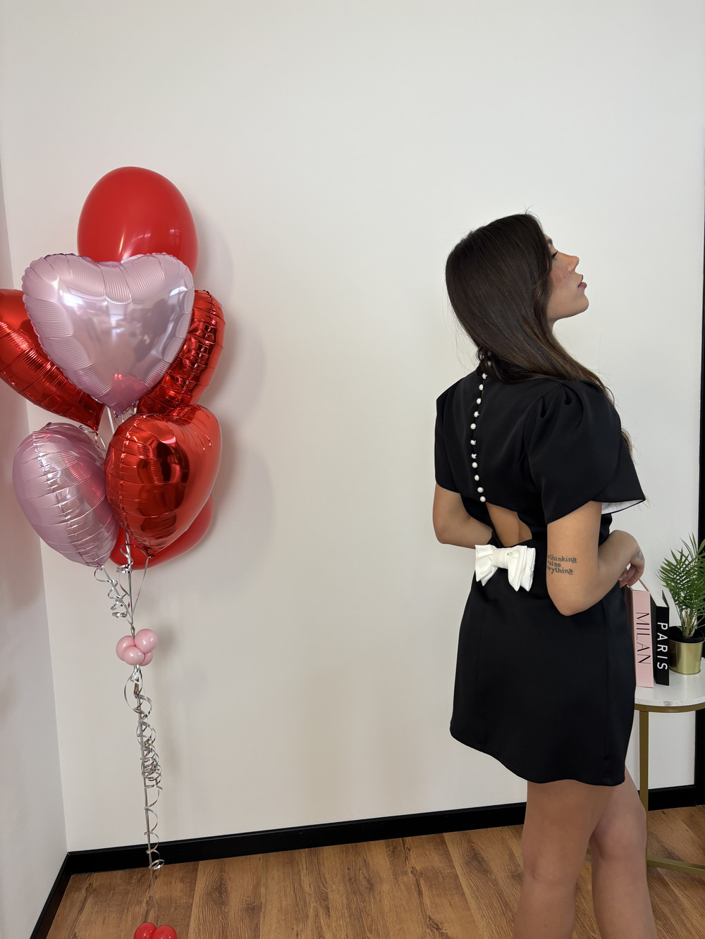 Dettaglio con fiocco bianco e bottoncini perlati sul dietro.