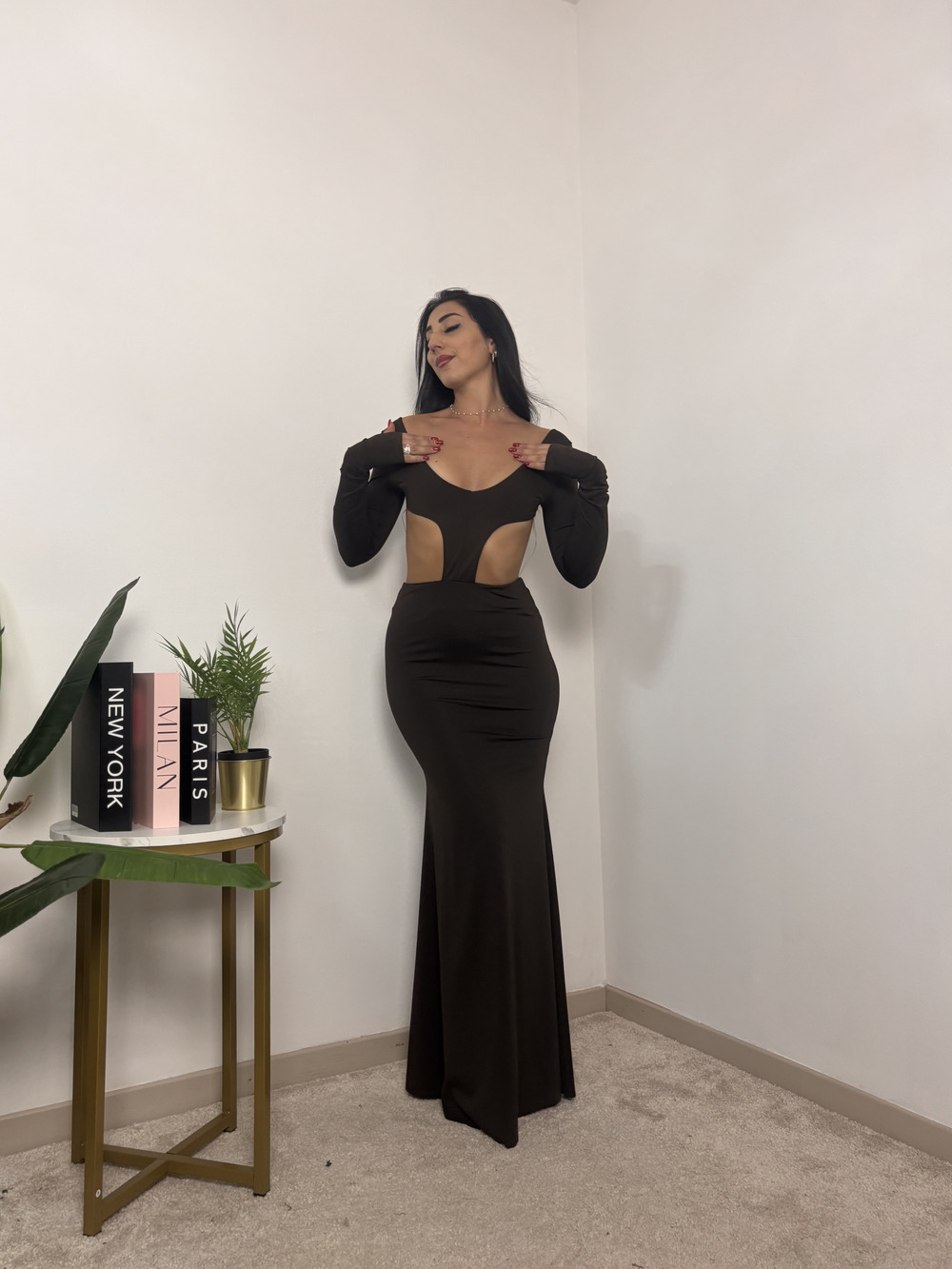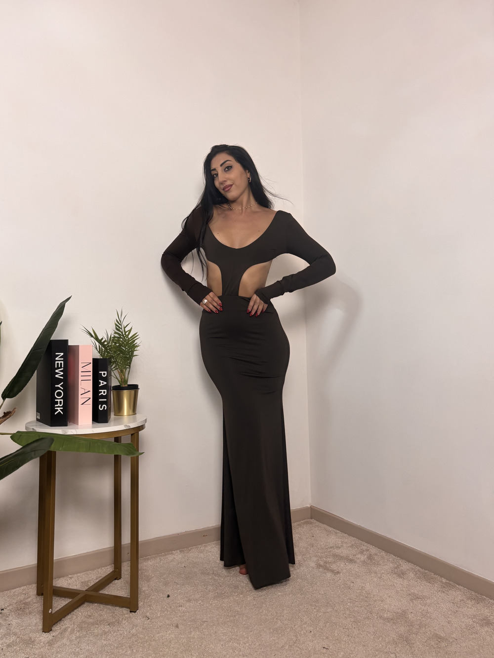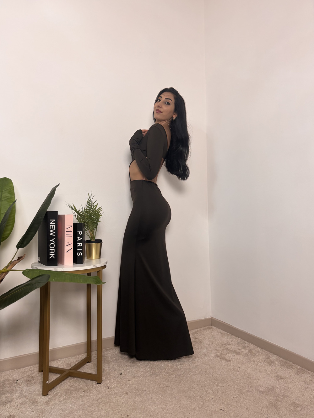 Modello a manica lunga, con maxi cut out e schiena scoperta.