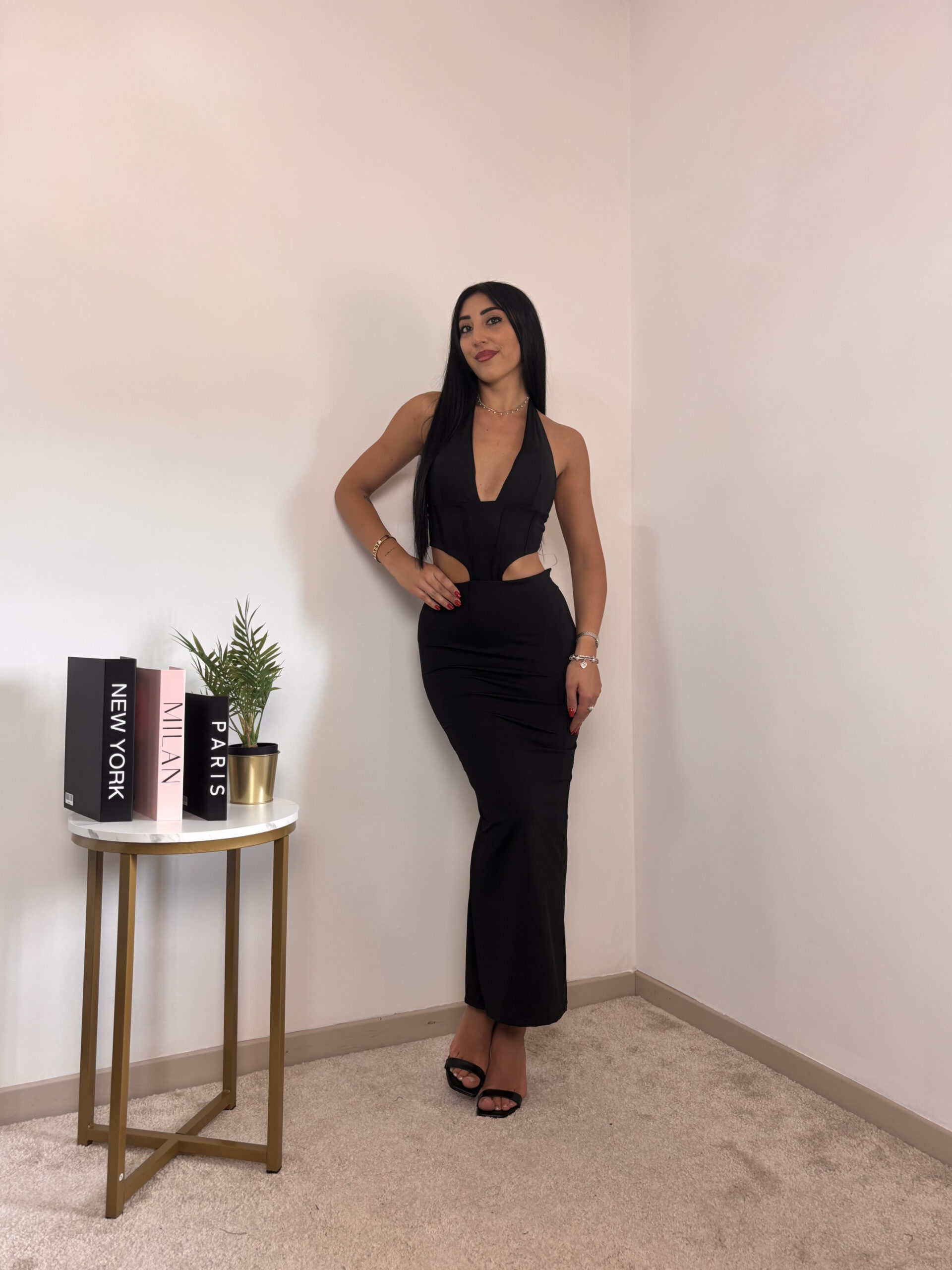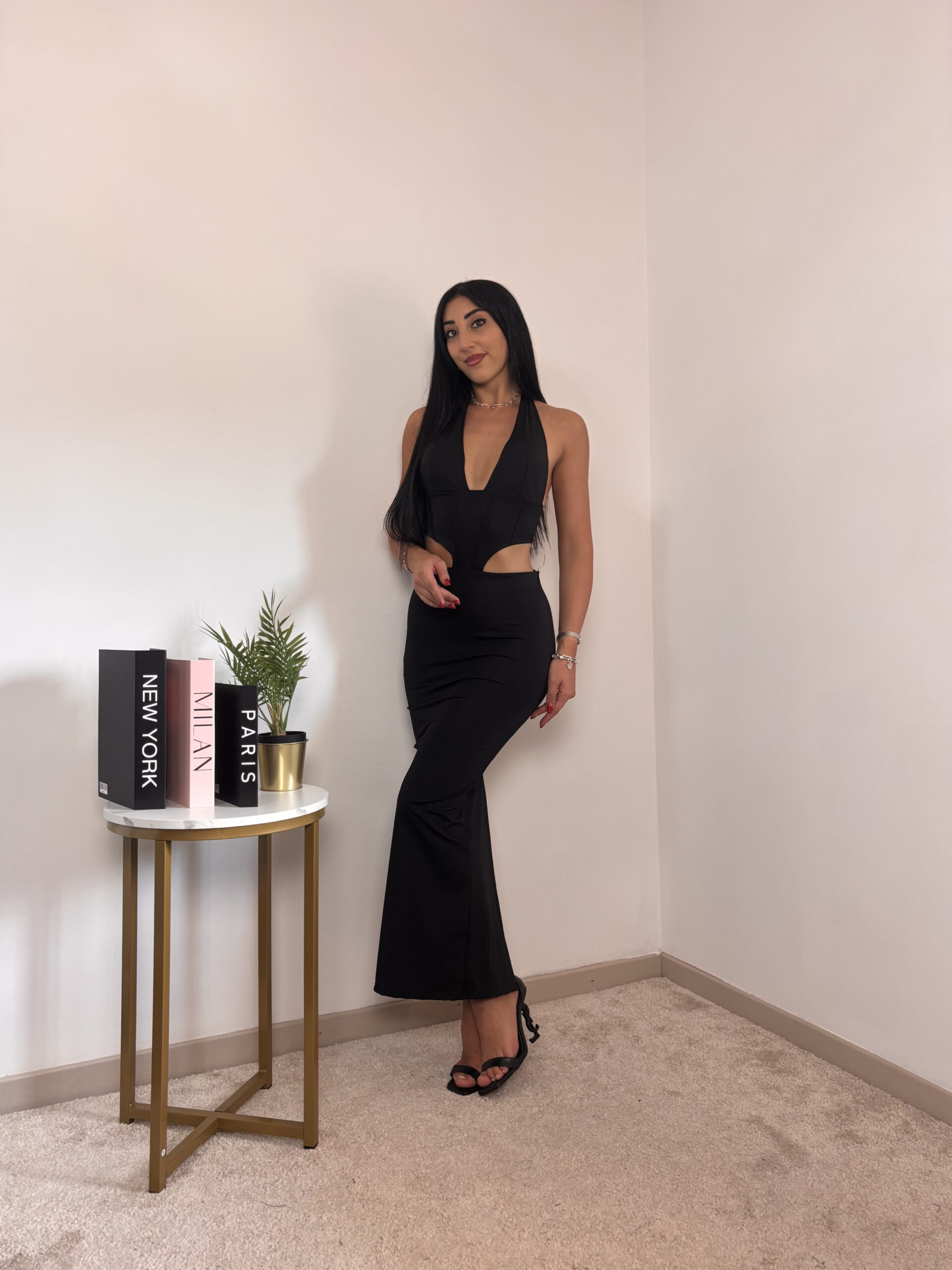 Abito lungo con coppe, aperto lateralmente e spacco sul retro.