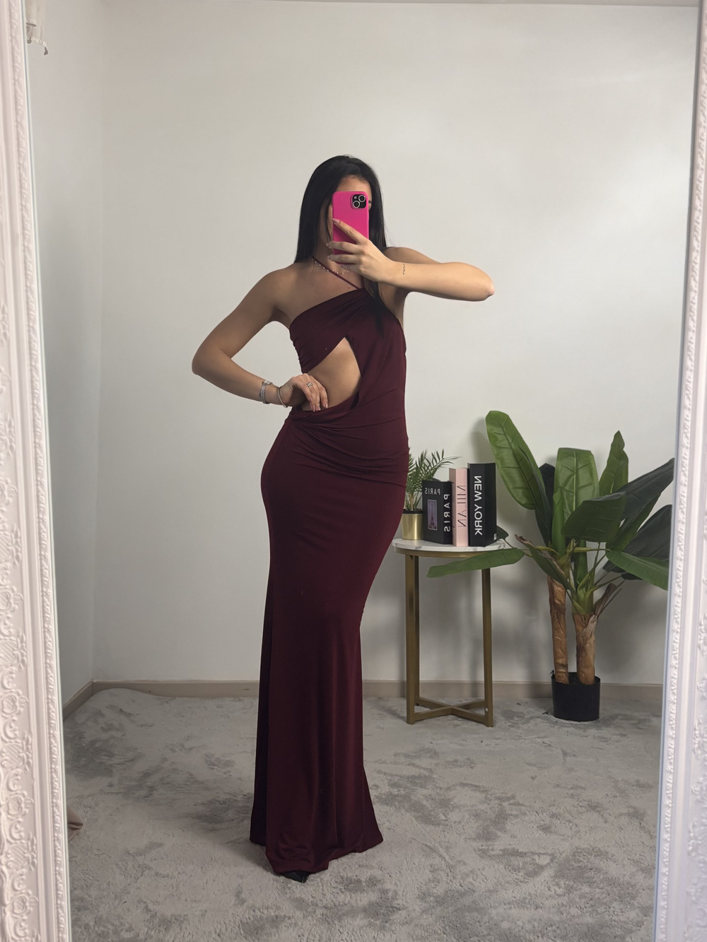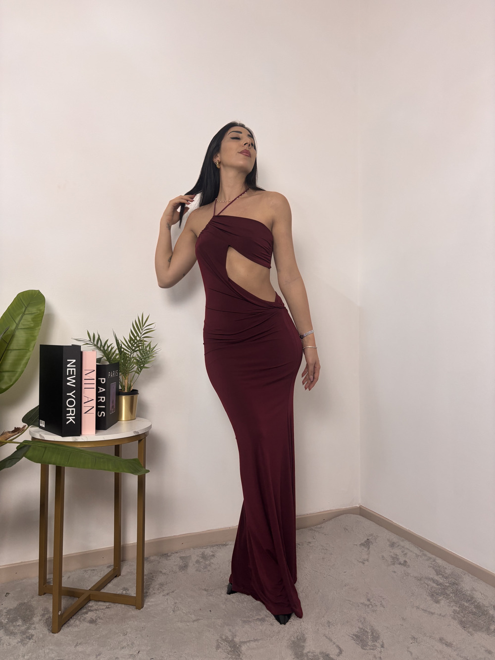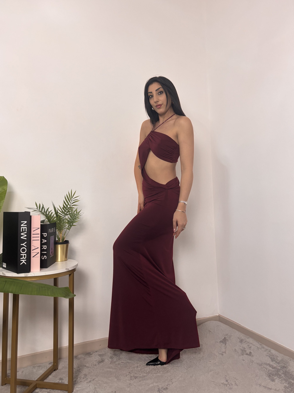 Abito lungo con cut out laterale e con laccio obliquo.