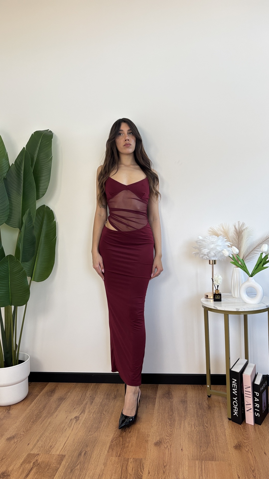 Abito lungo con voile trasparente sulla pancia e cut out laterale, spacco sul dietro.