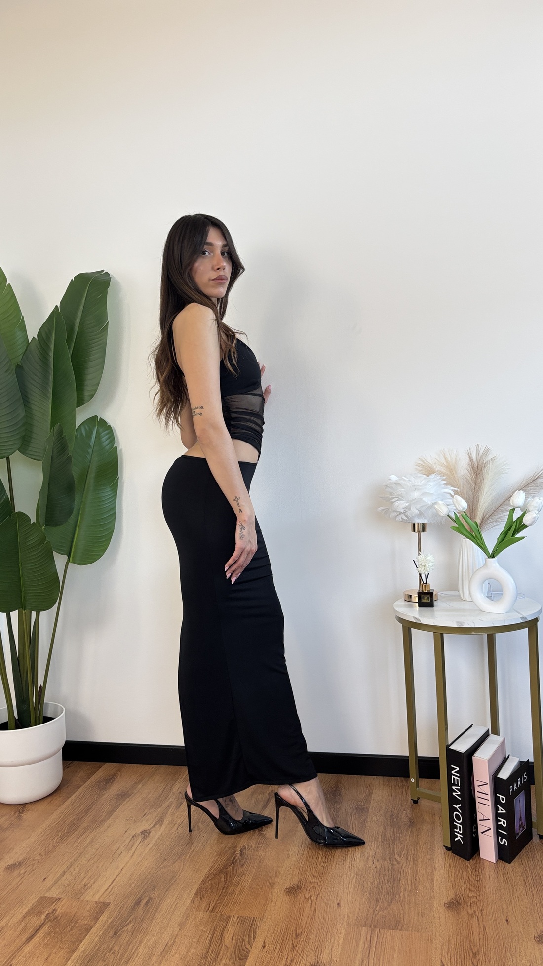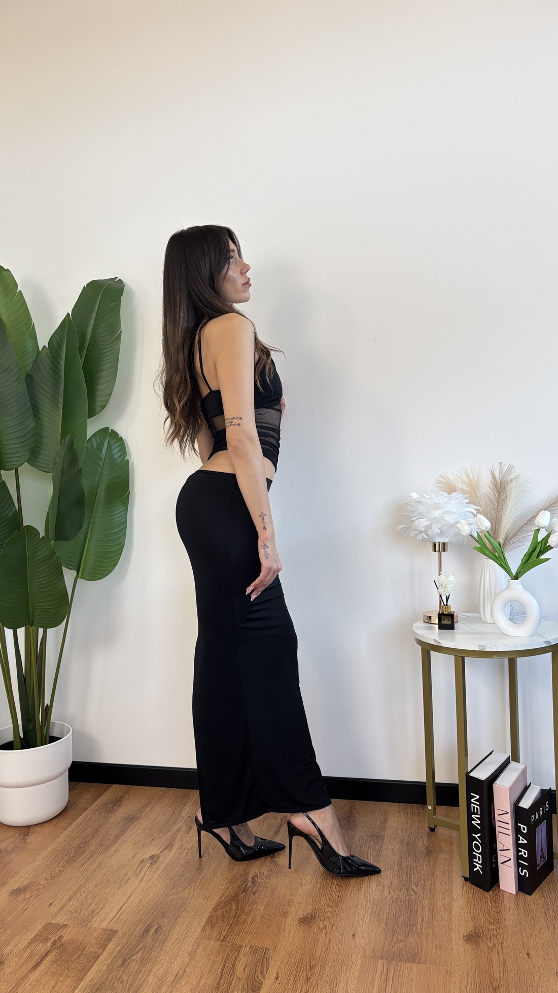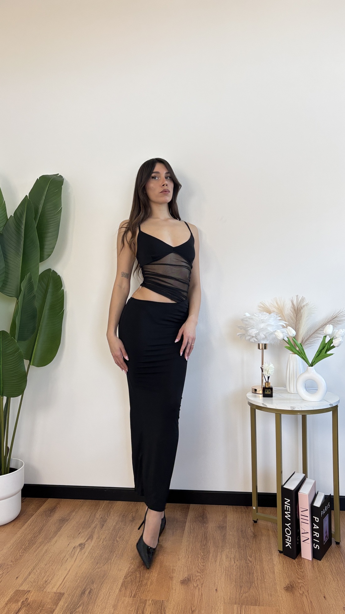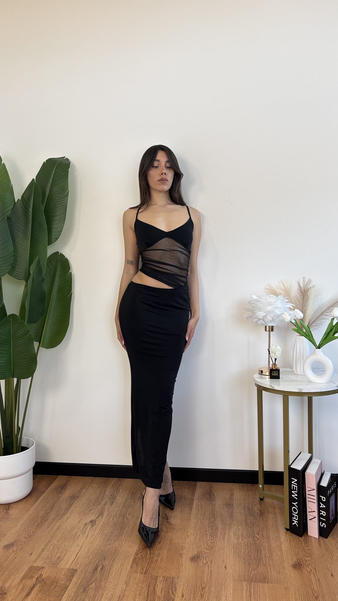 Abito lungo con voile trasparente sulla pancia e cut out laterale, spacco sul dietro.