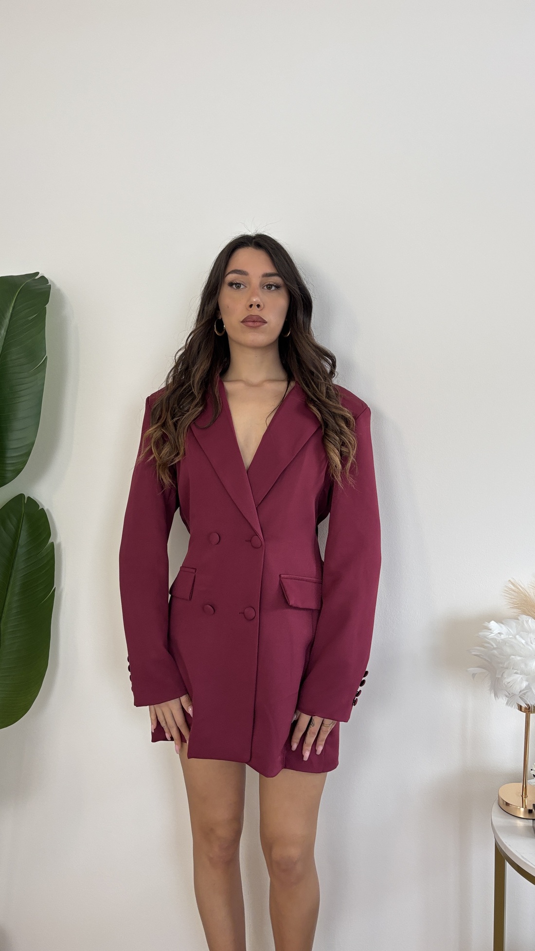 Abito a Blazer doppiopetto con cinta per stroncatura regolabile dietro.