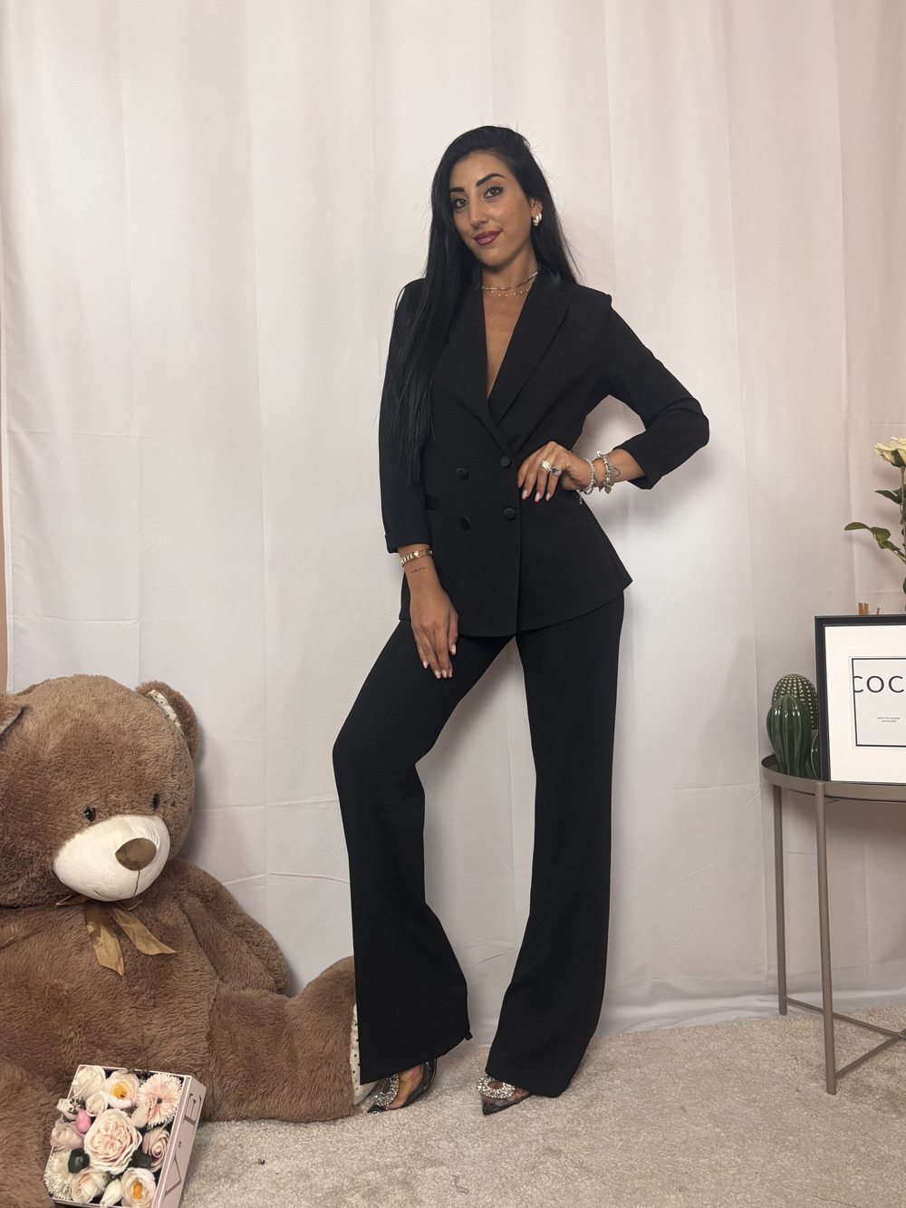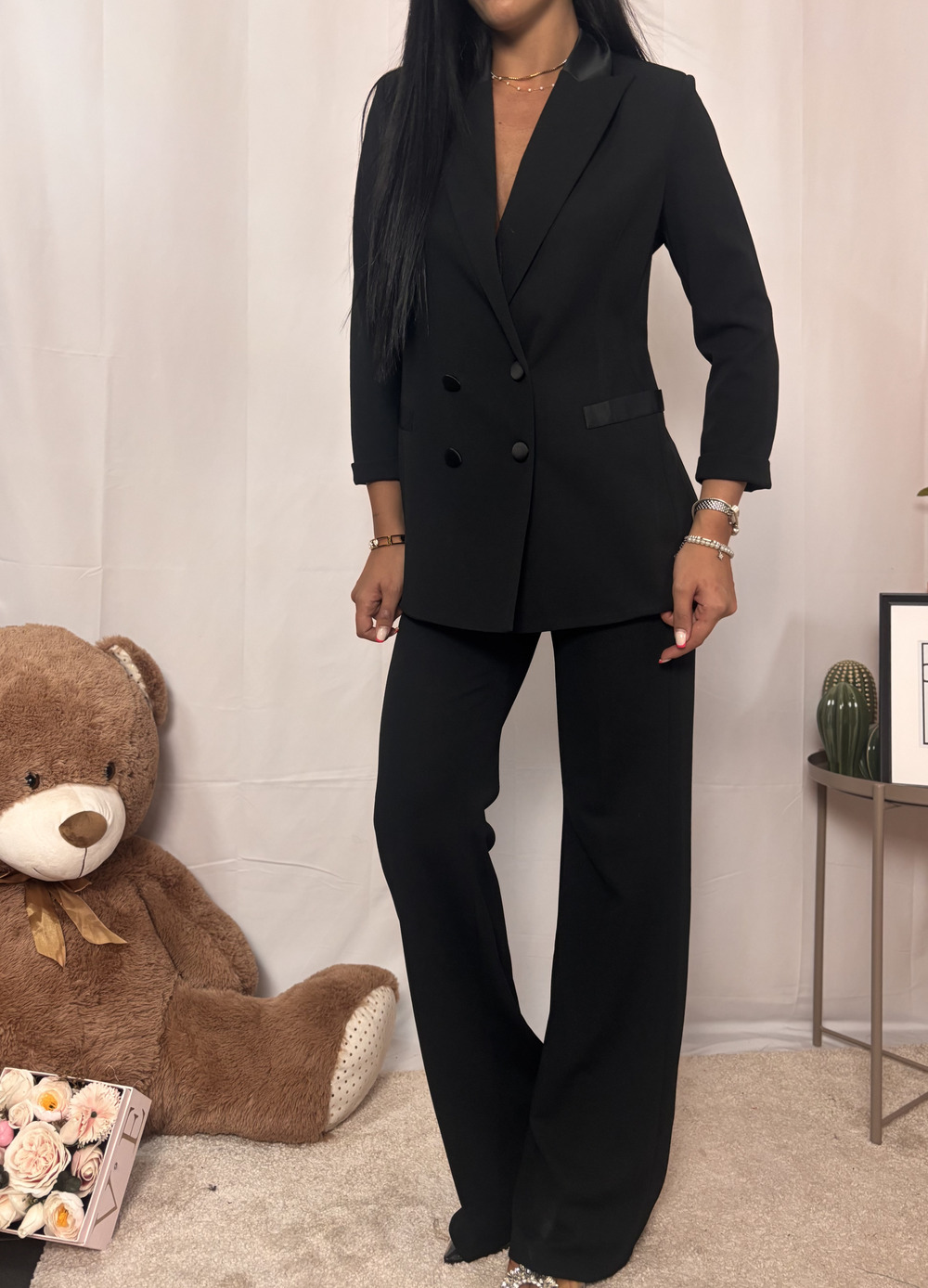 Blazer nero doppio petto con dettagli in simil raso.
