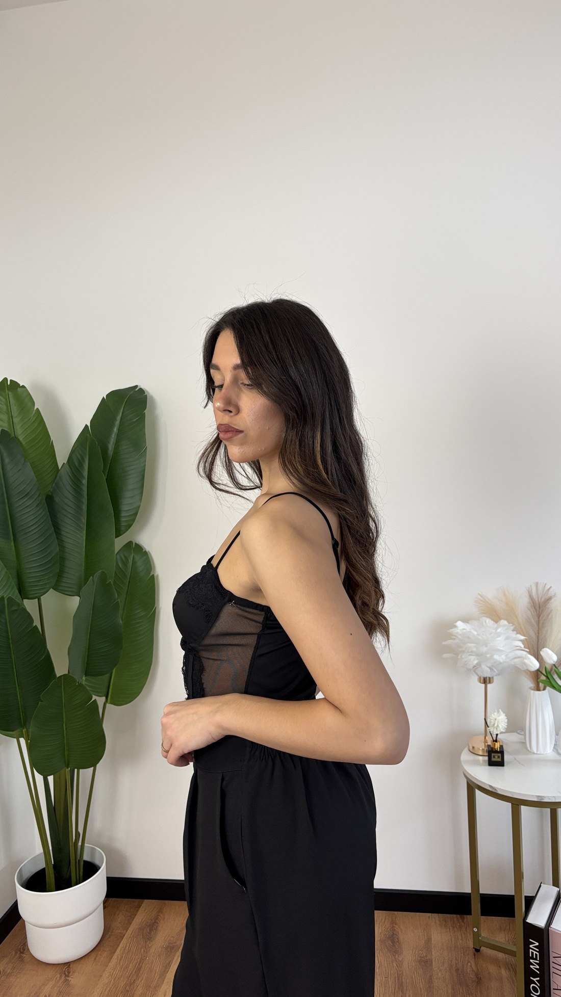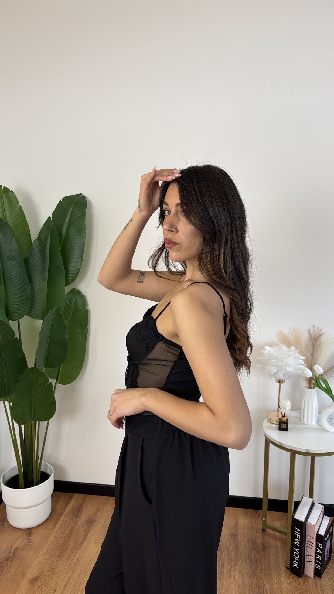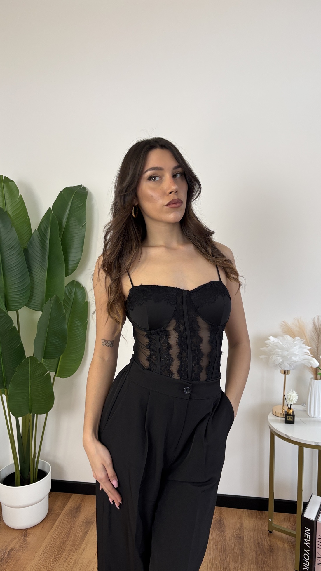 Body in pizzo nero, modello con coppe preformate e spalline regolabili.