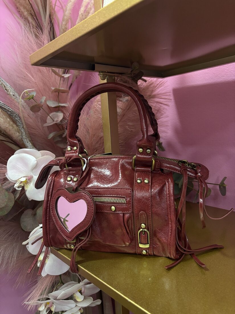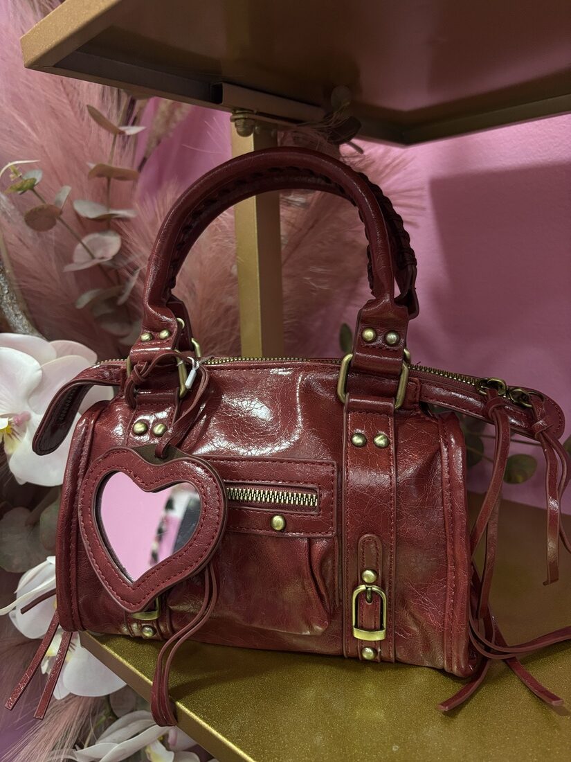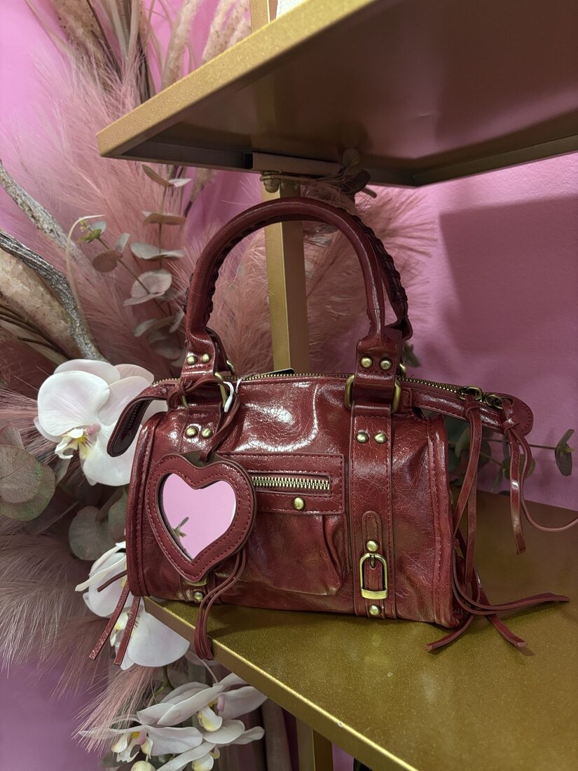 Borsa bordeaux con pecchietto a cuore e tracolla inclusa.