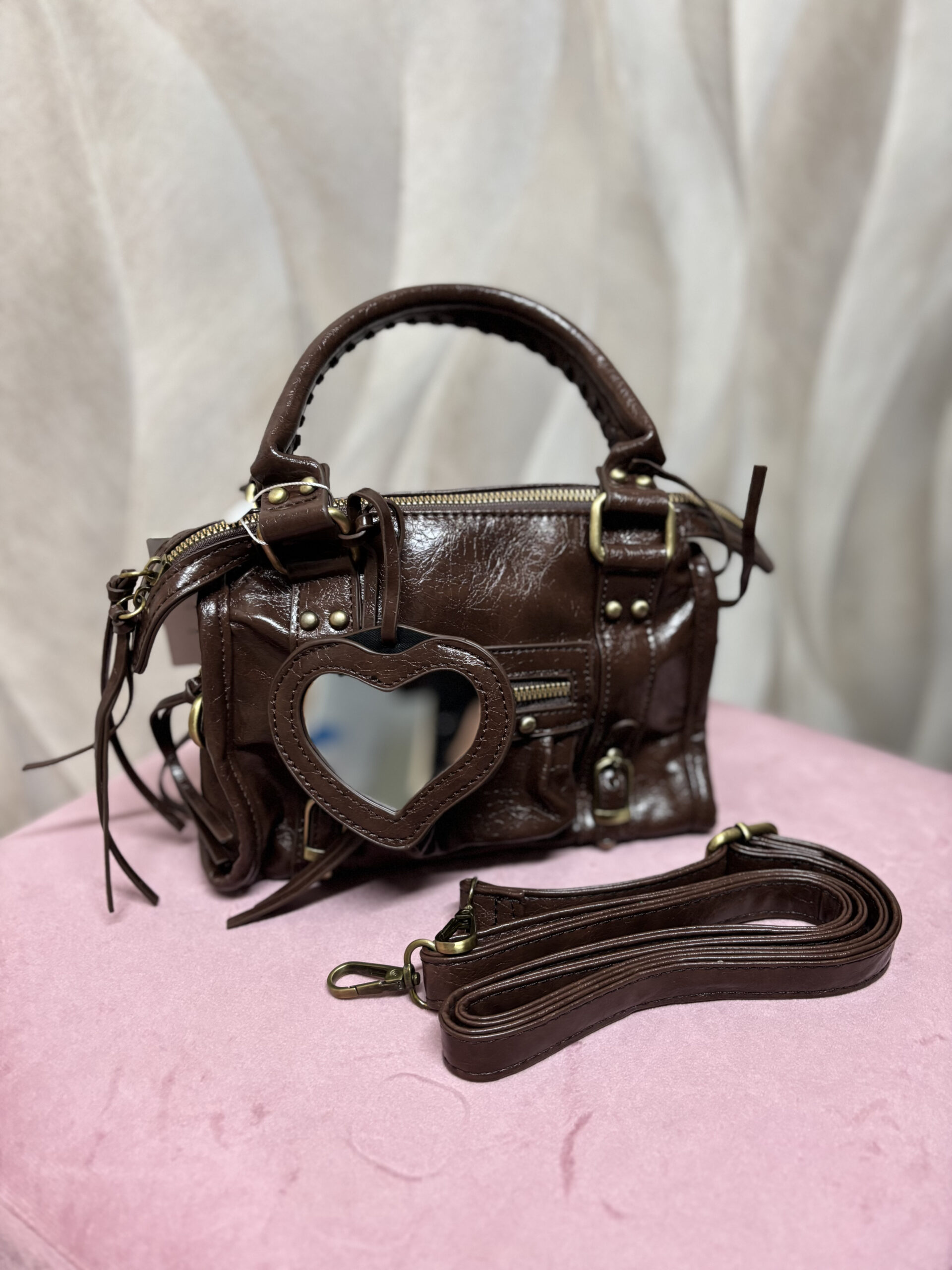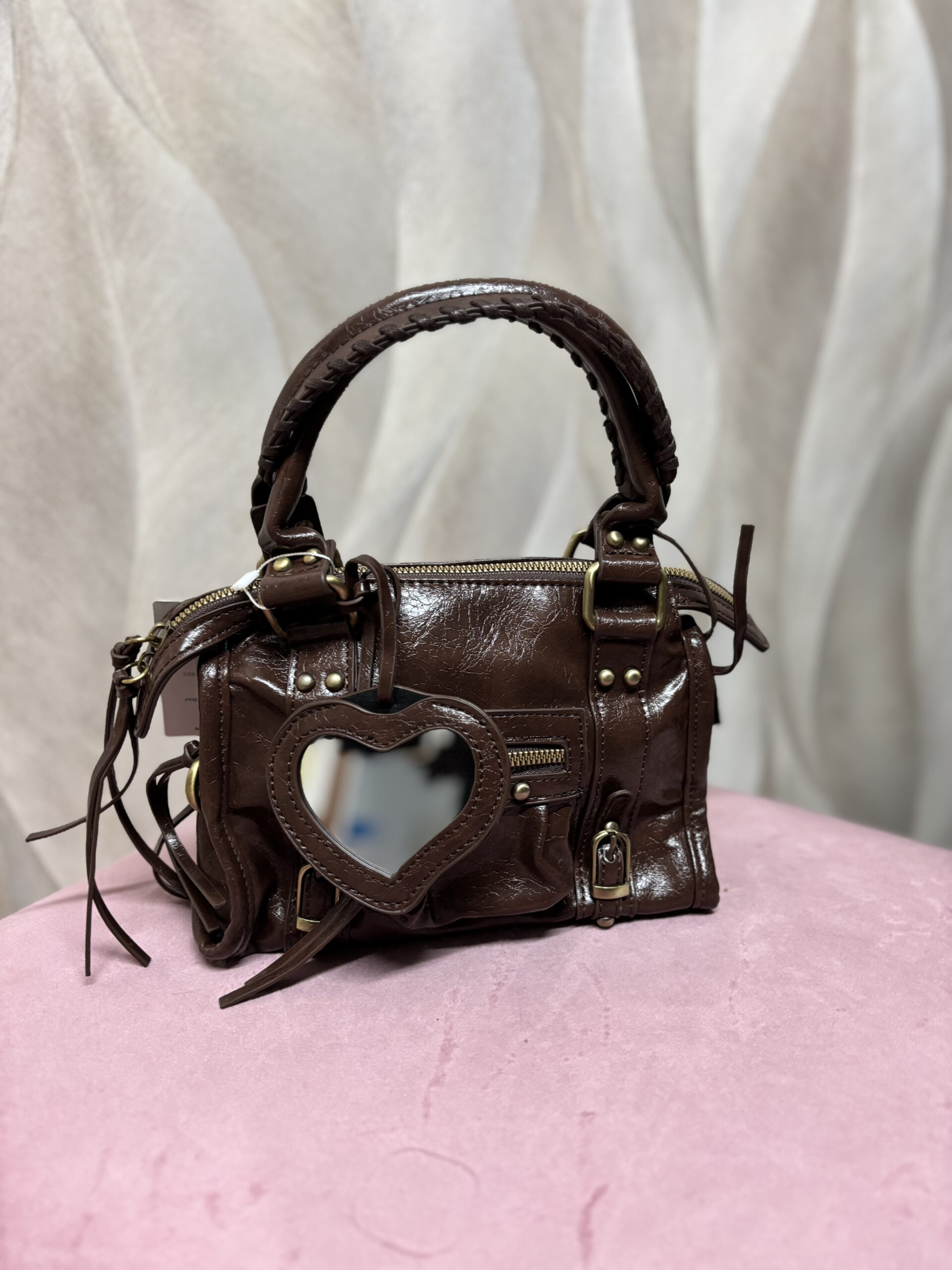 Borsetta con zip e charm a specchietto, con tracolla.