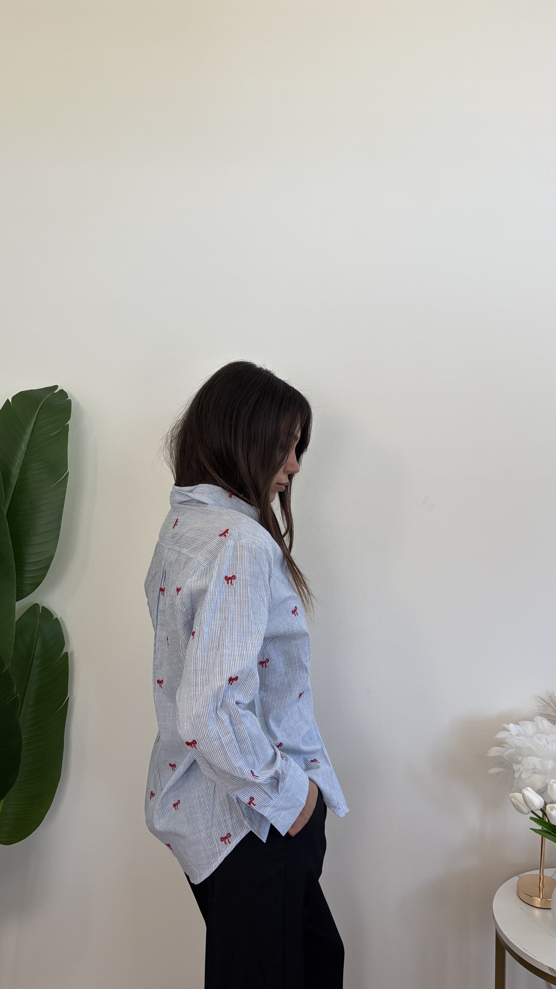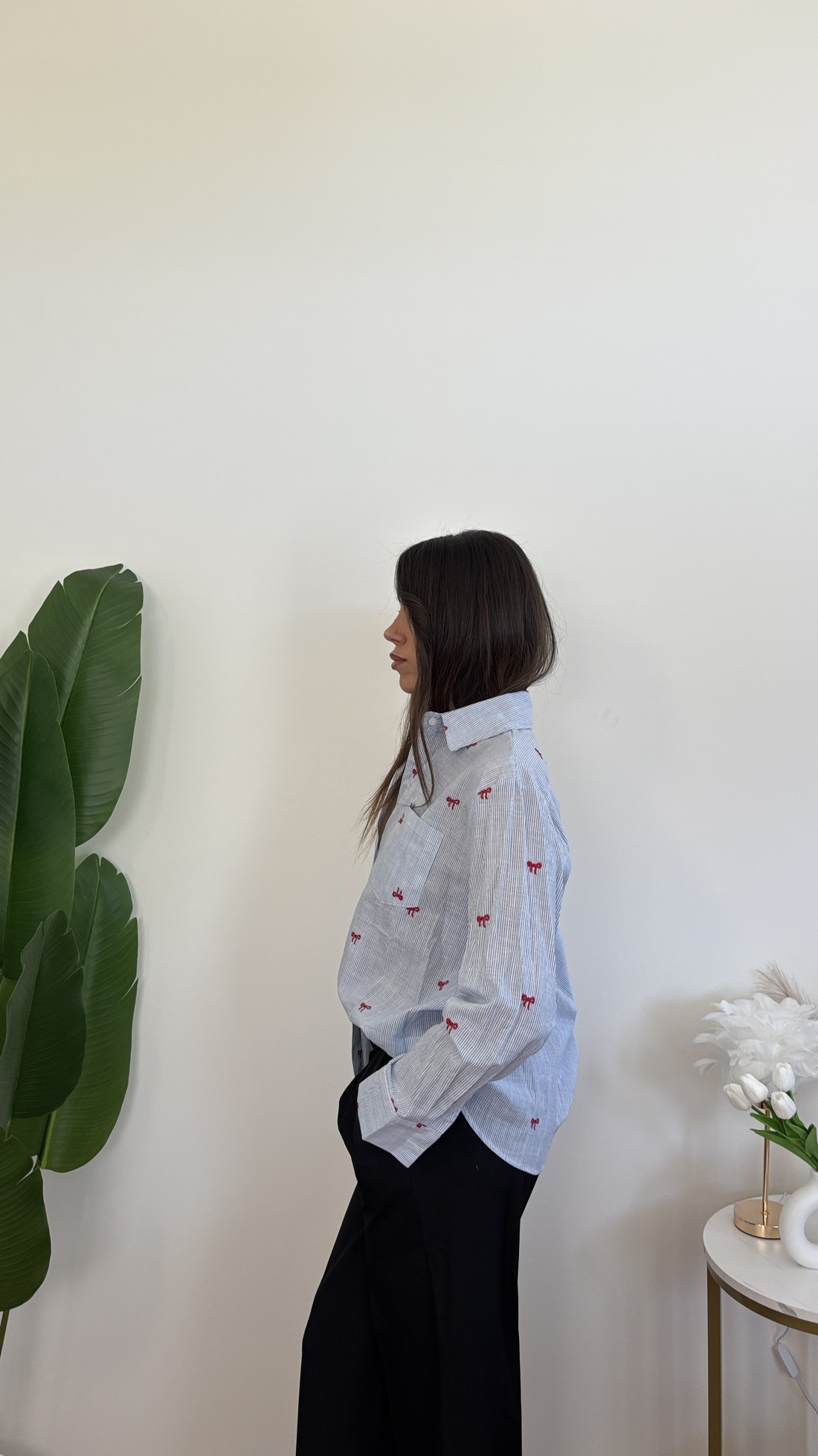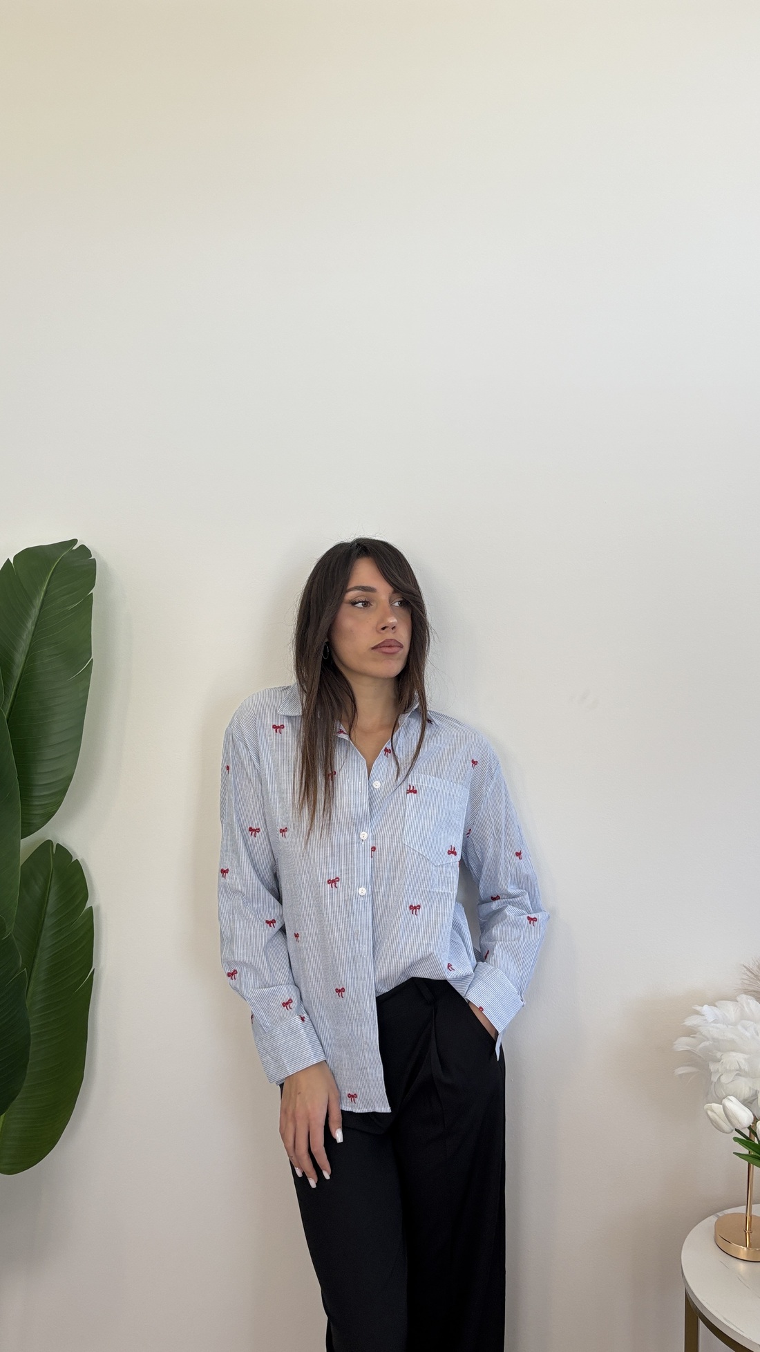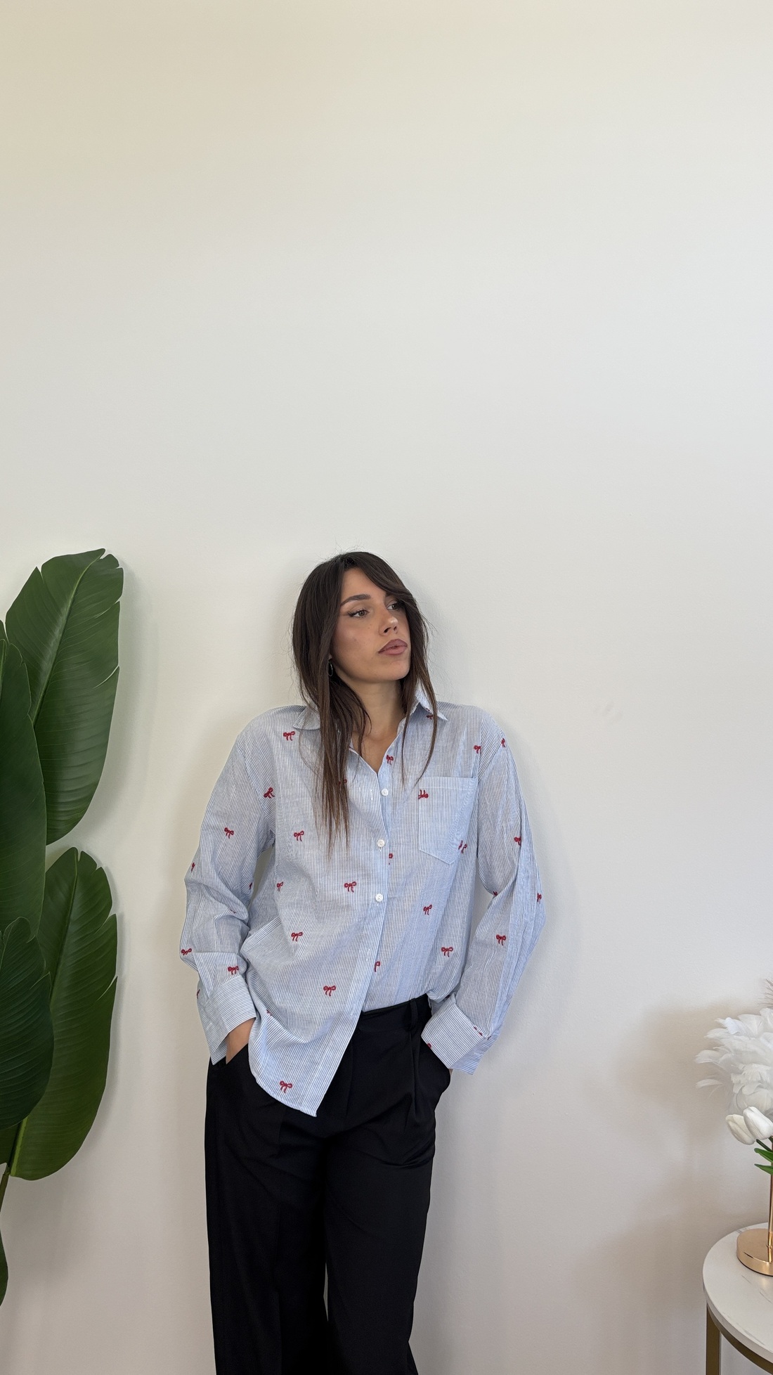 Camicia a righe azzurra, con fiocchi.