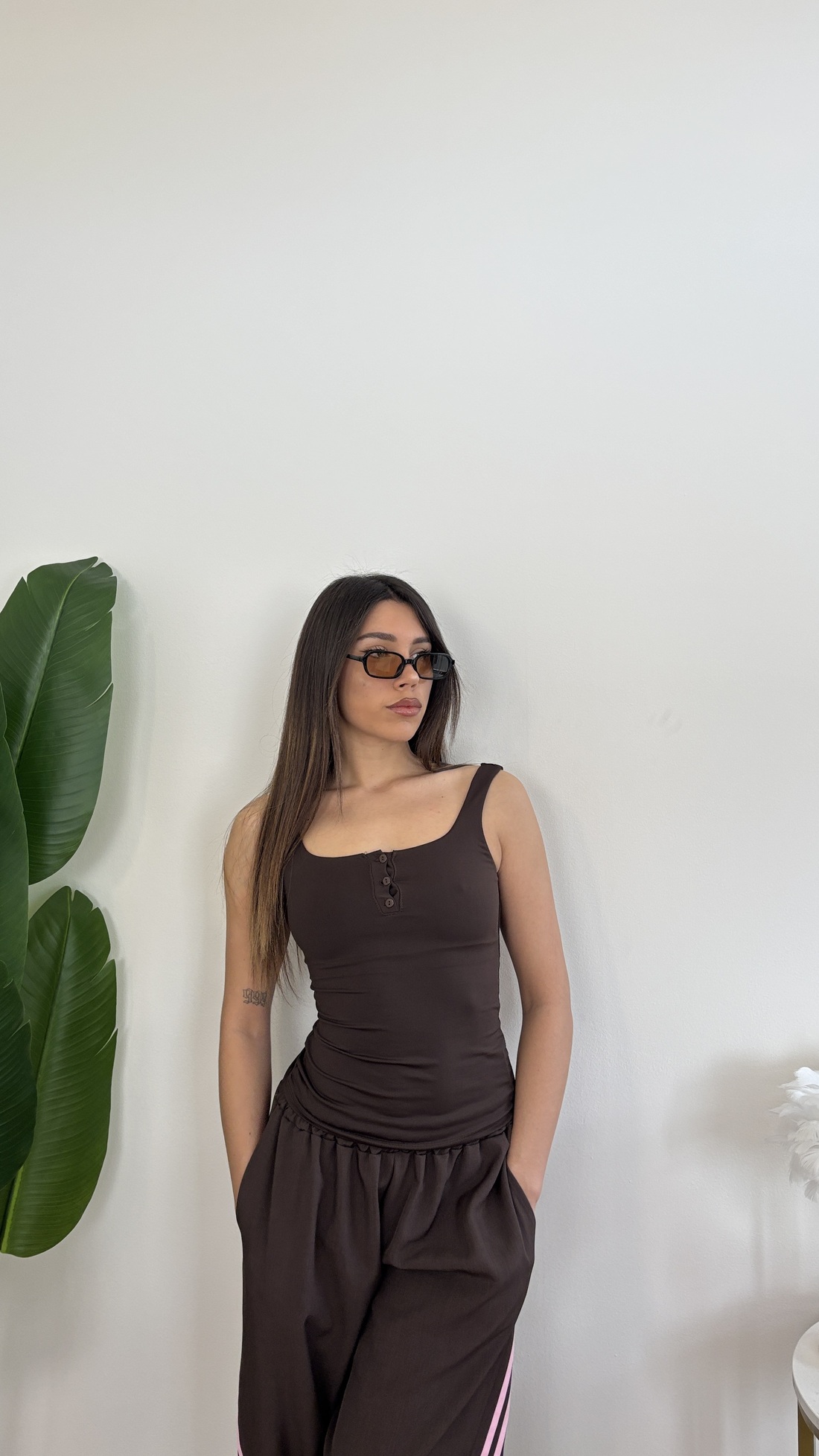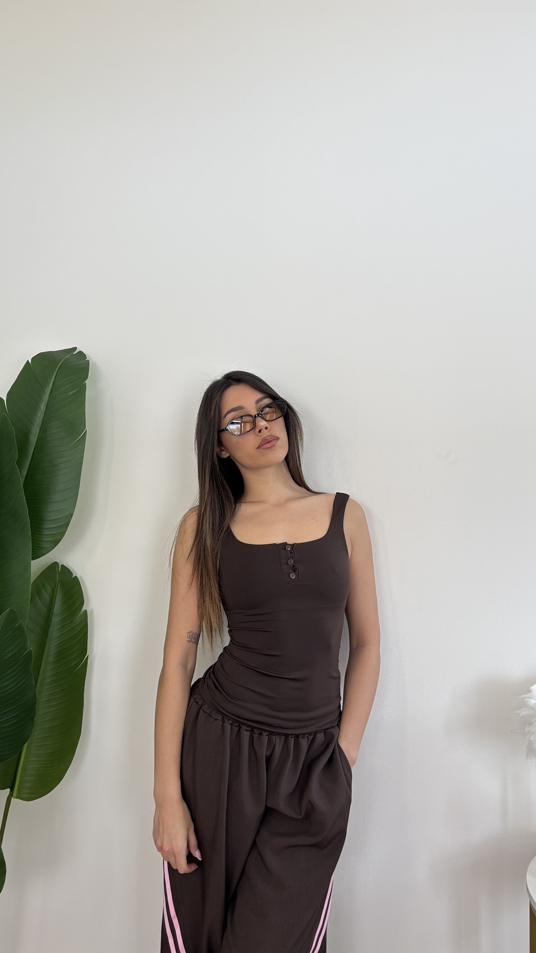 Canotta in lycra con bottoncini davanti e bretelle spesse.
