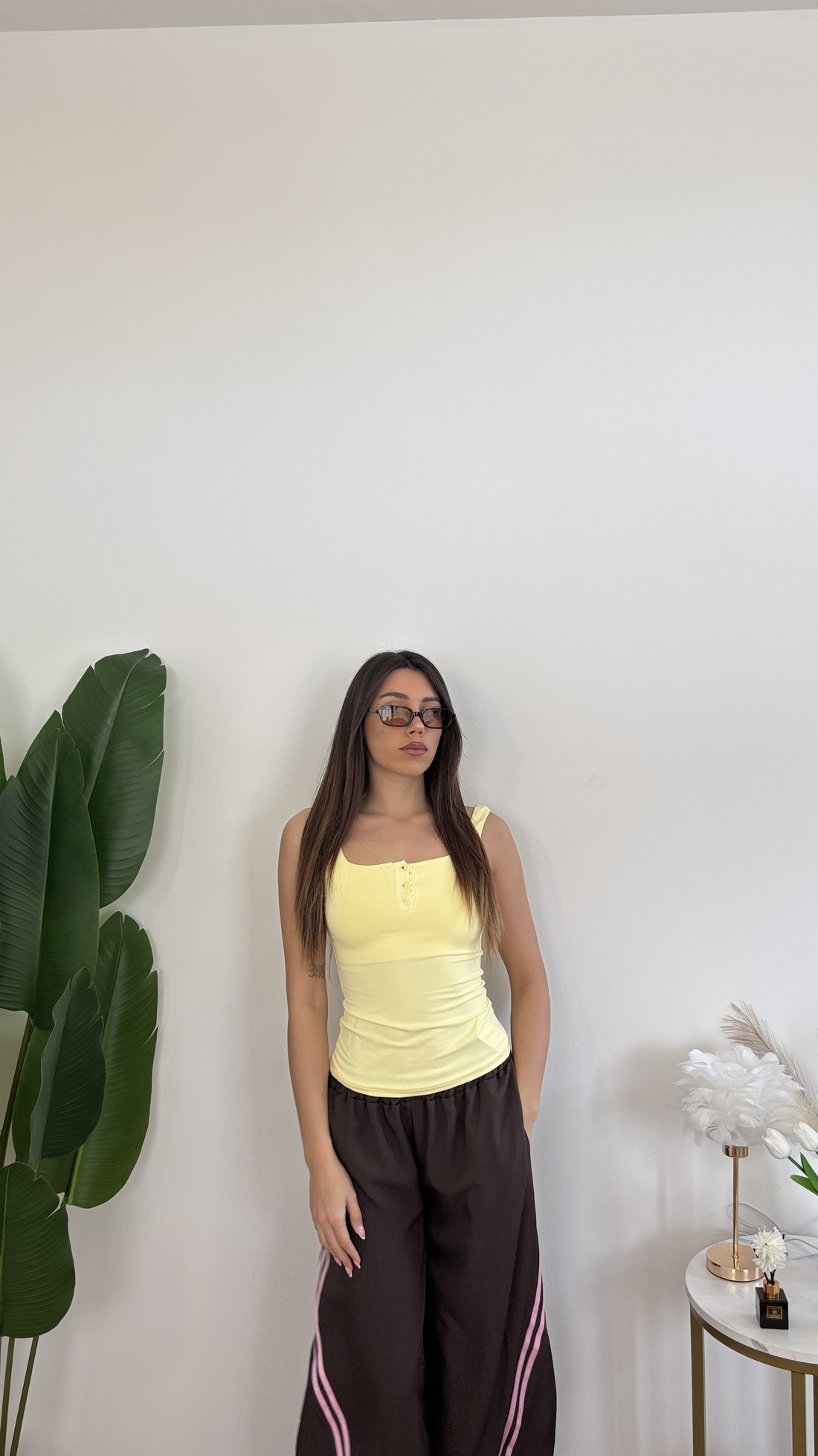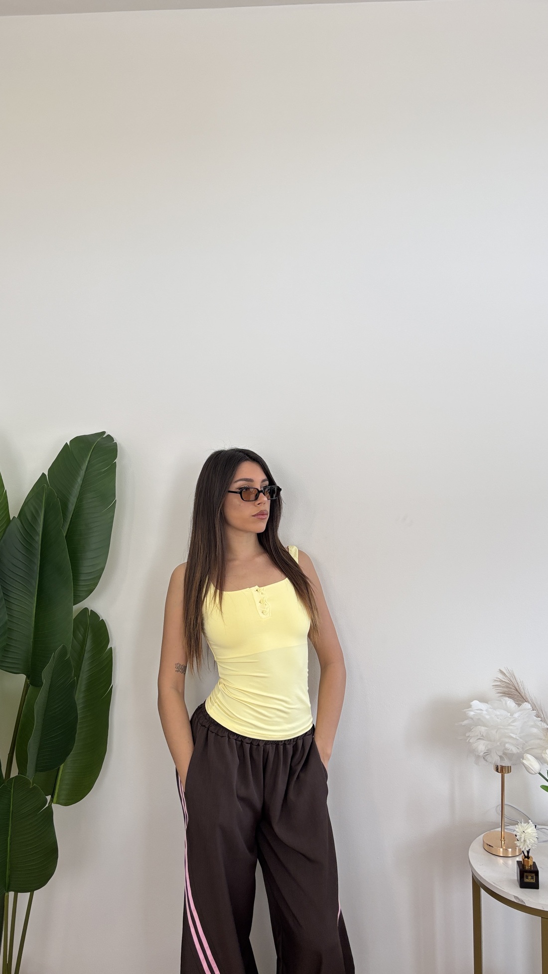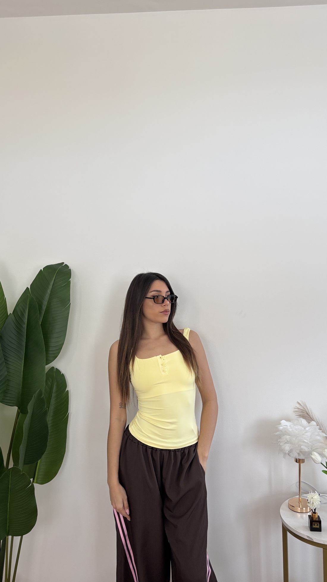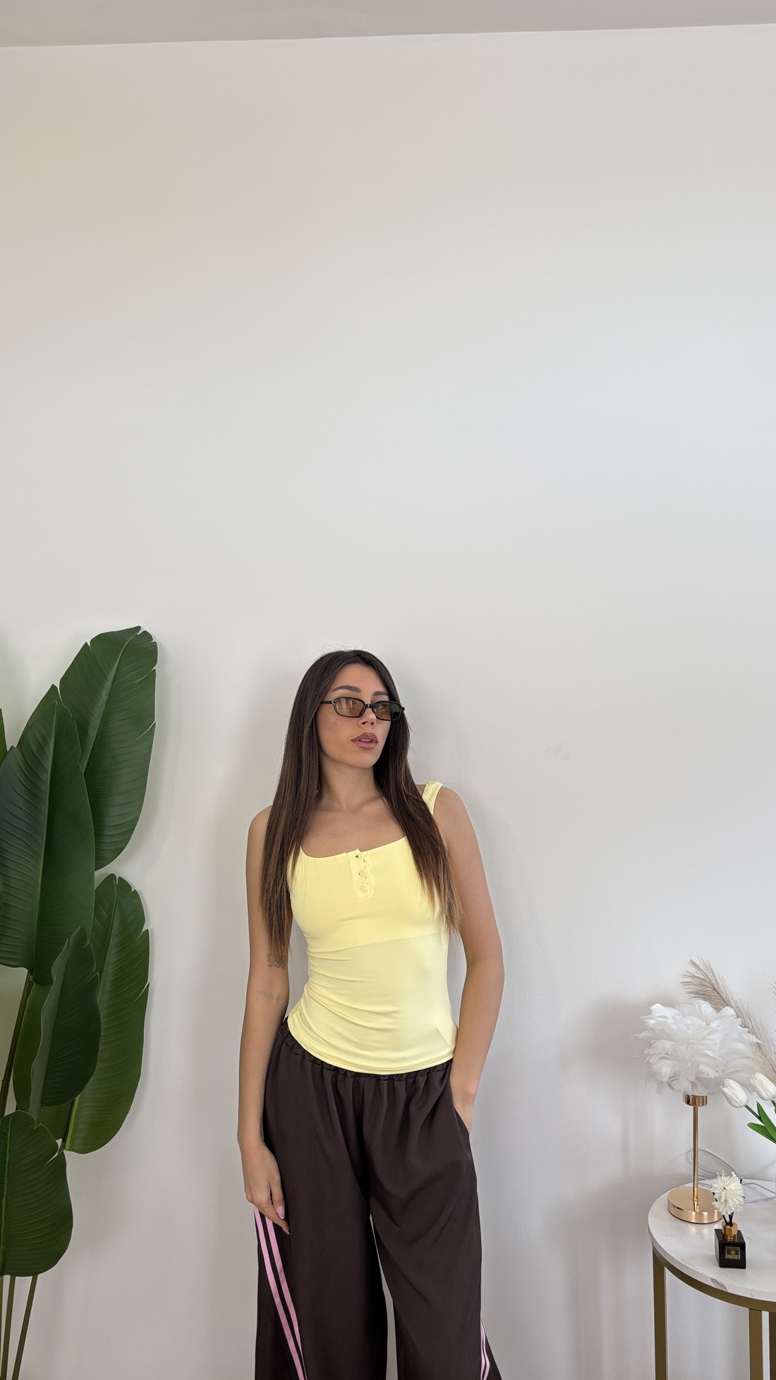Canotta in lycra con bottoncini davanti e bretelle spesse.