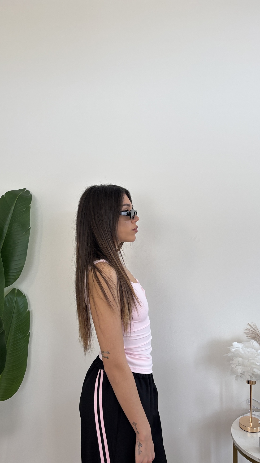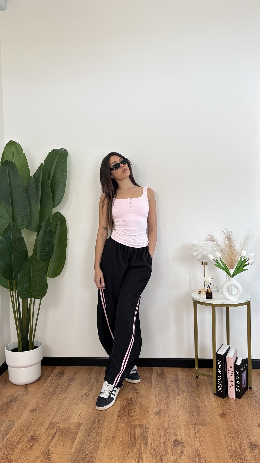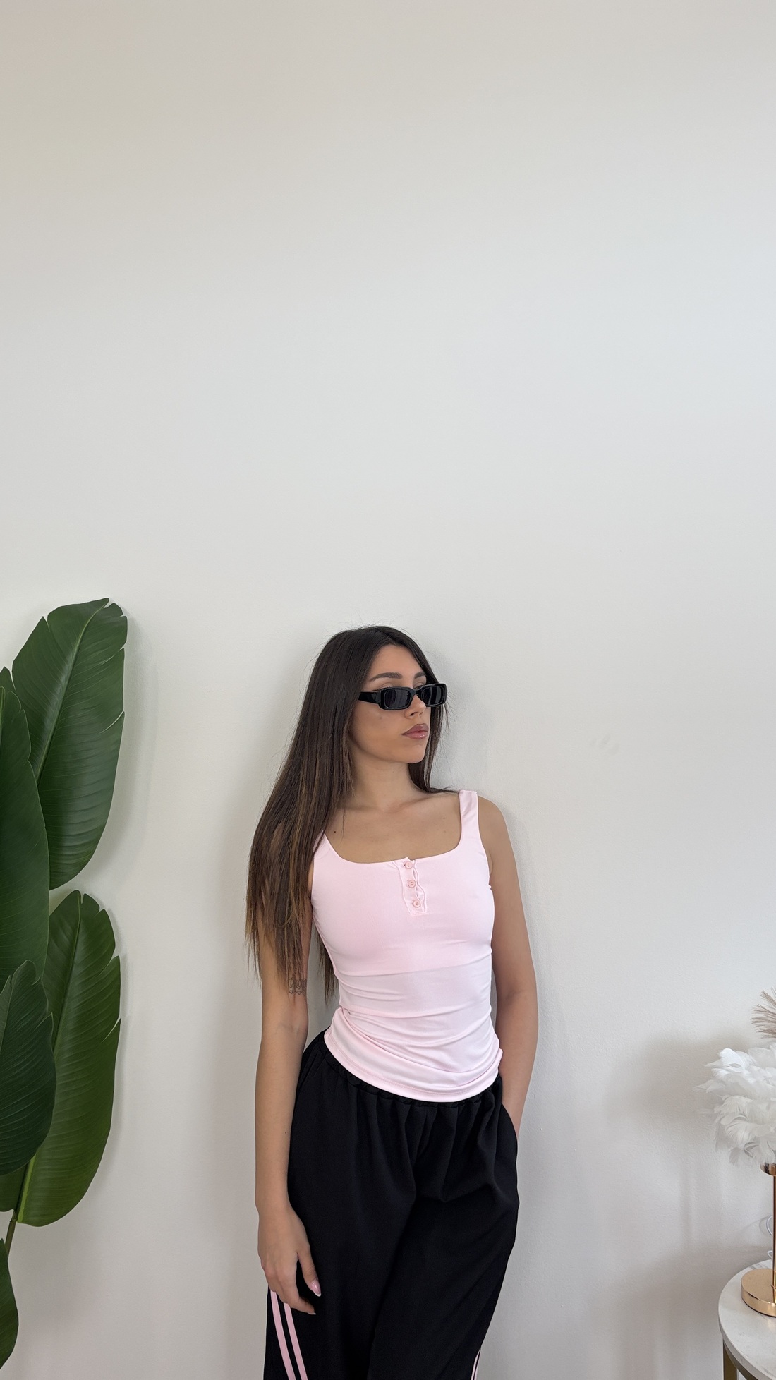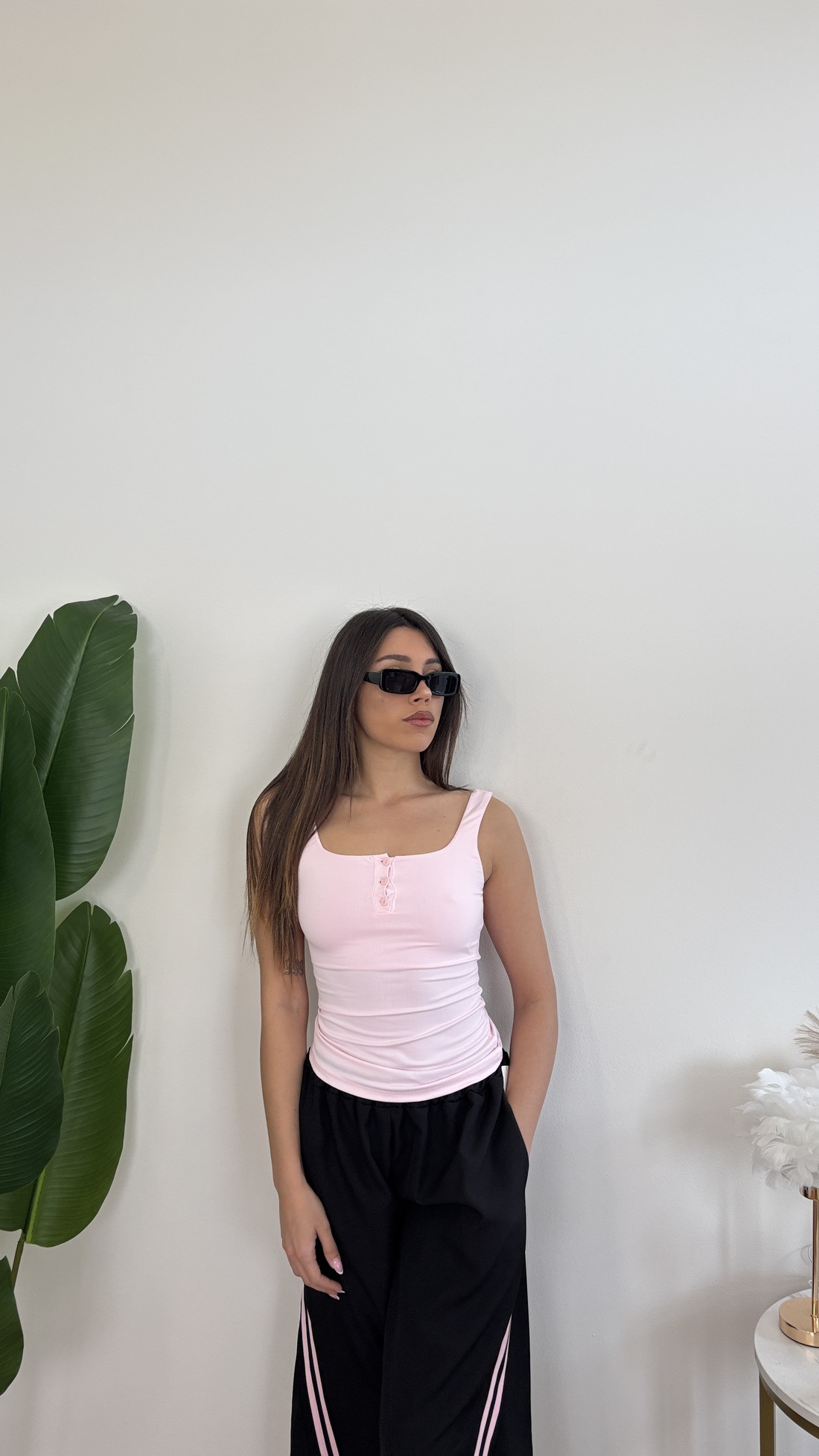 Canotta in lycra con bottoncini davanti e bretelle spesse.