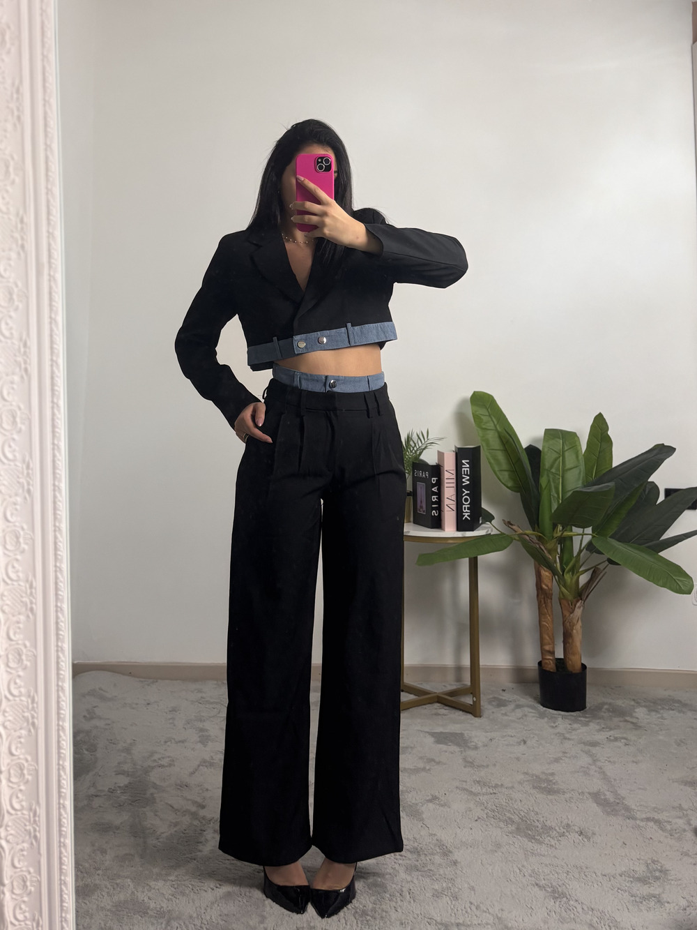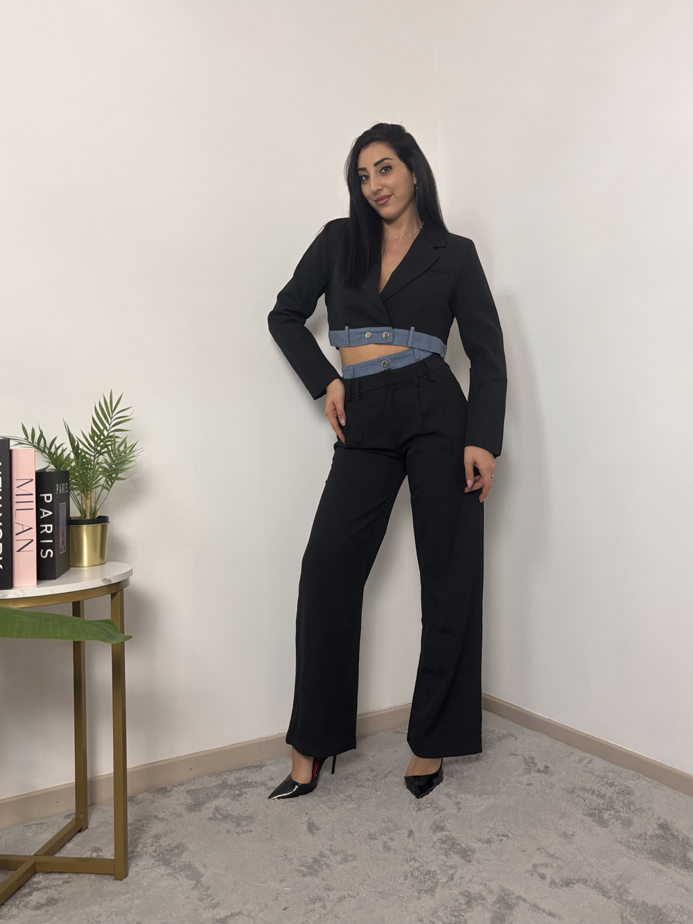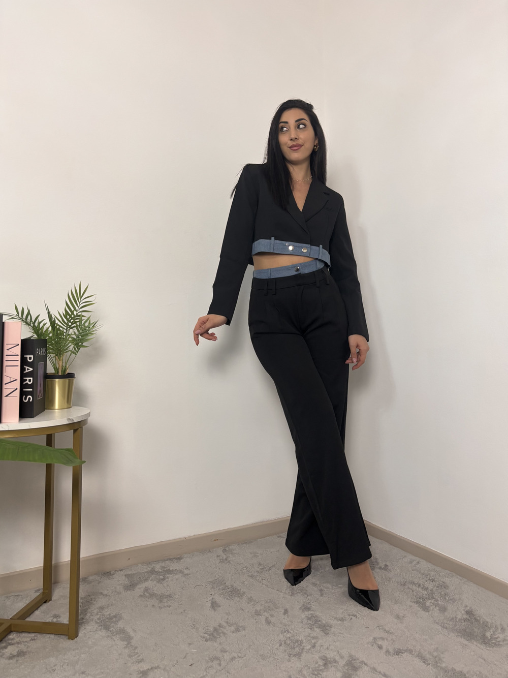 Composto da giacca crop nera con banda denim, modello doppiopetto.
