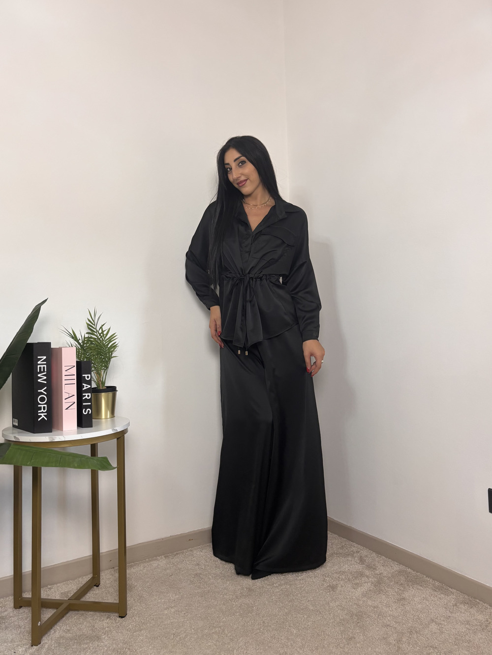Pantalone maxi palazzo con coulisse e camicia manica lunga con coulisse in vita.
