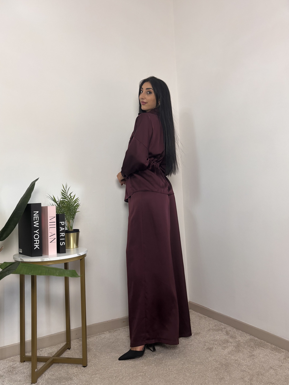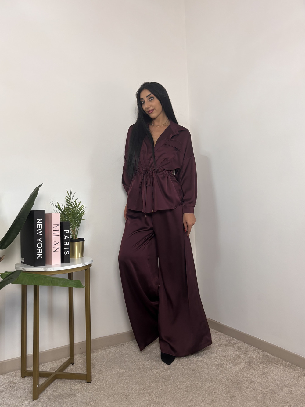 Pantalone maxi palazzo con coulisse e camicia manica lunga con coulisse in vita.