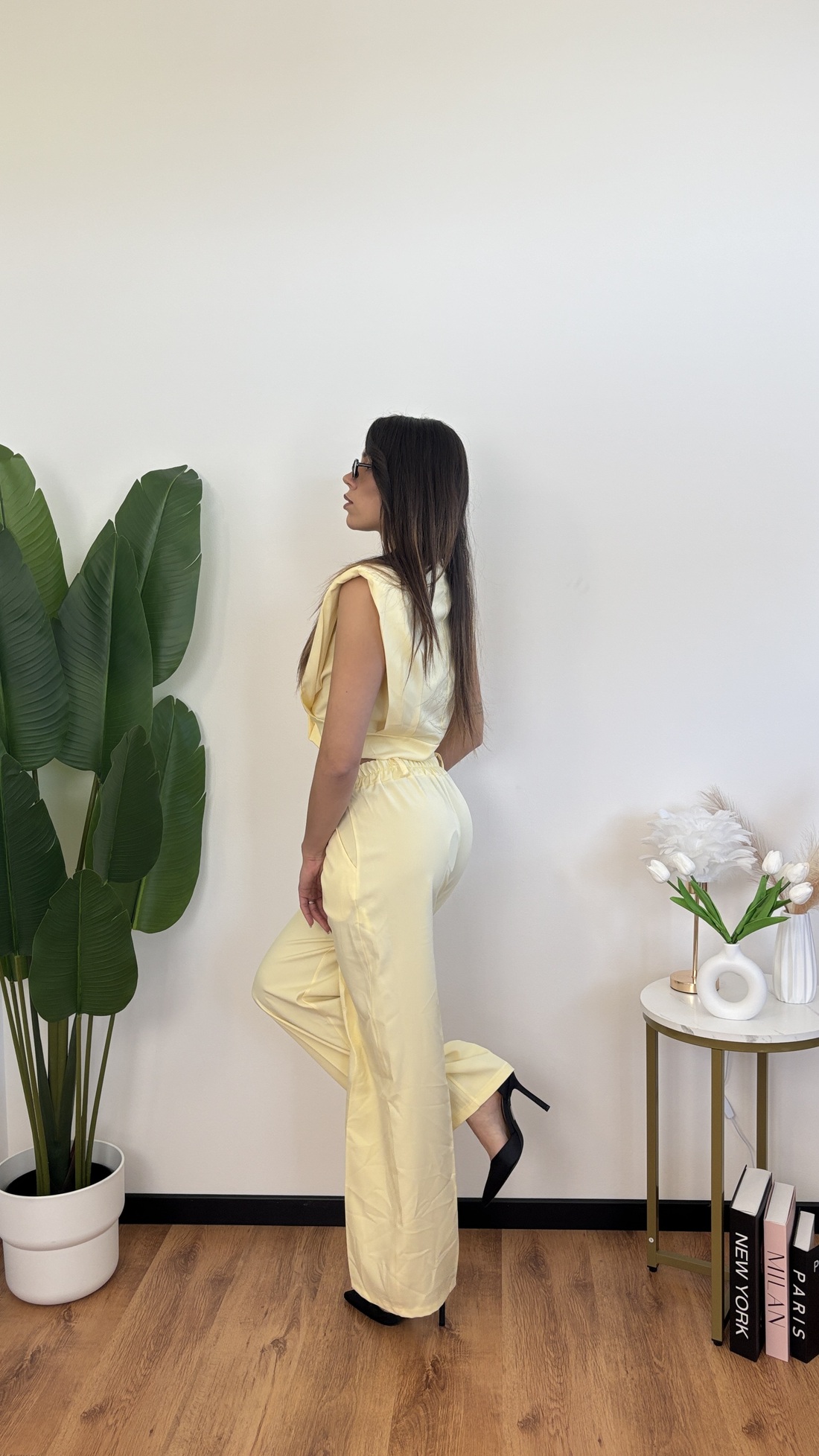 Completo a due pezzi composto da: gilet con bottoni oro e pantaloni a palazzo.