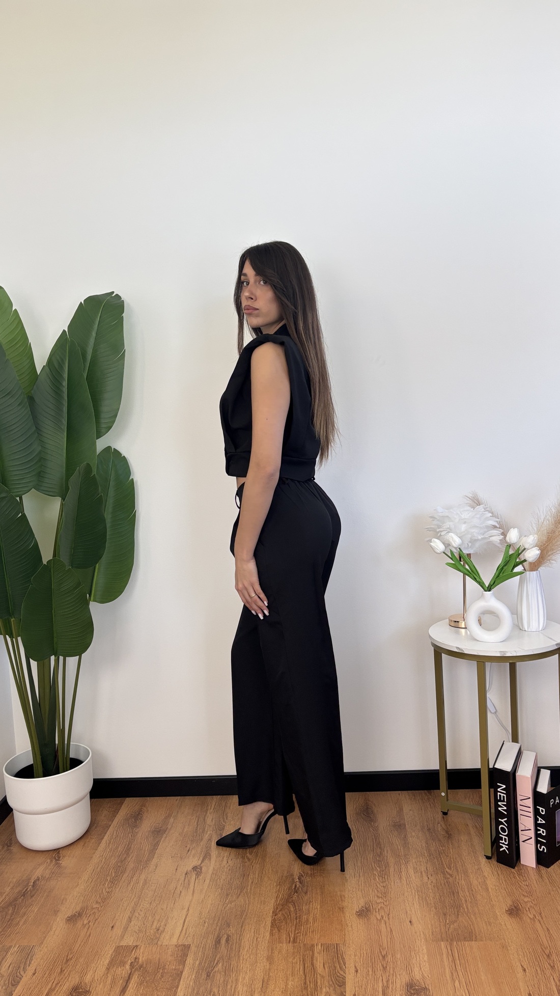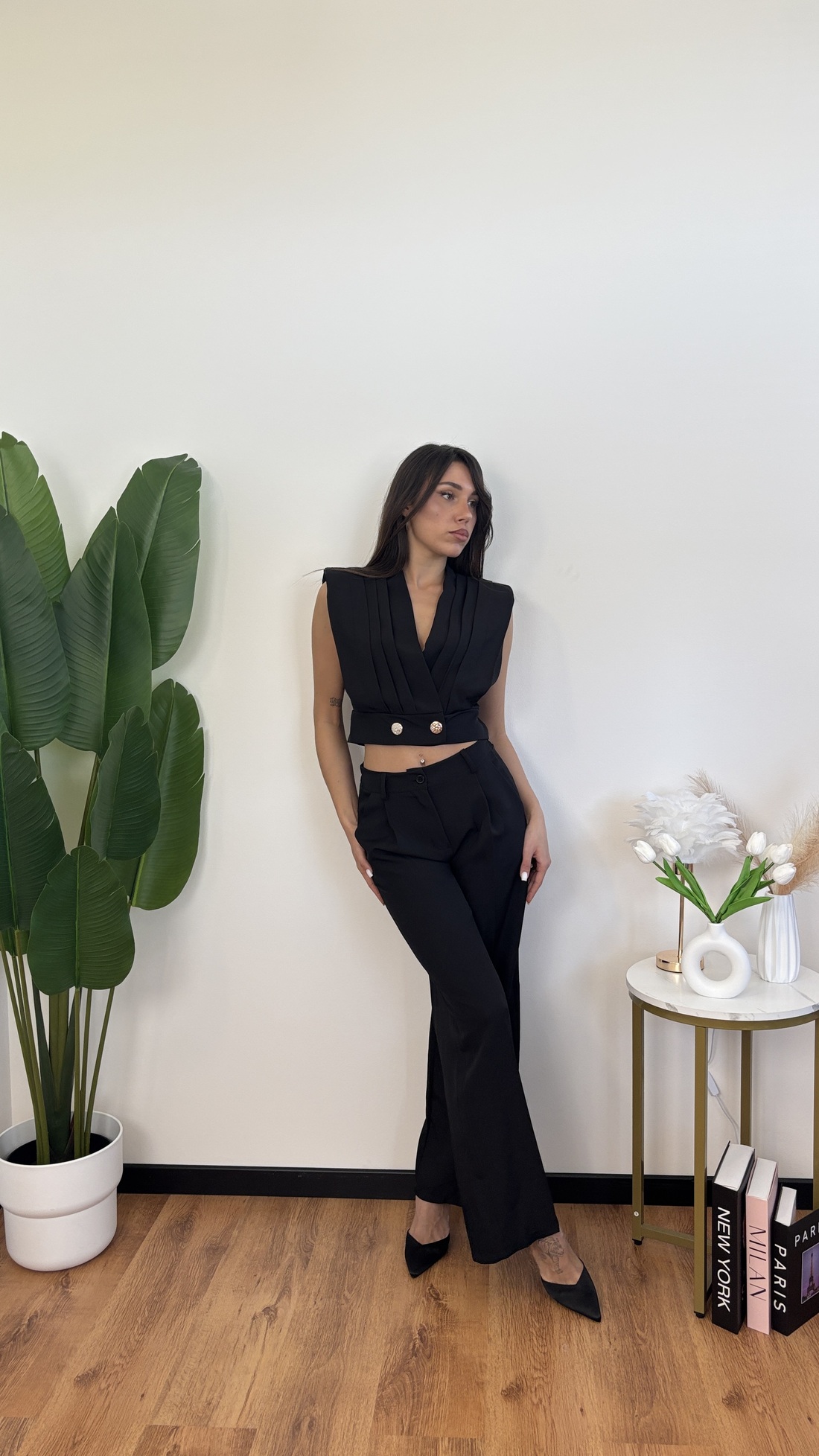 Completo a due pezzi composto da: gilet con bottoni oro e pantaloni a palazzo.