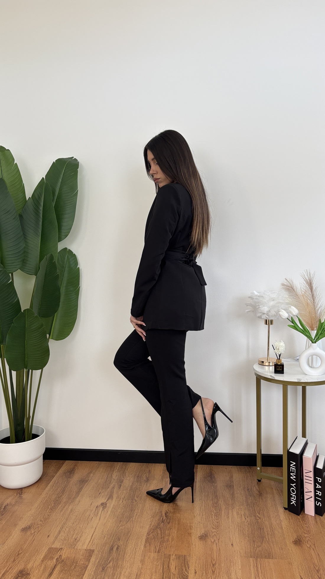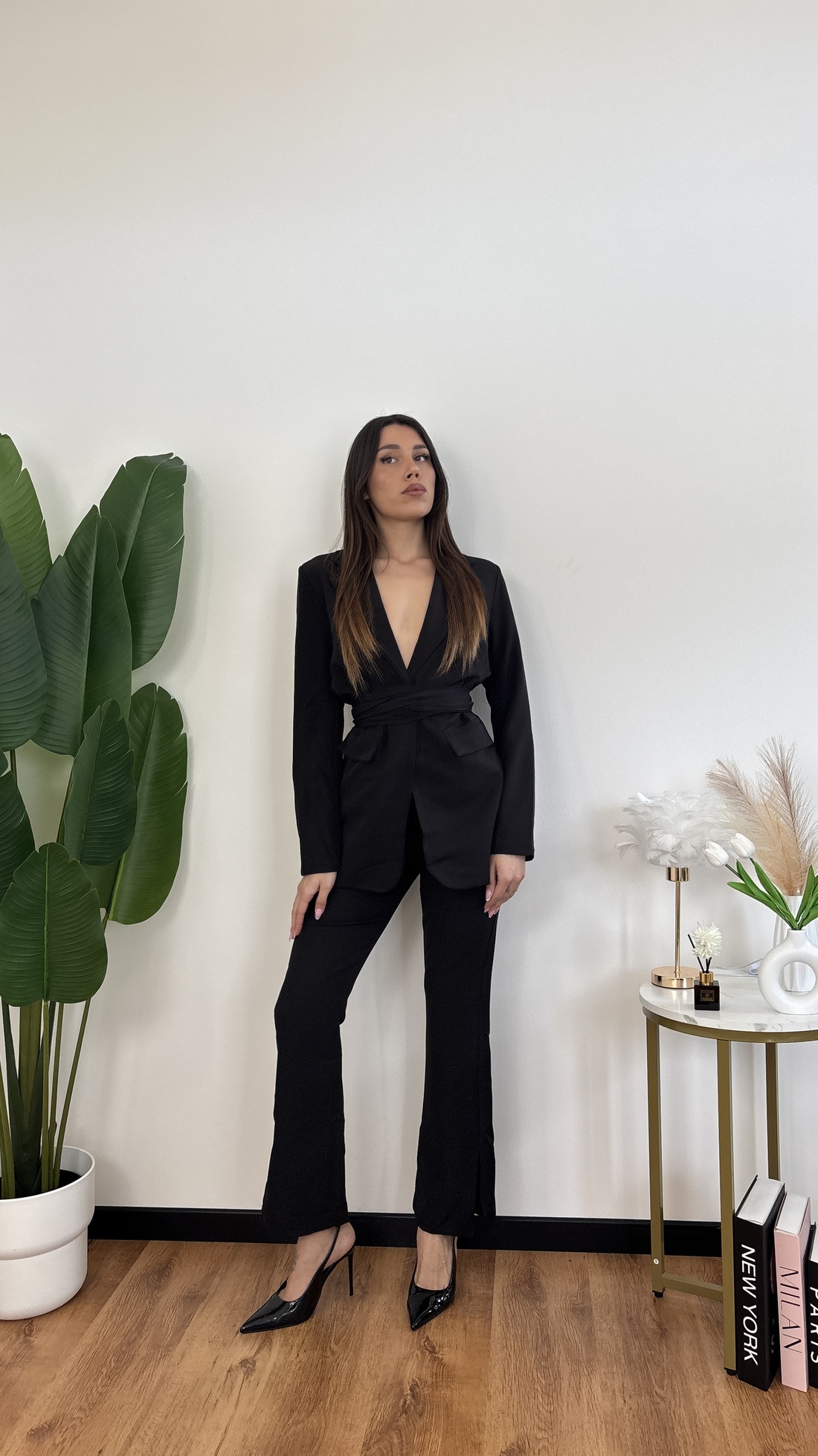 Pantalone a zampa con spacco in fondo e vita elasticizzata dietro.