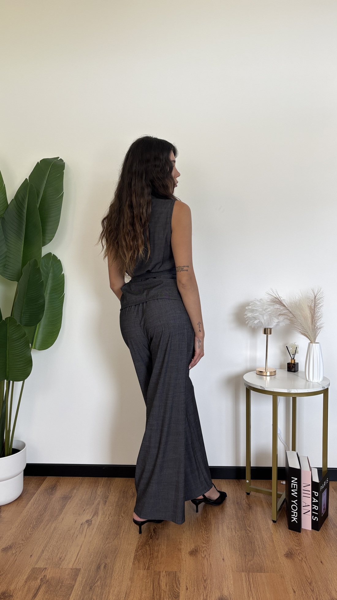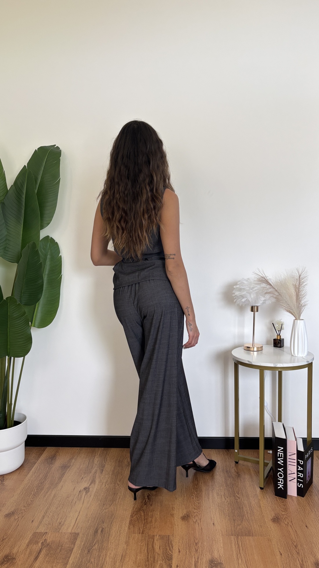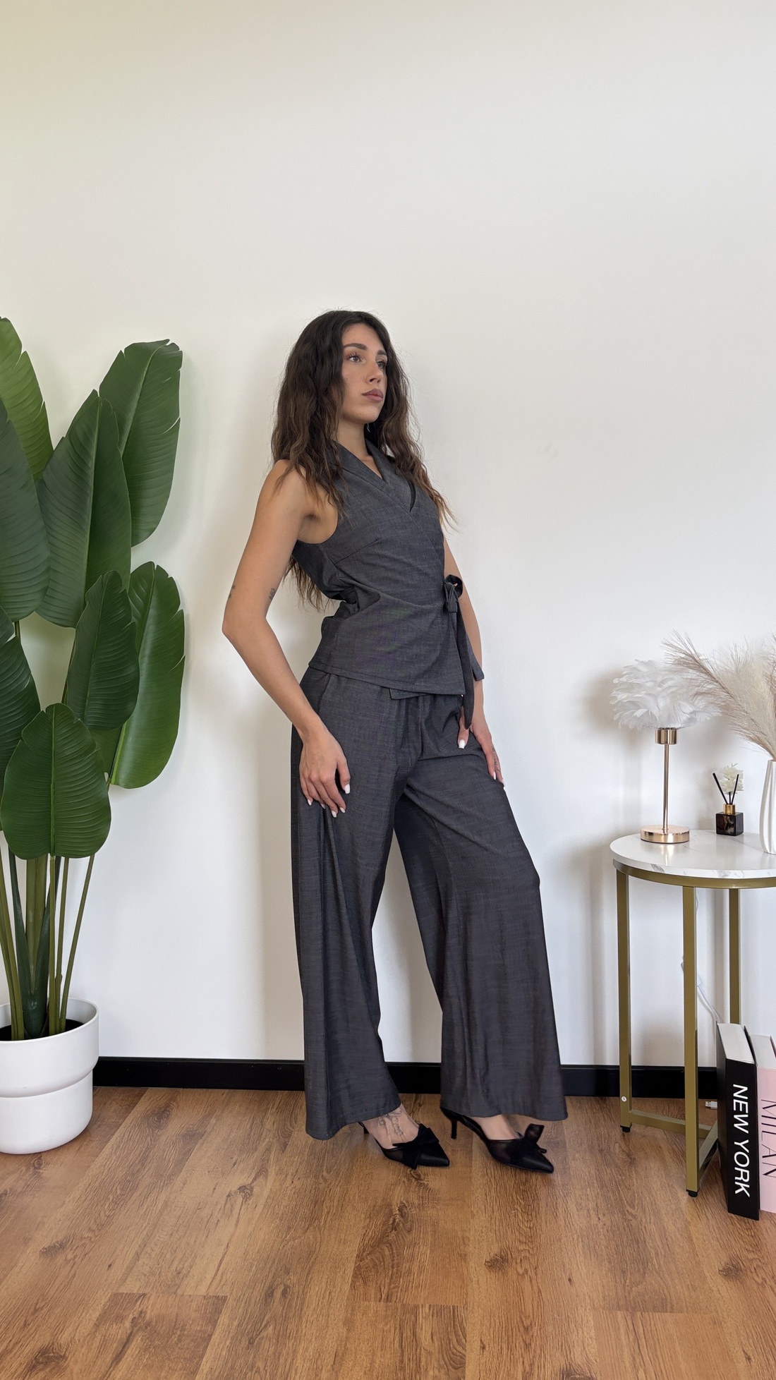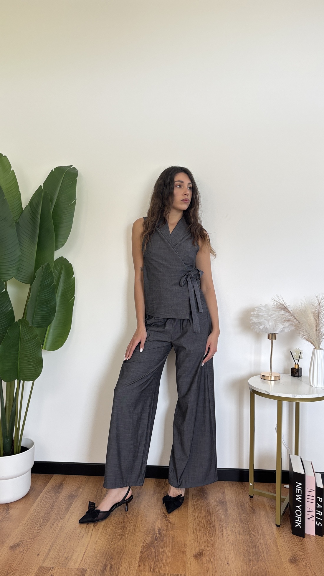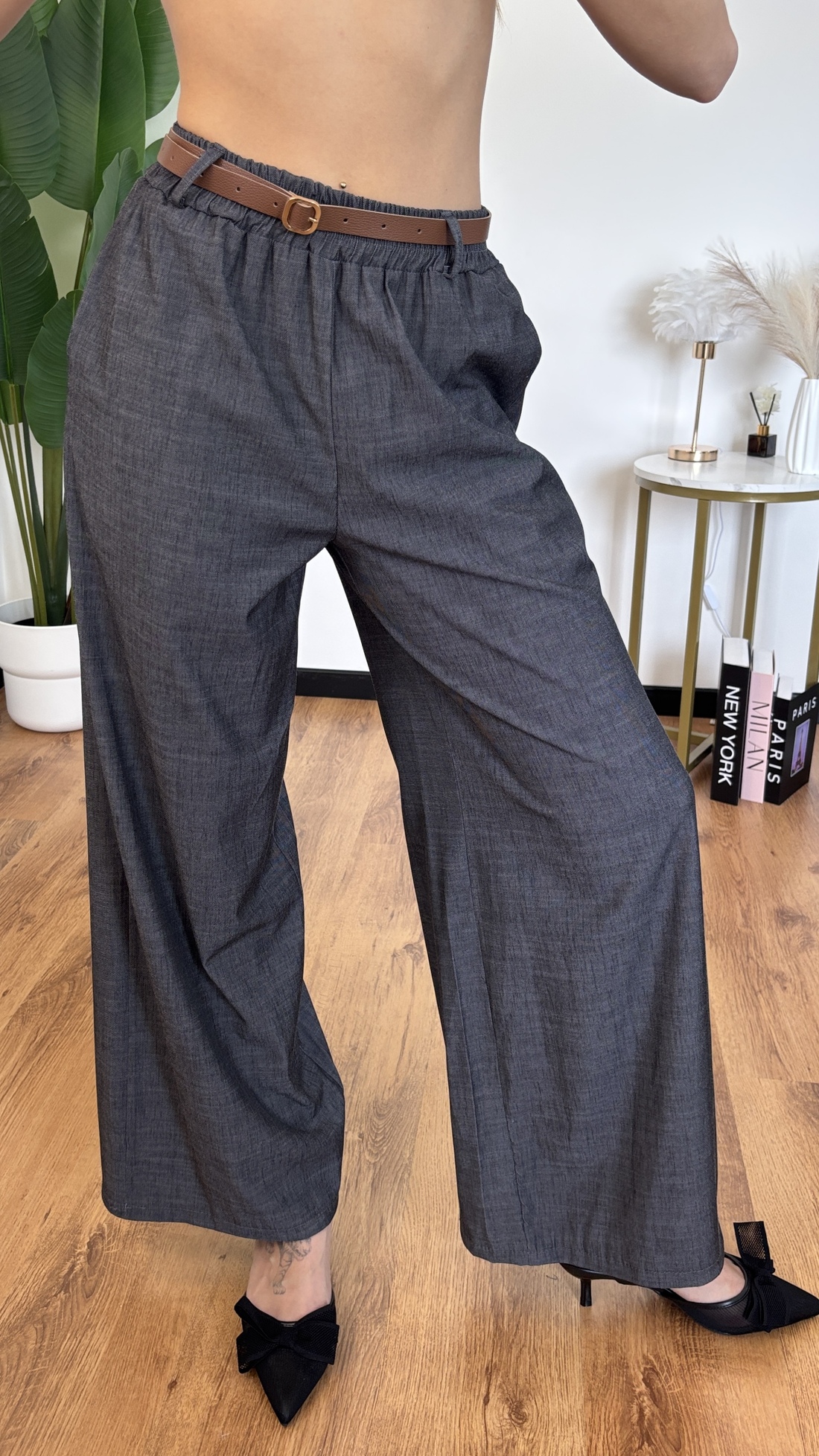 -pantalone a palazzo con cintura compresa, elastico in vita.