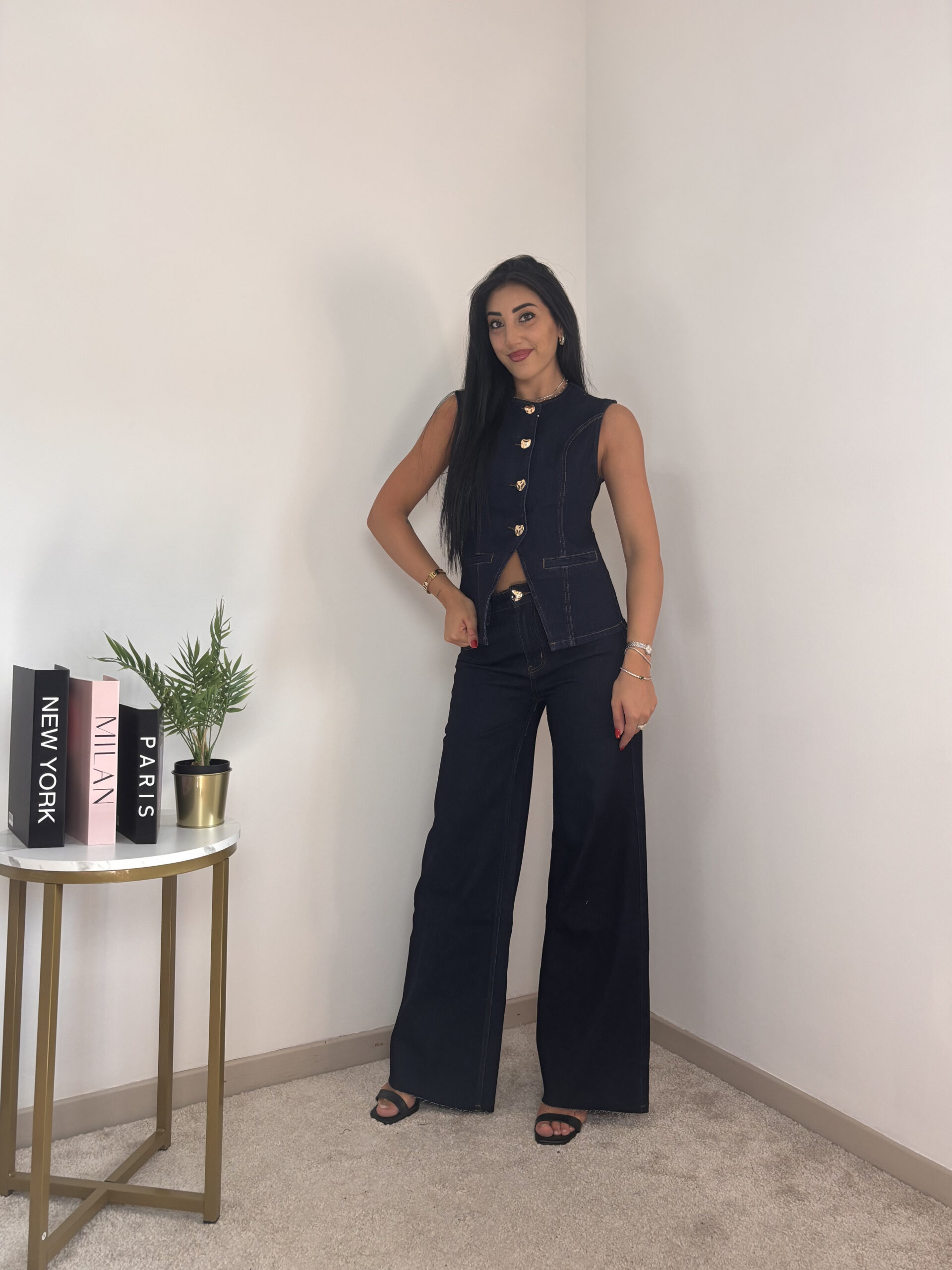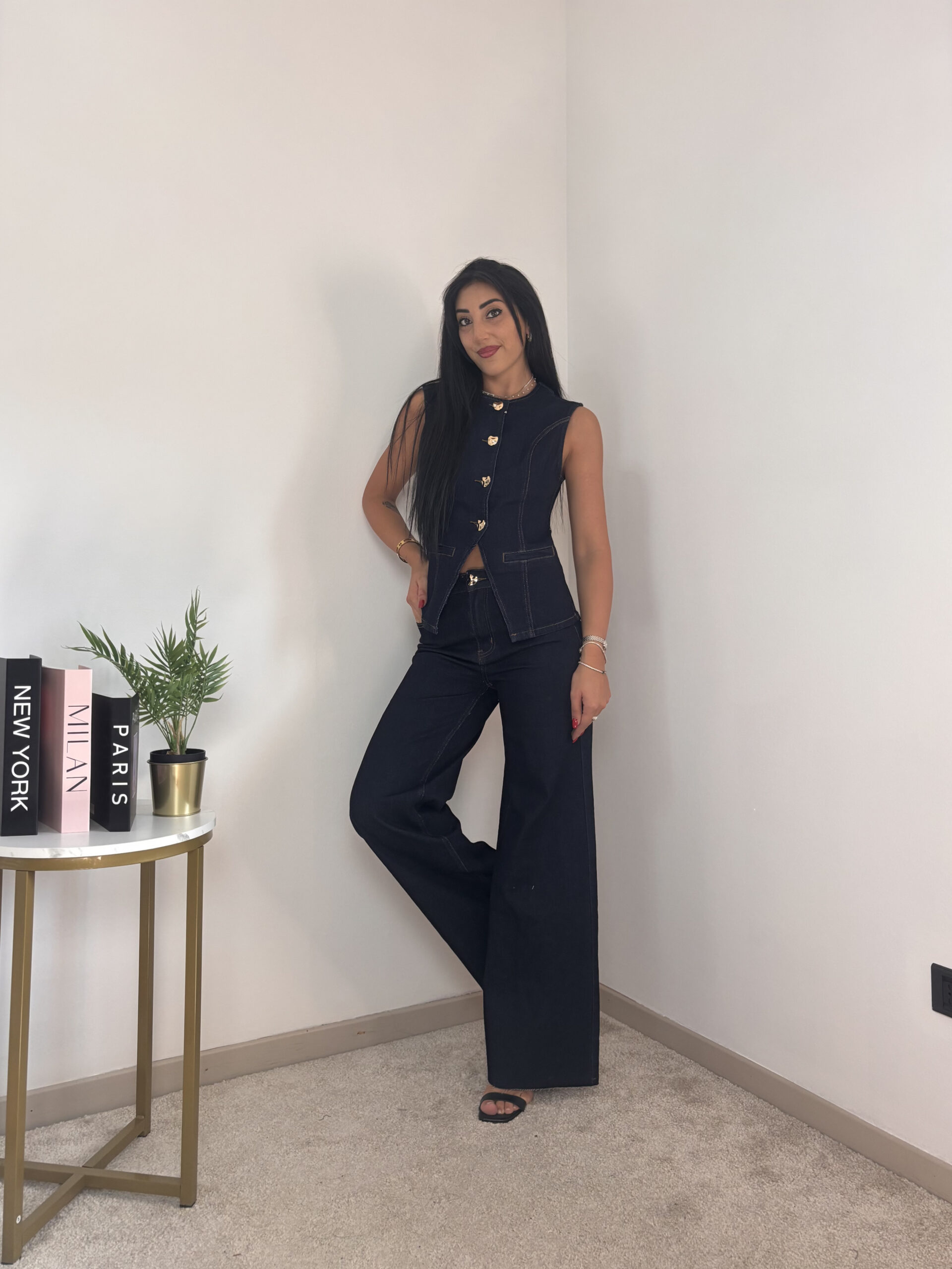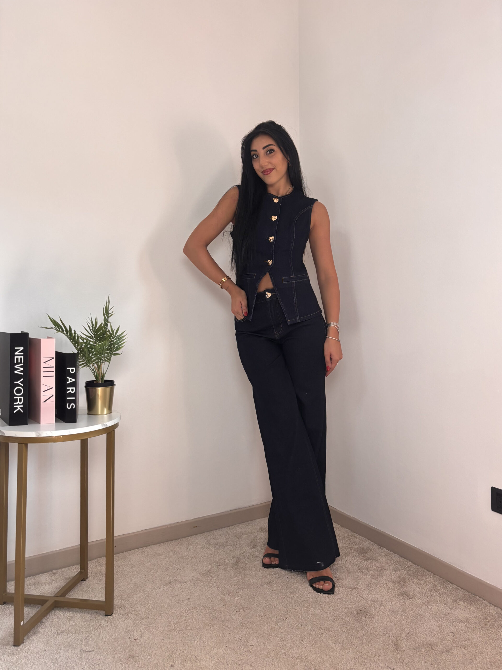Modello smanicato con bottoncini oro e pantalone a palazzo.