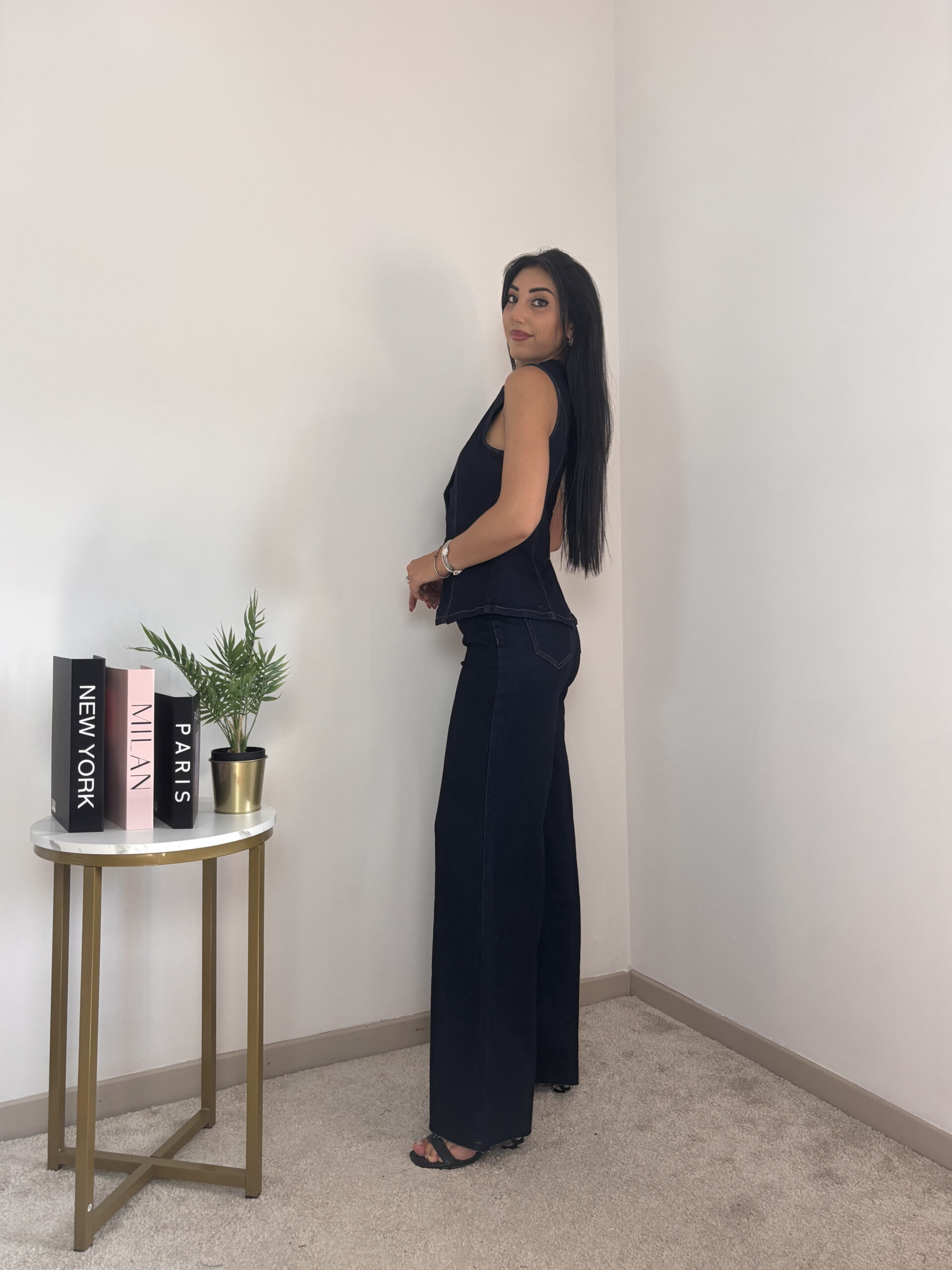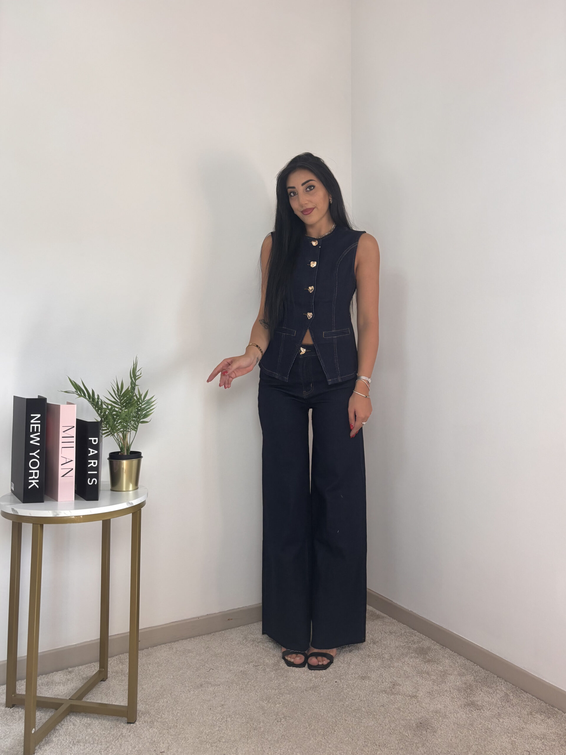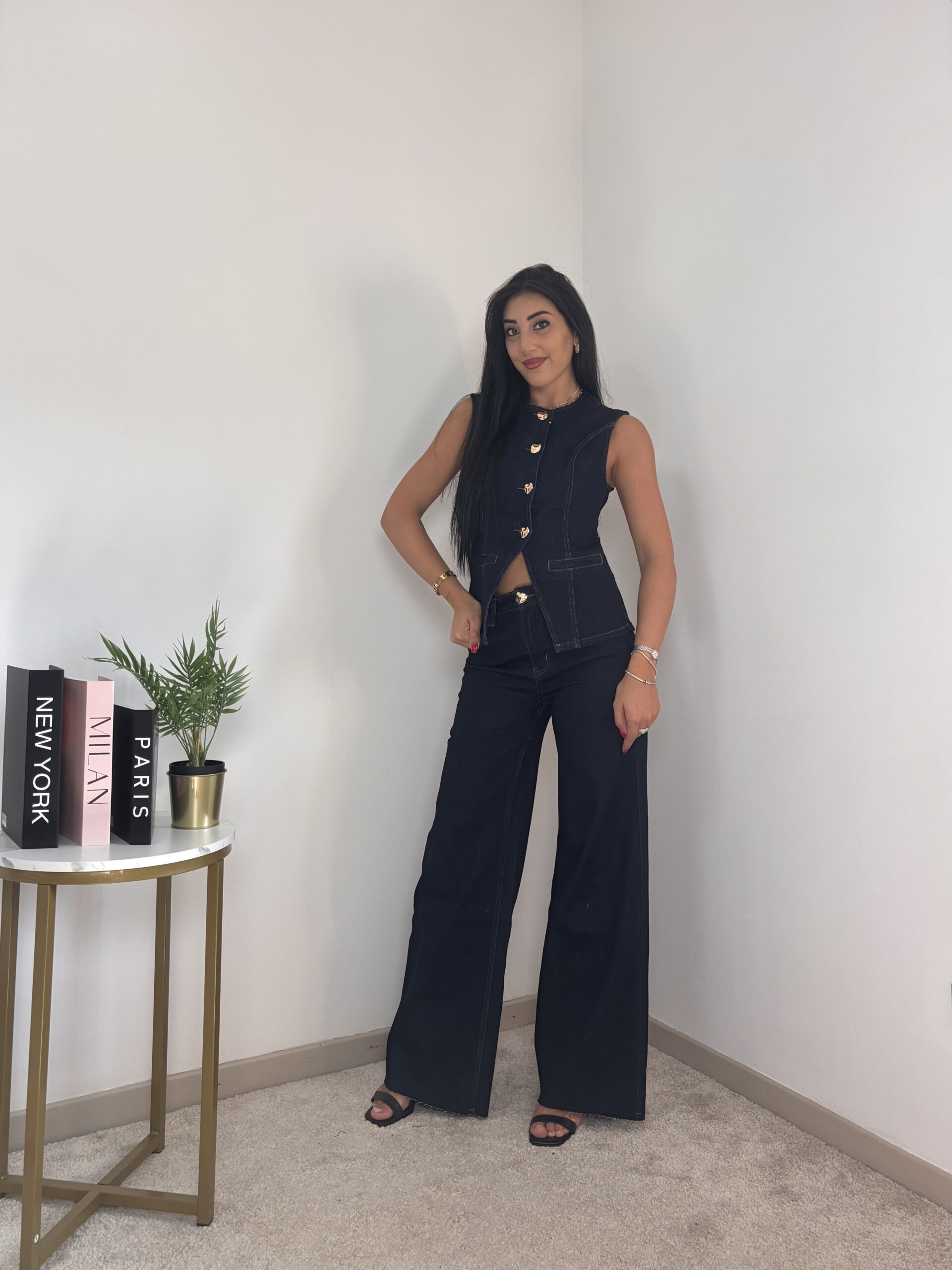 Modello smanicato con bottoncini oro e pantalone a palazzo.