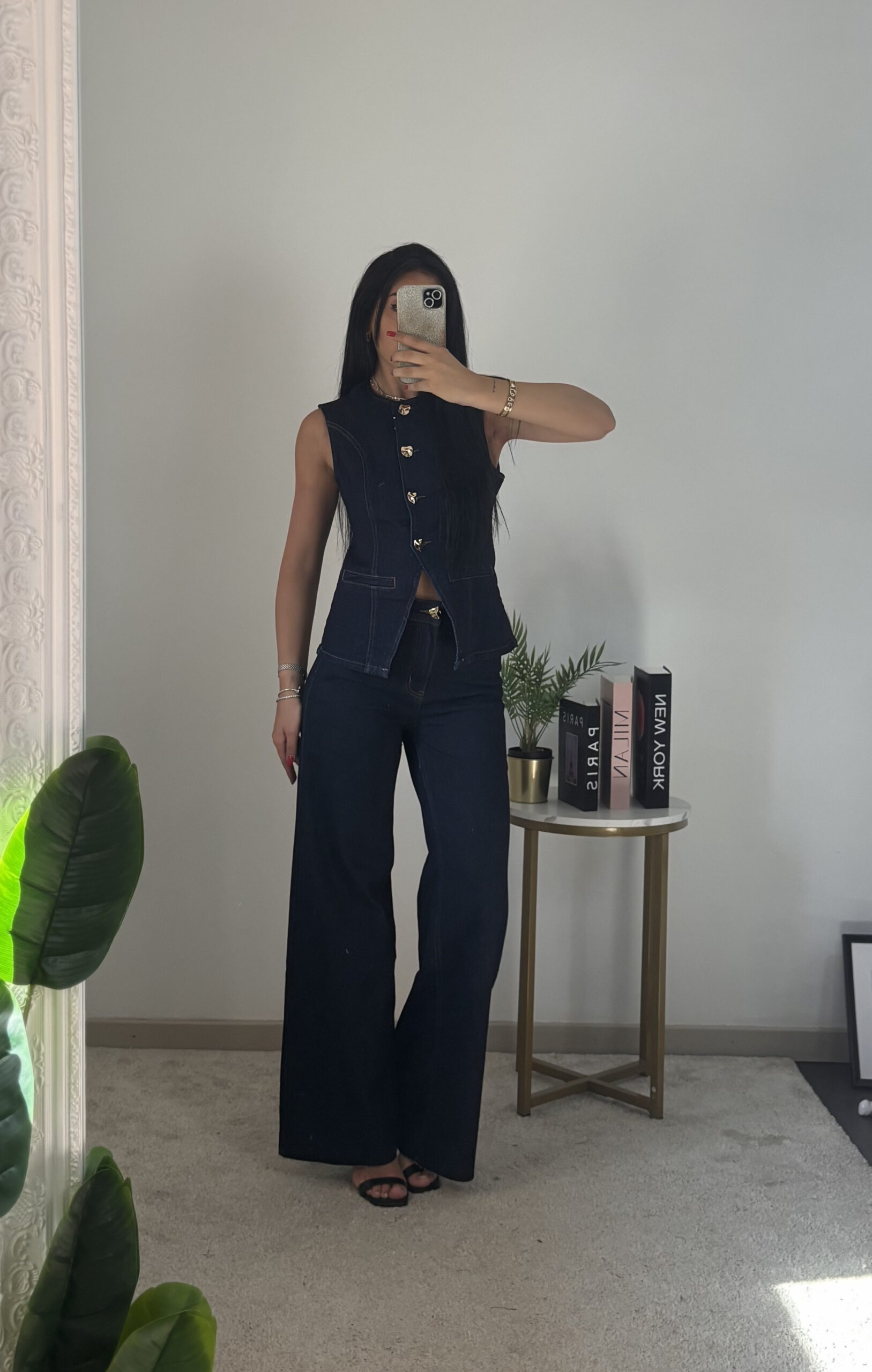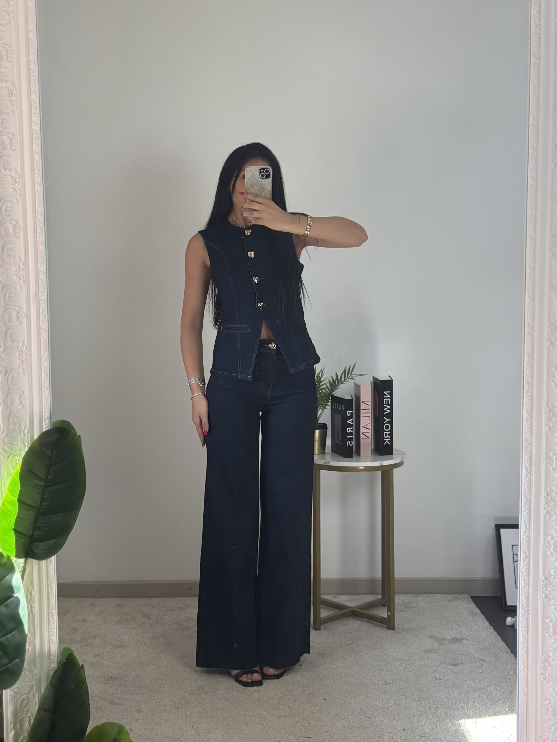 Coordinato in denim scuro.