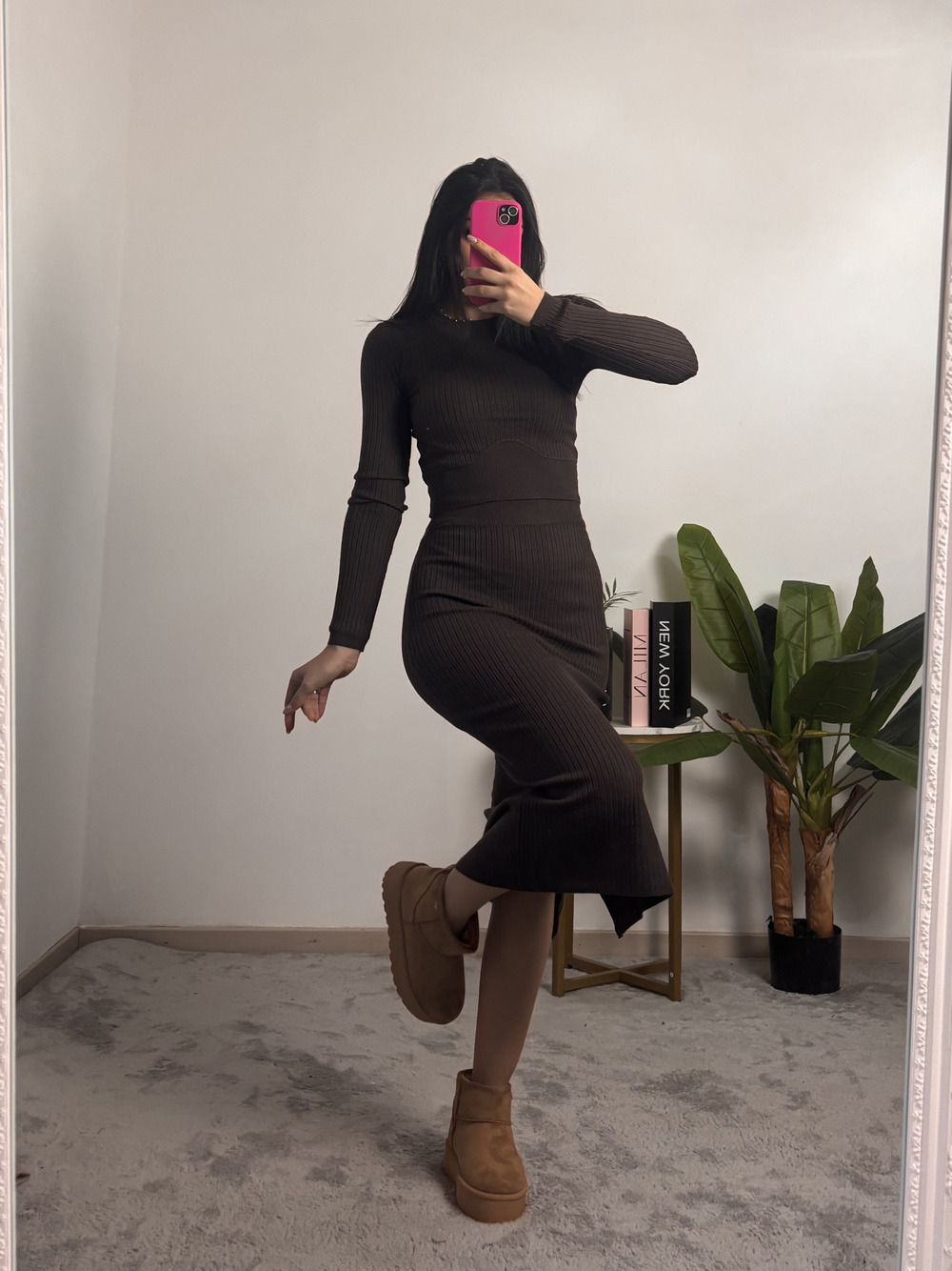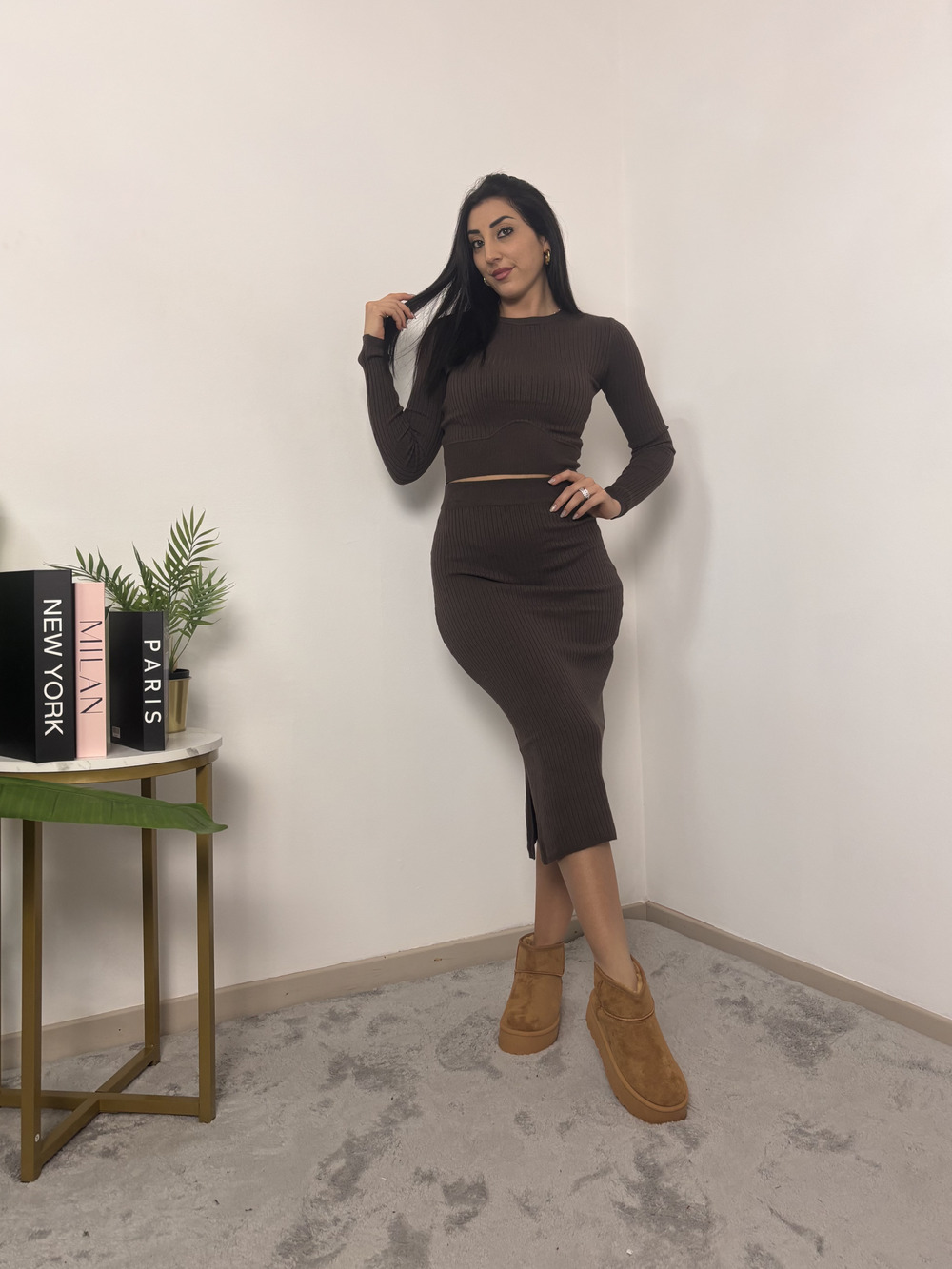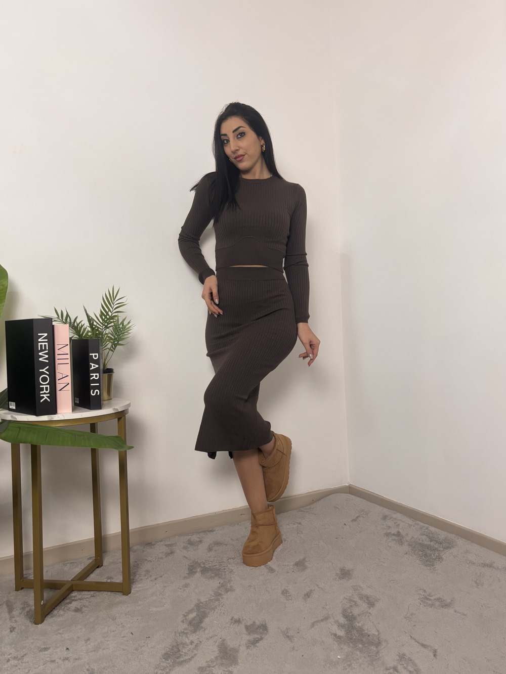 Coordinato in maglia, tessuto a costine.