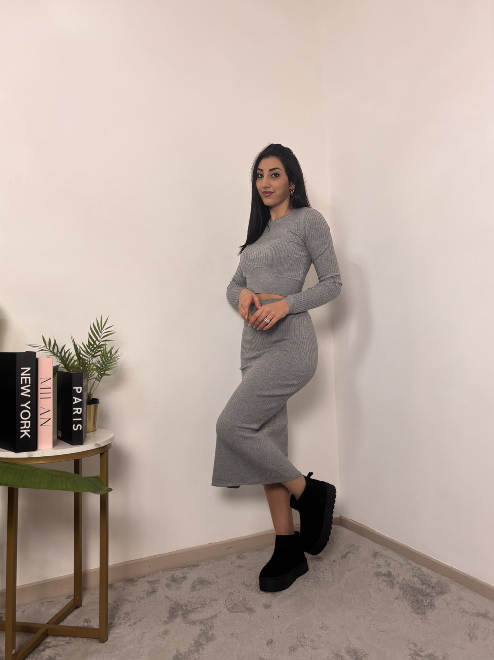Composto da crop top a maniche lunghe e longuette con spacco.