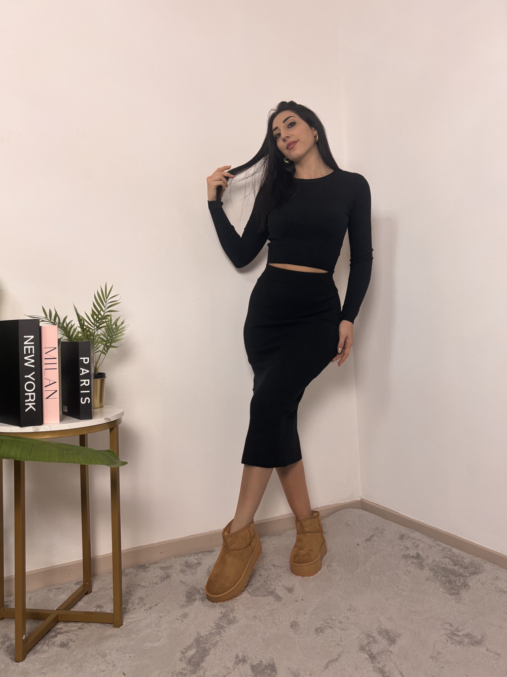 Coordinato in maglia, tessuto a costine.