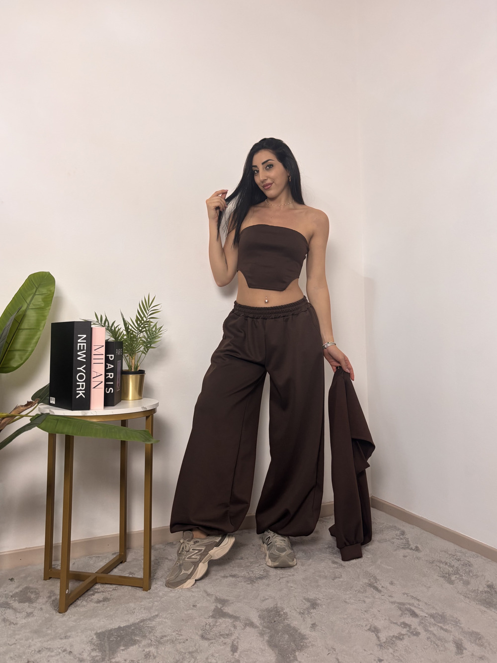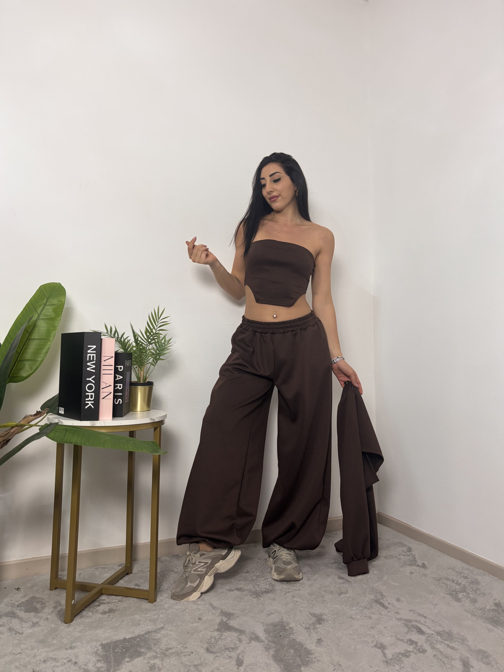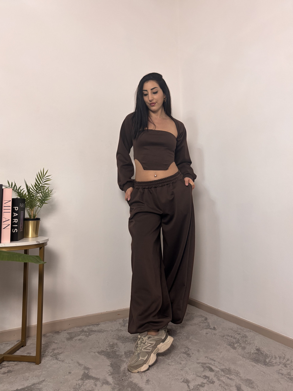 coordinato in tuta a tre pezzi, composto da: pantalone con polsino in fondo, top e coprispalle.