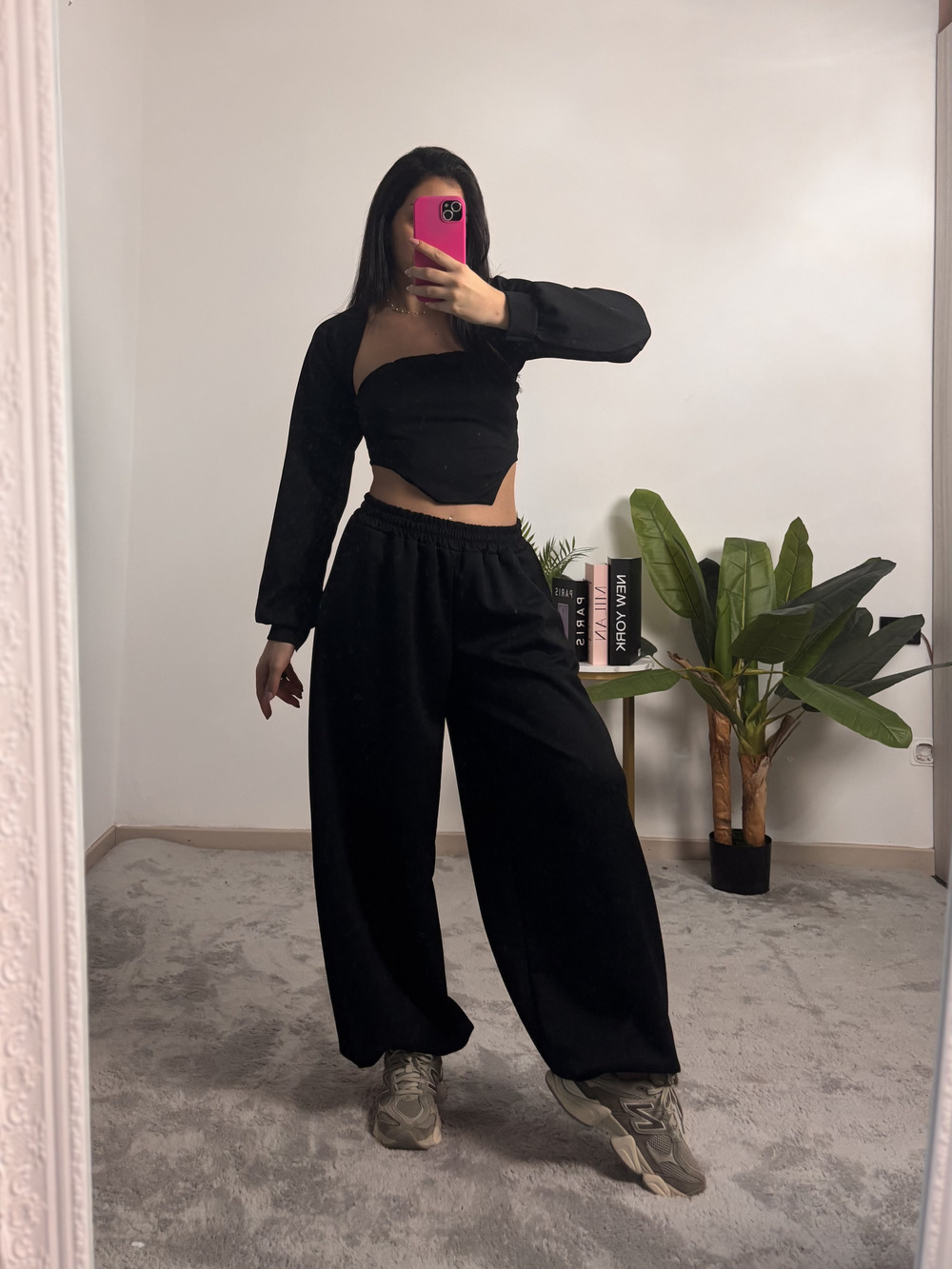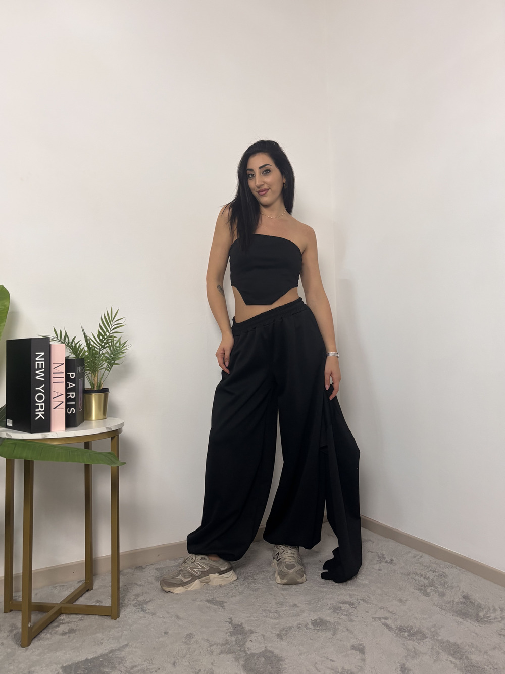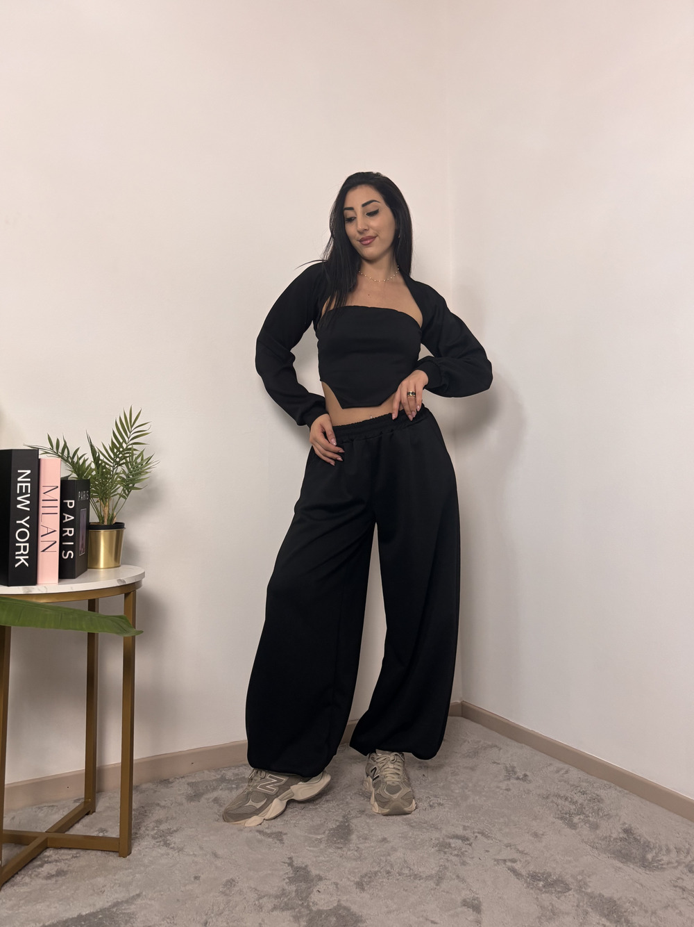 coordinato in tuta a tre pezzi, composto da: pantalone con polsino in fondo, top e coprispalle.