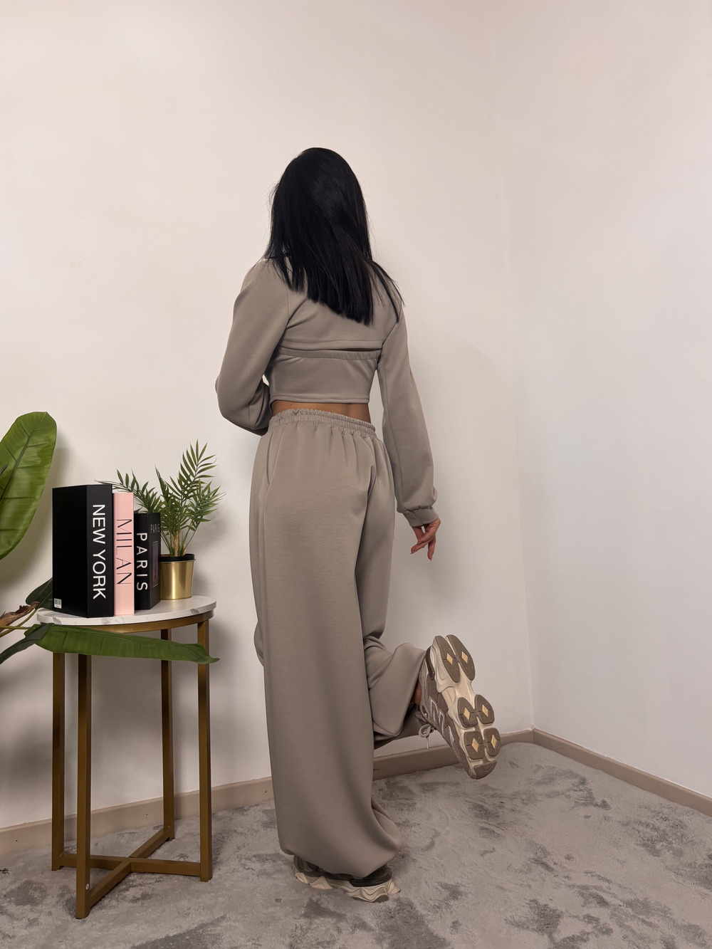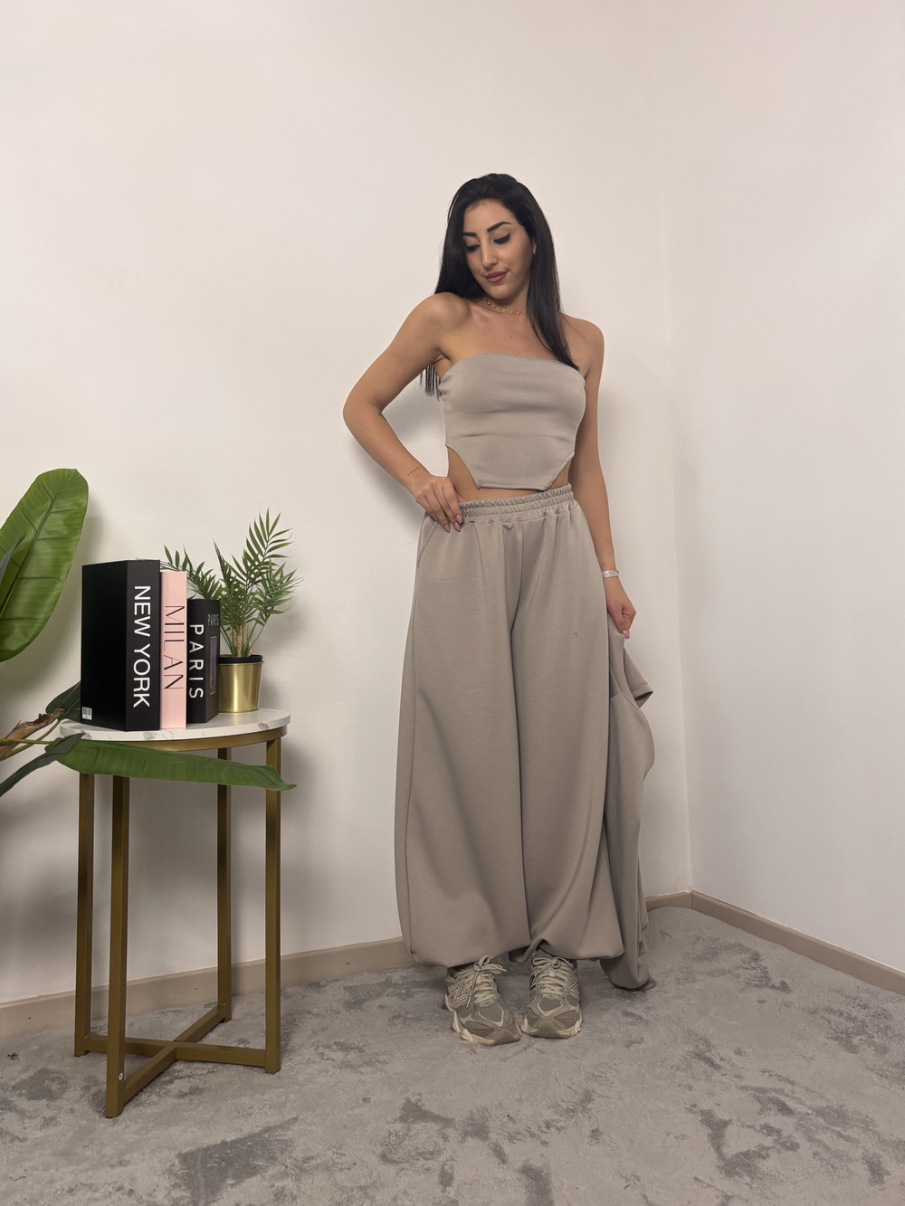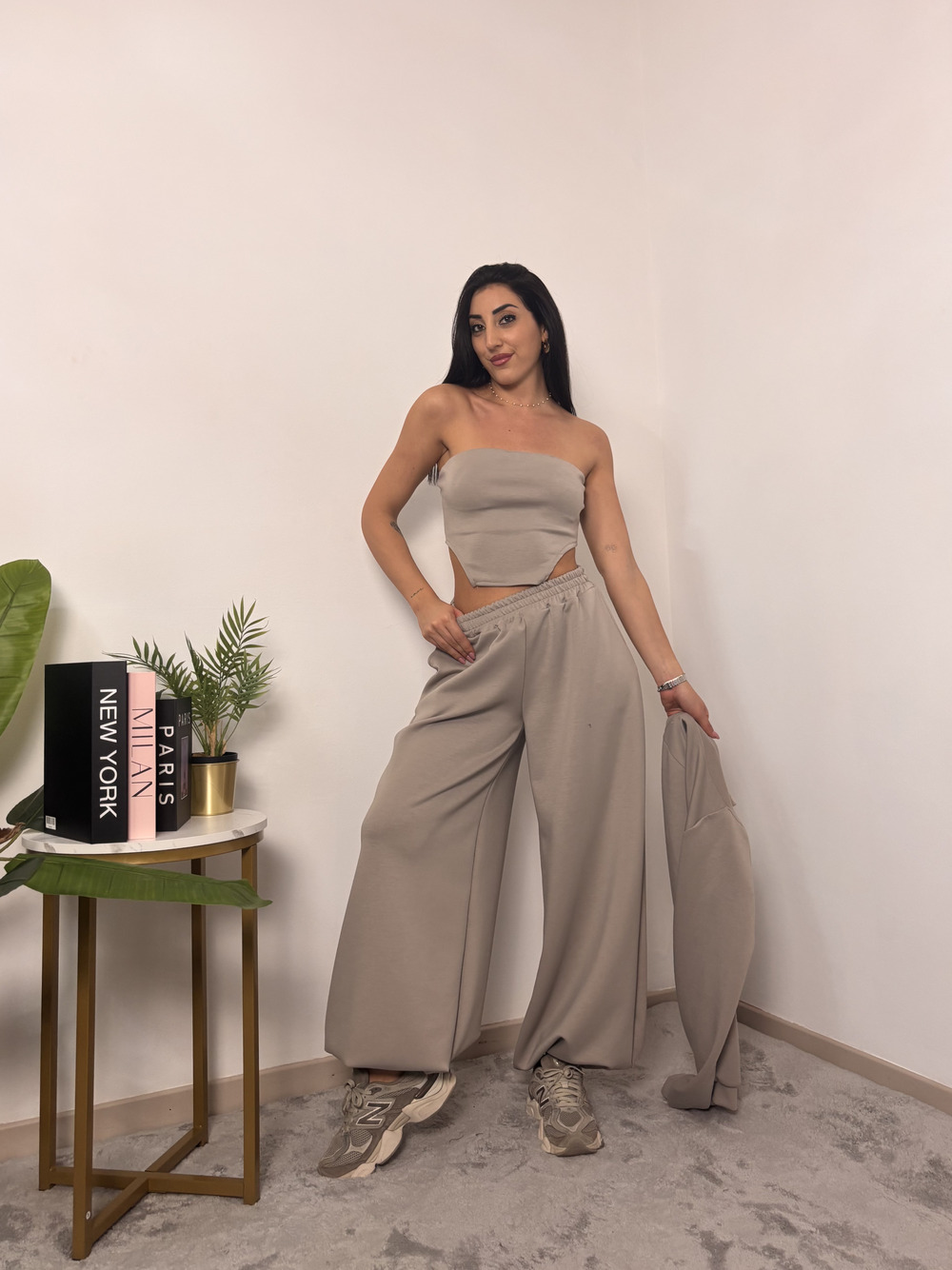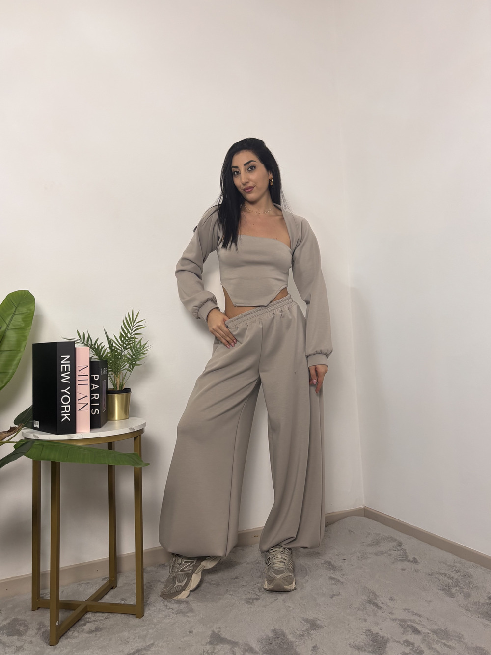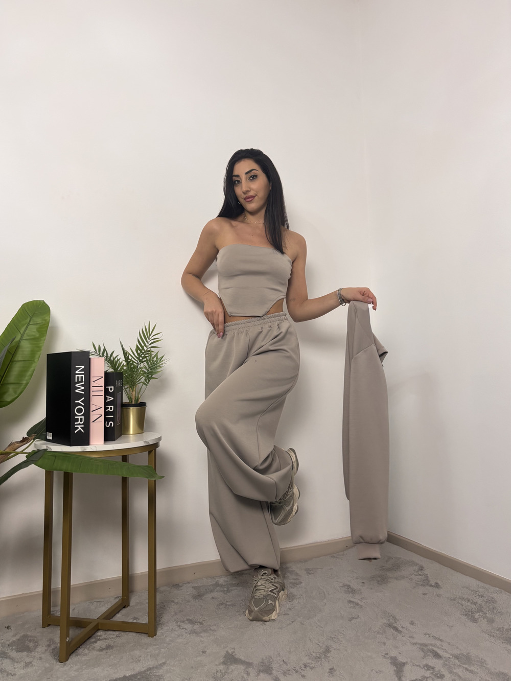 coordinato in tuta a tre pezzi, composto da: pantalone con polsino in fondo, top e coprispalle.