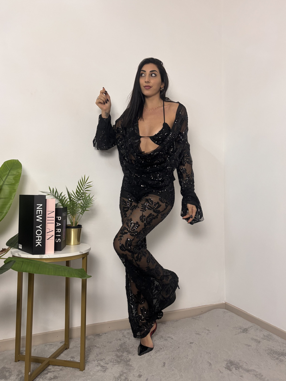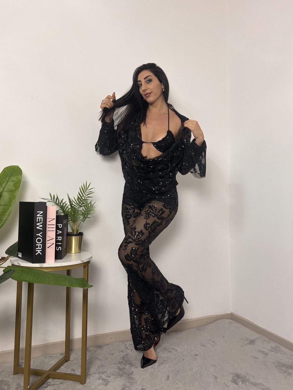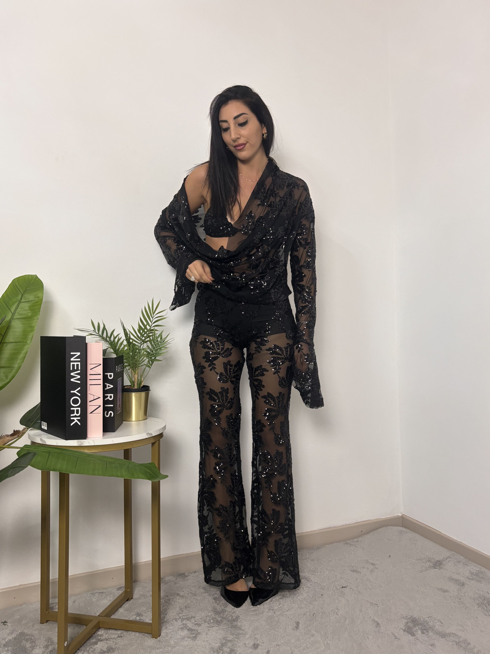 Pantalone a zampa con culotte, reggiseno e maxi camicia con scollo morbido.