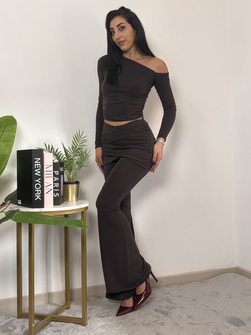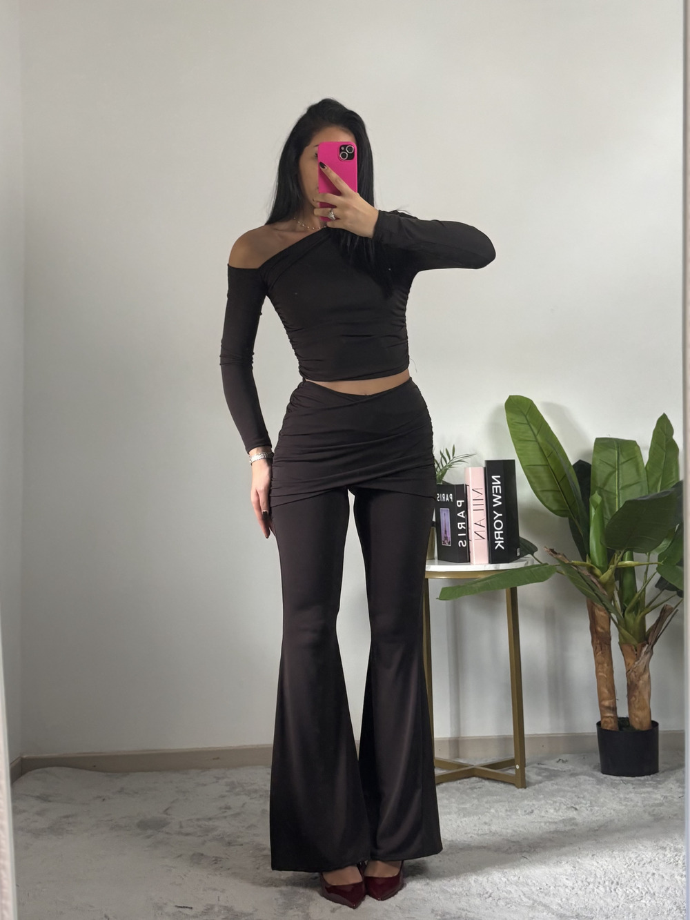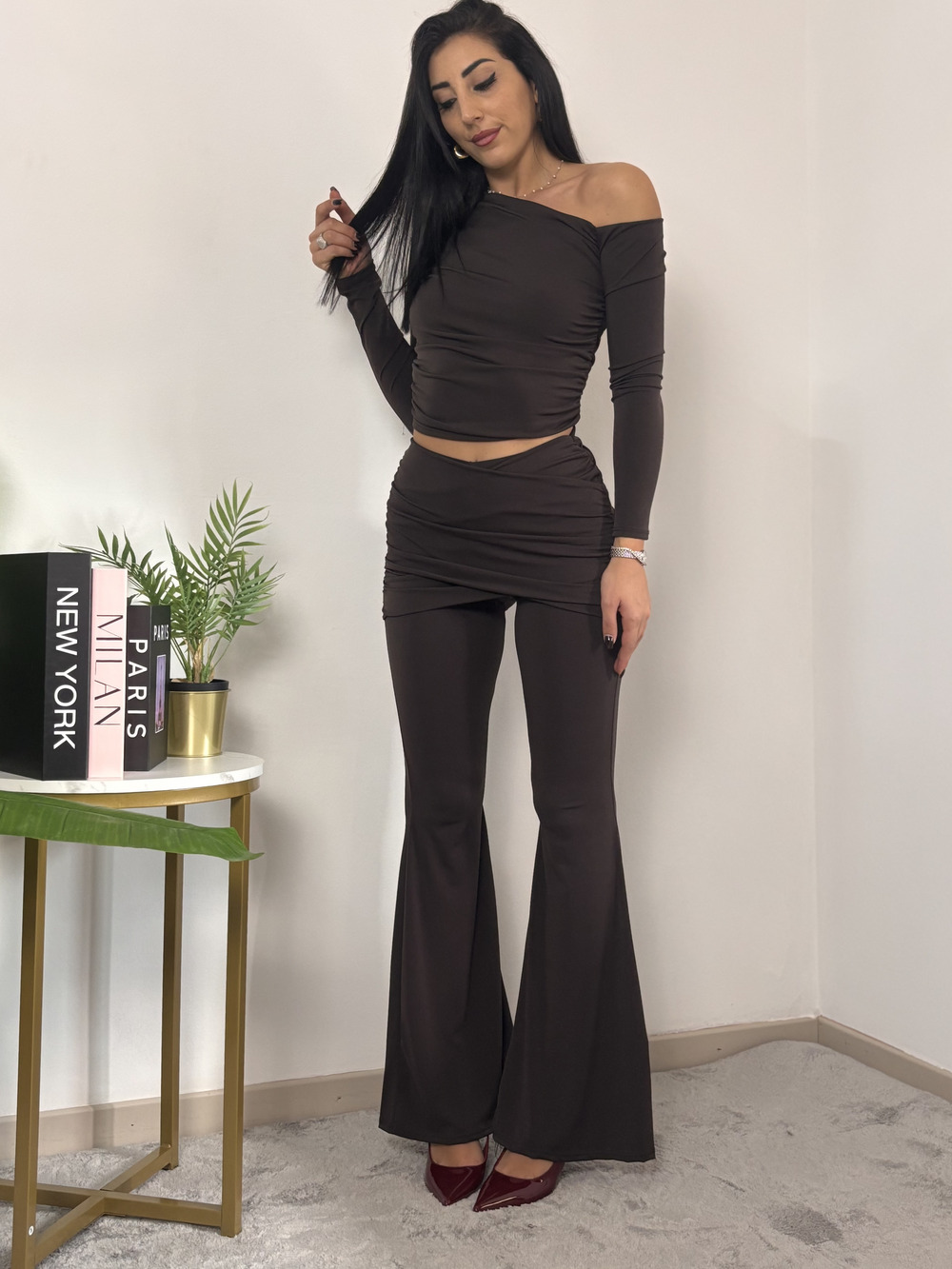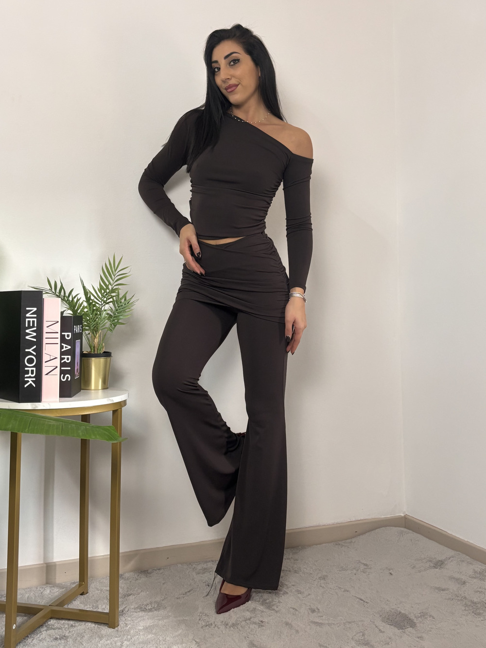 Maglia con scollo obliquo e pantalone a zampa con maxi fascia sui fianchi.