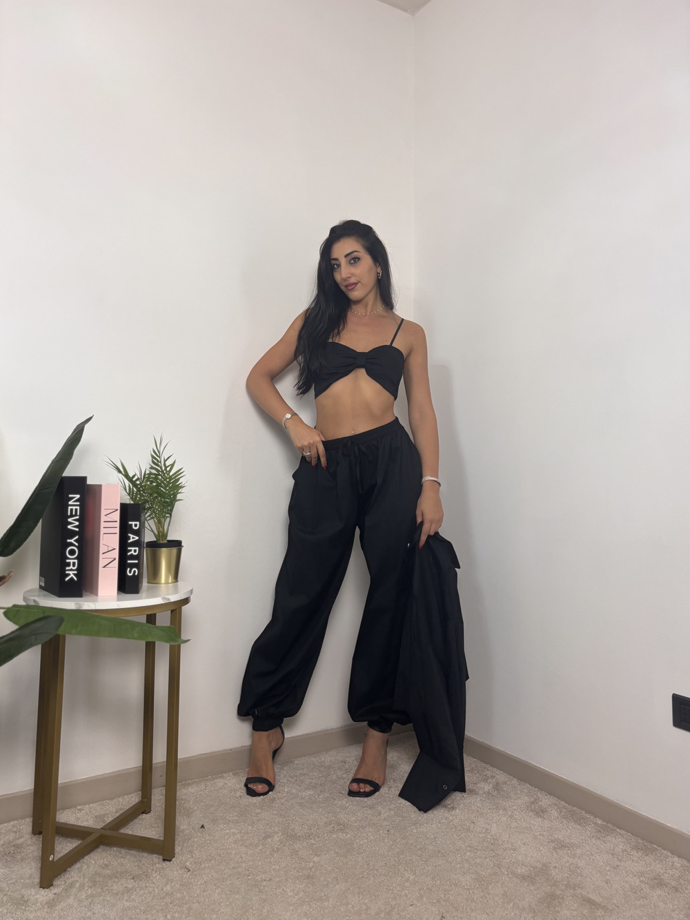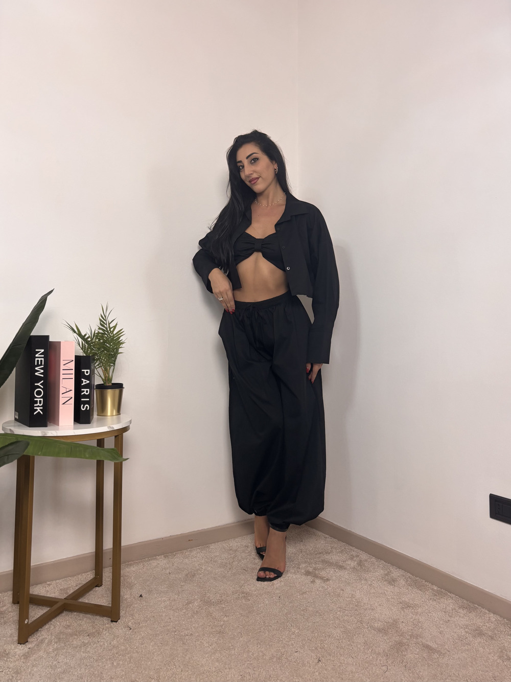coordinato a tre pezzi composto da: pantalone, top e camicia crop