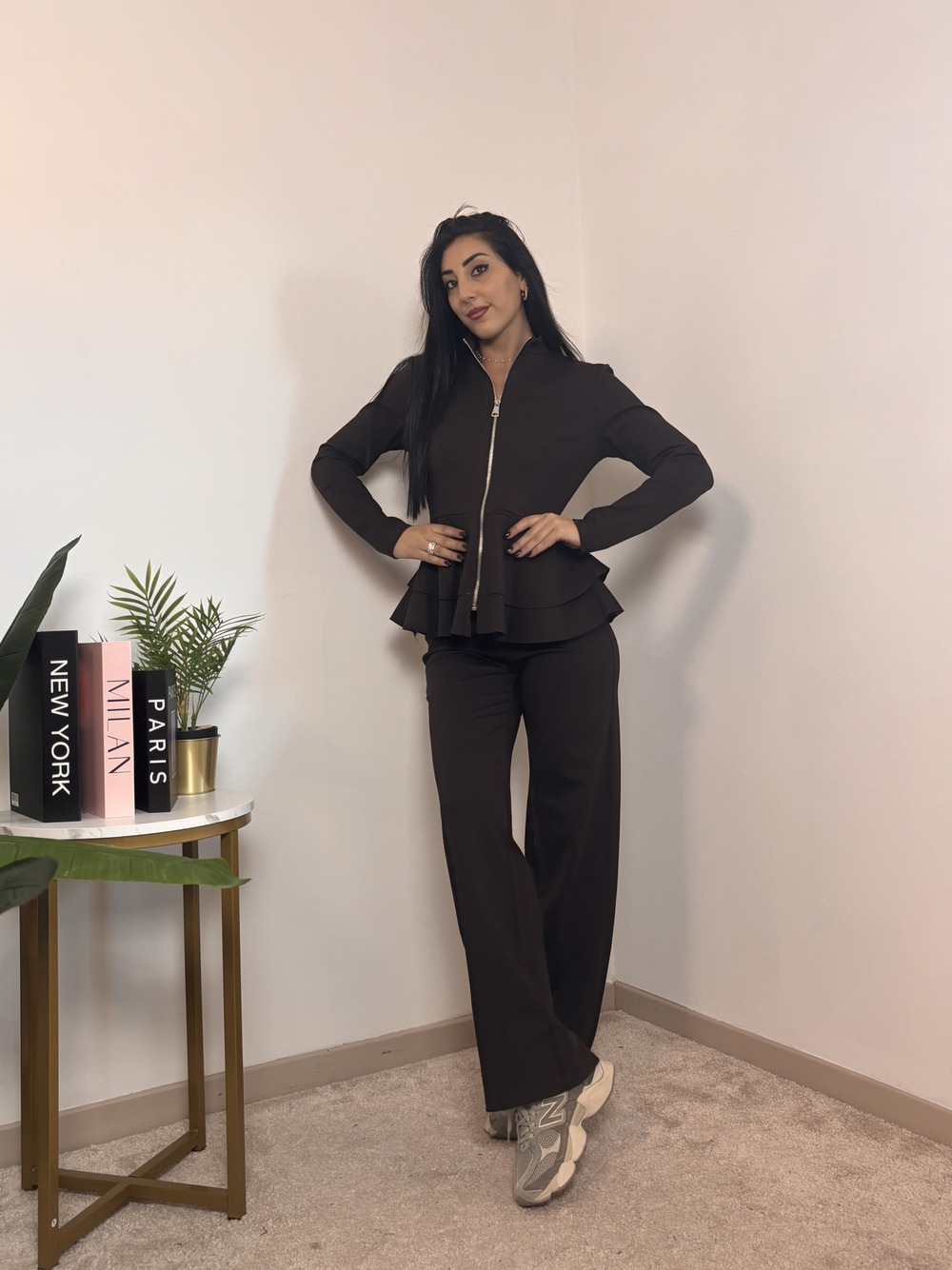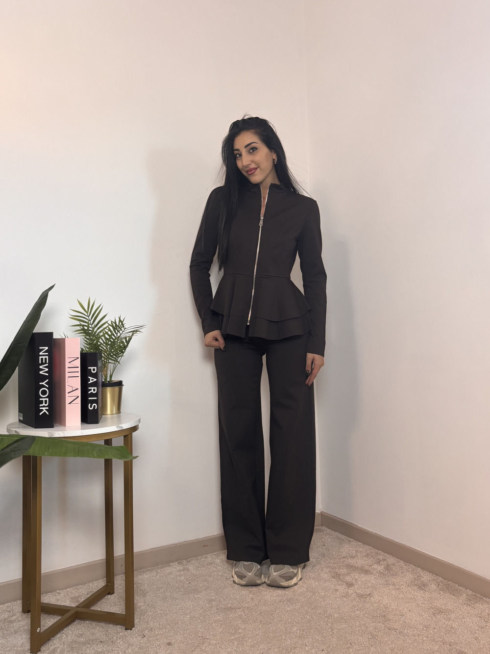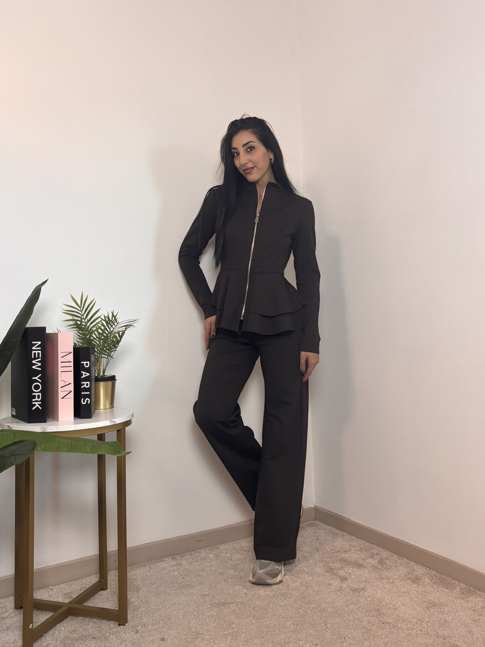 Composta da: Pantalone a palazzo e giacca con frappa in fondo.