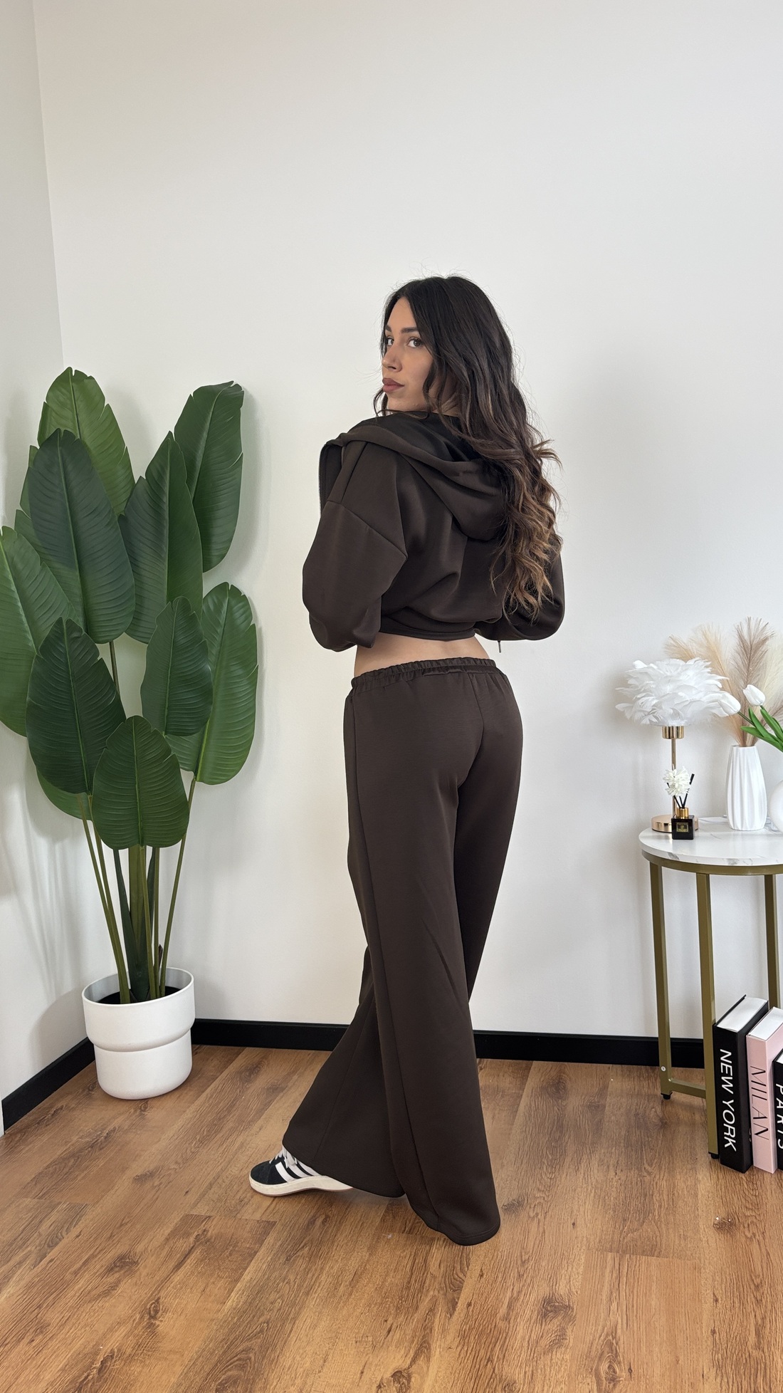 – pantalone a palazzo con elastico in vita.