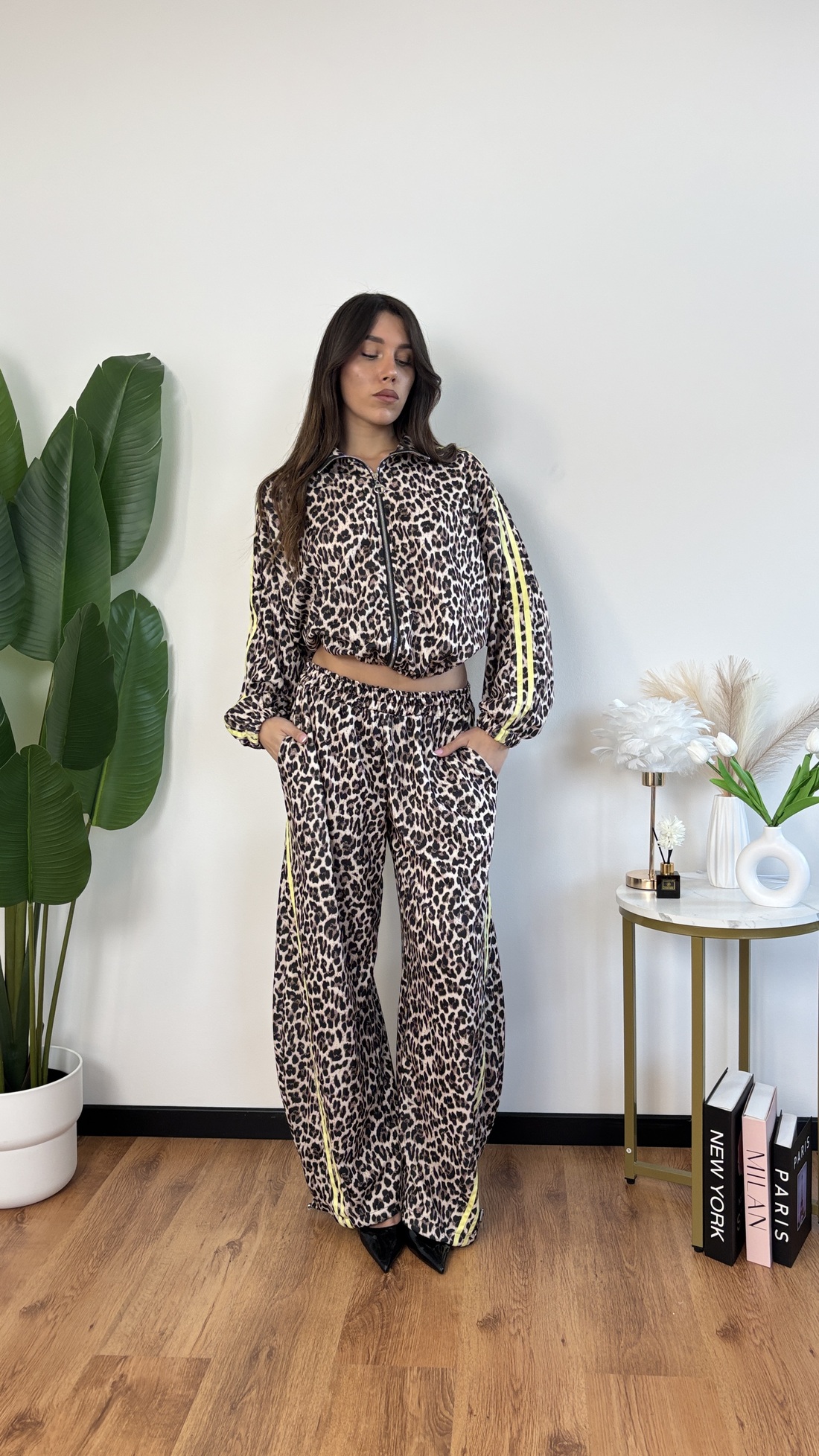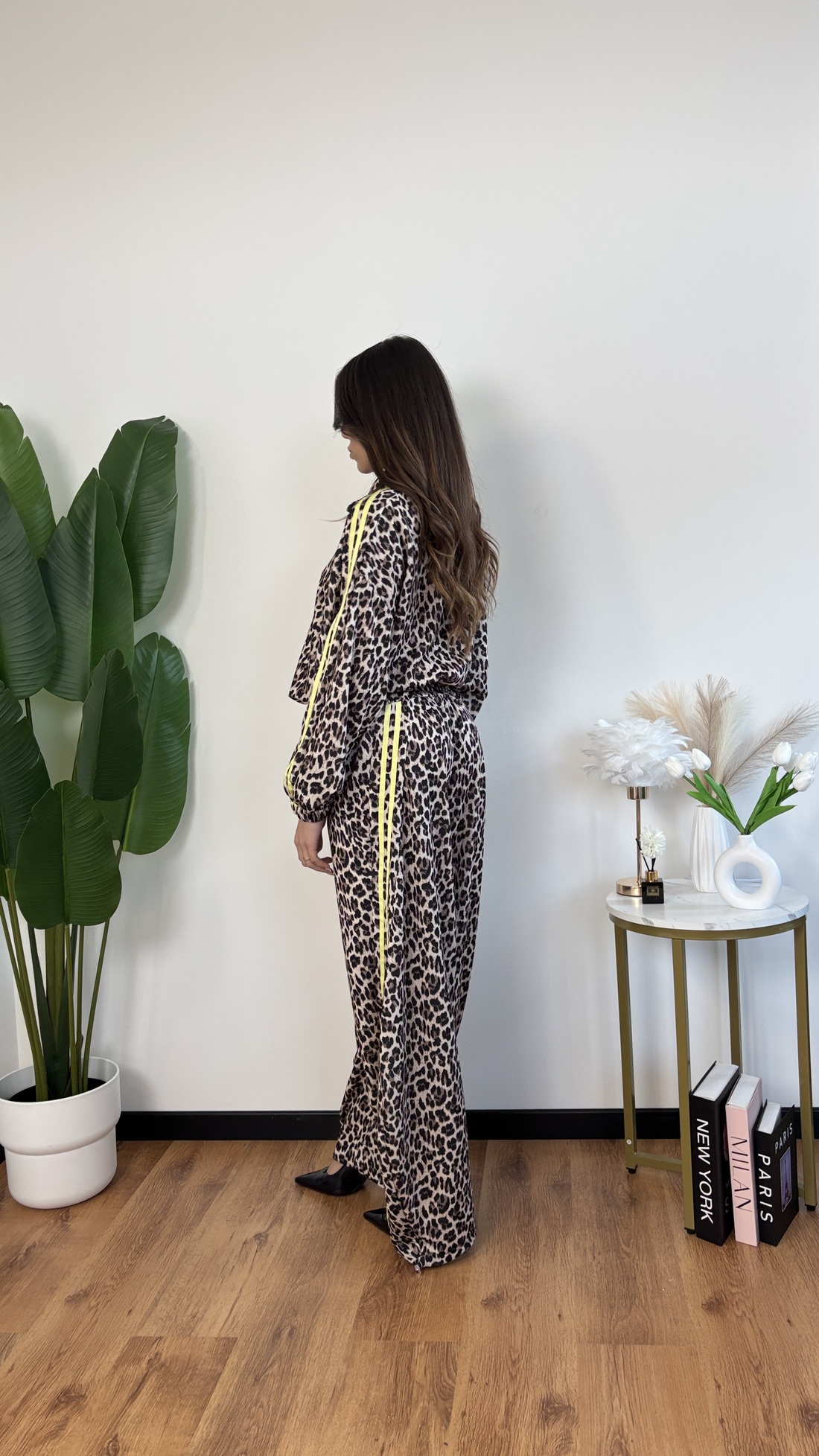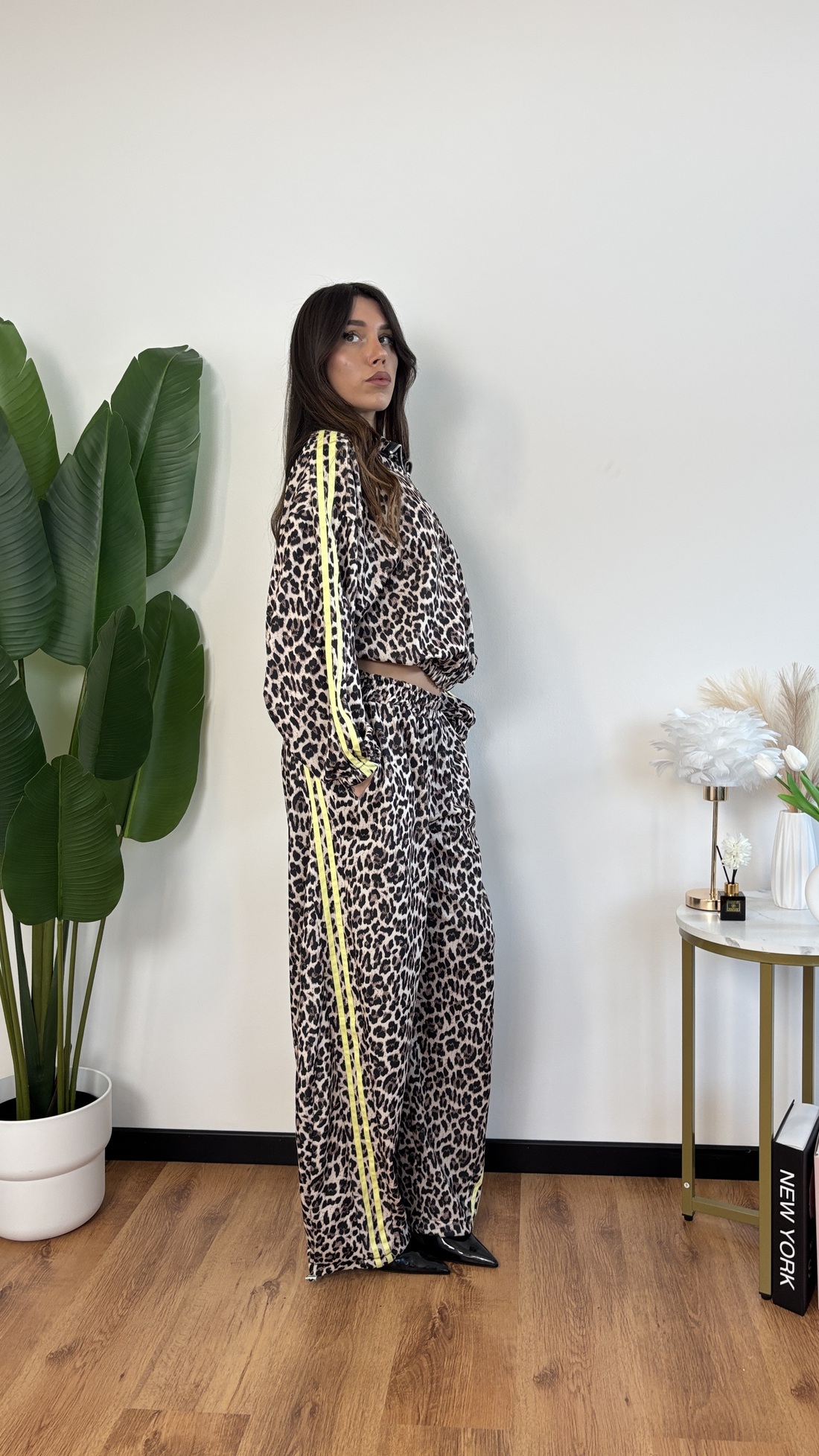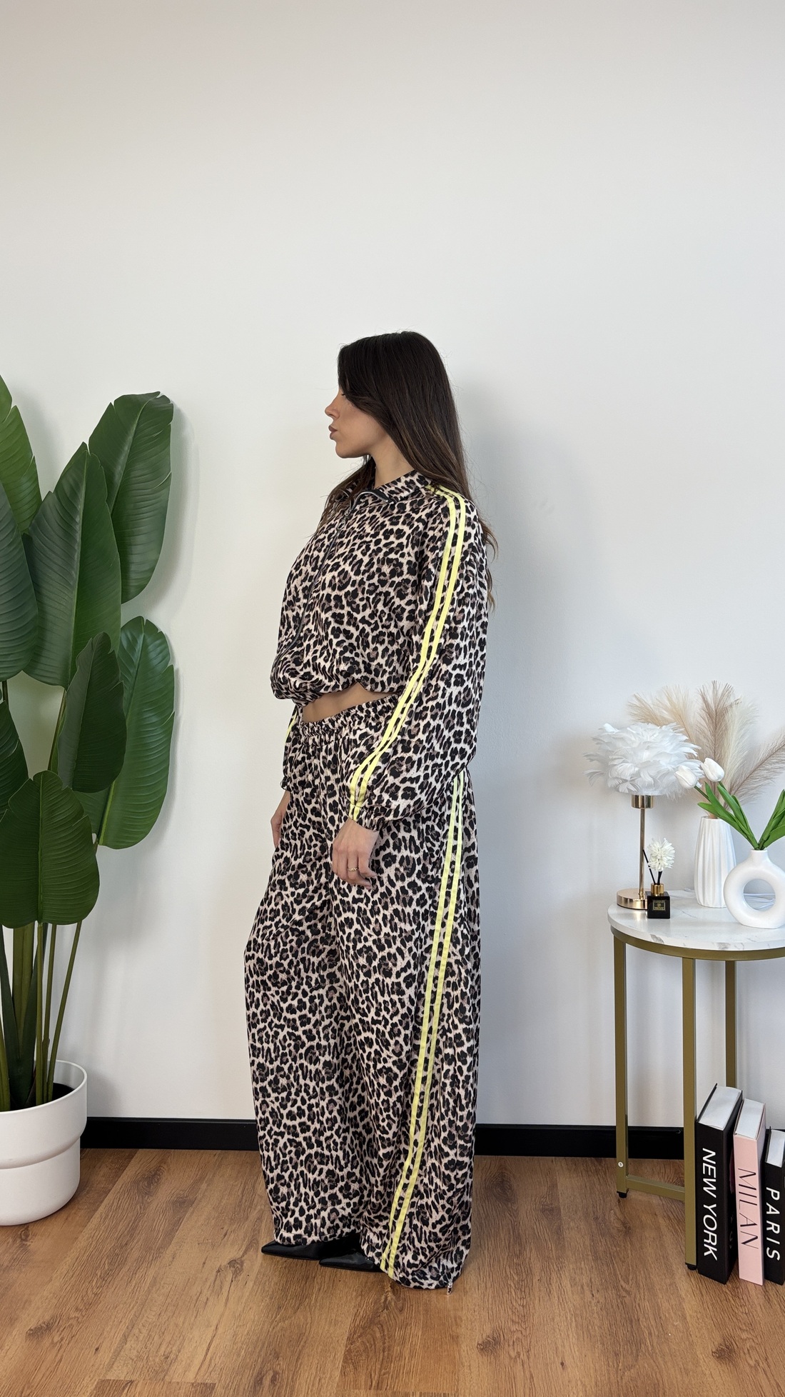 Coordinato in tuta maculata con bande gialle:
