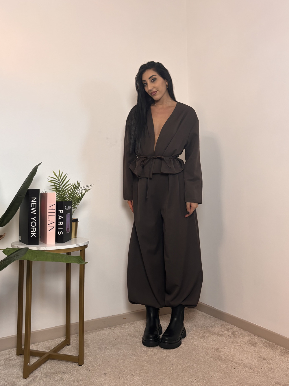 Giacca crop con laccetto regolabile e pantalone over con polsino in fondo.