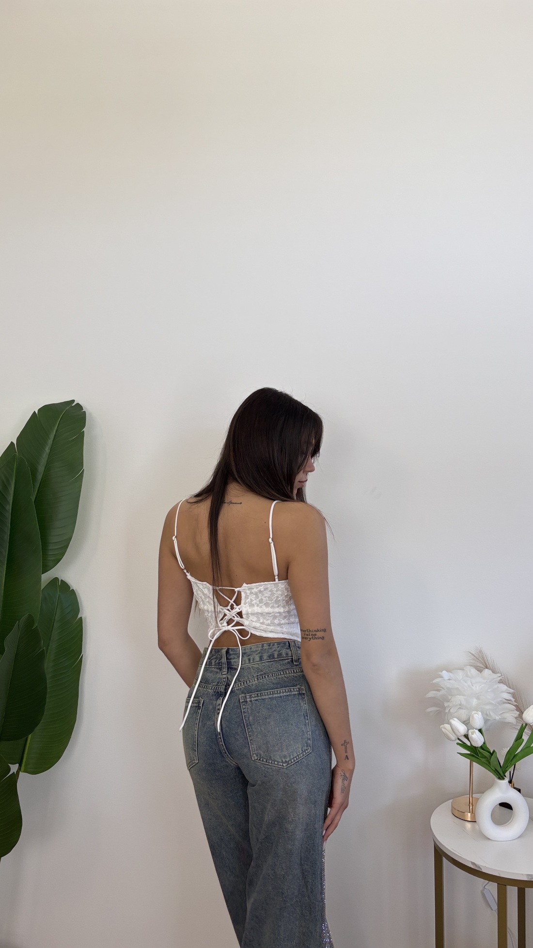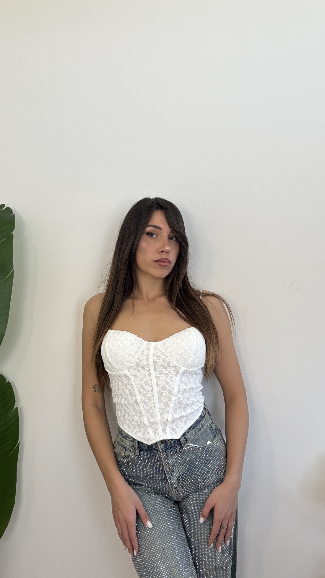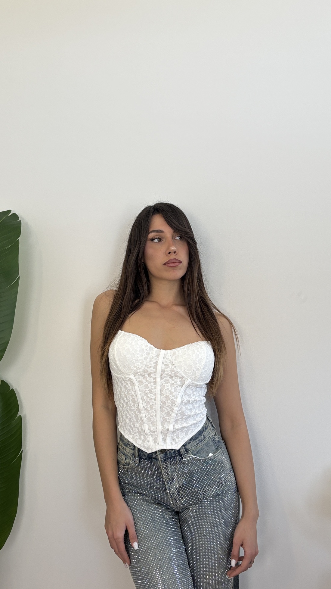 Corpetto in pizzo con spalline regolabili e lacci dietro alla schiena.