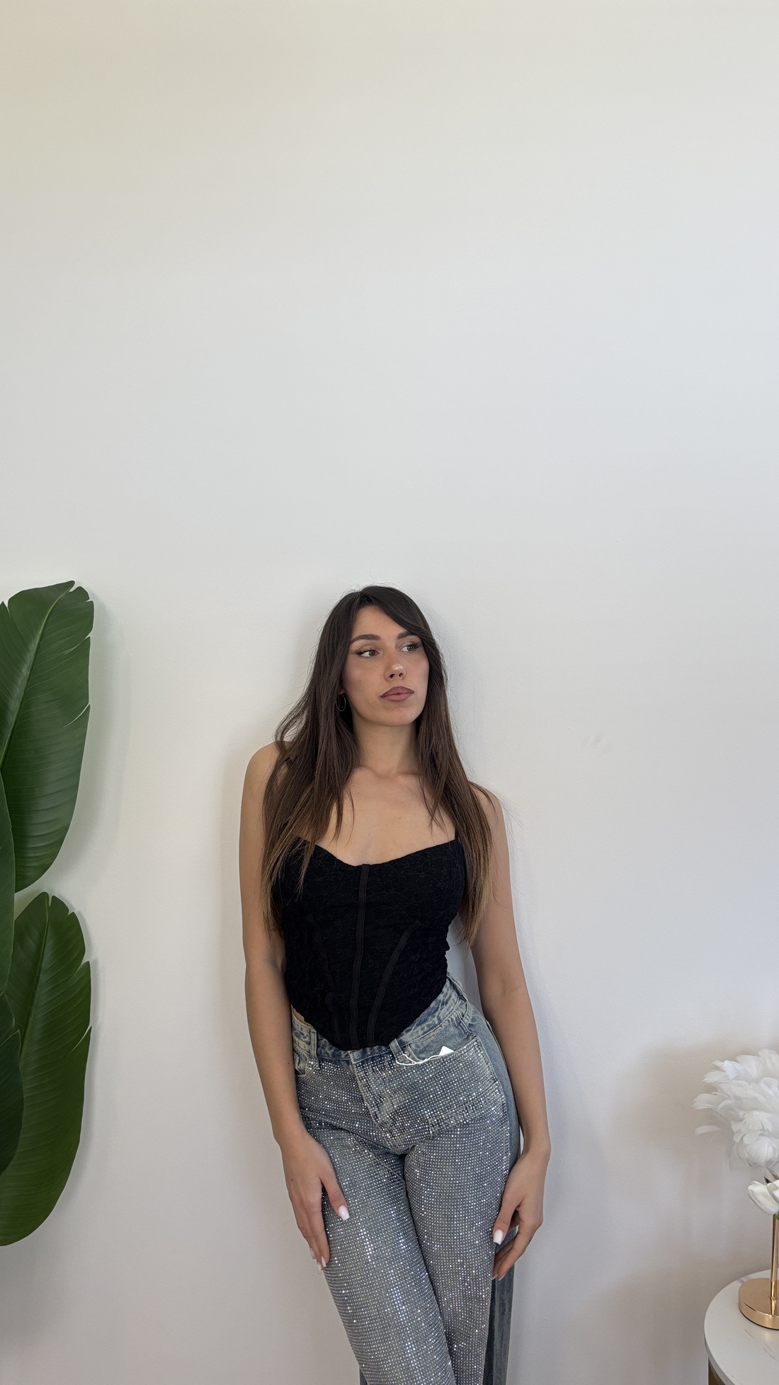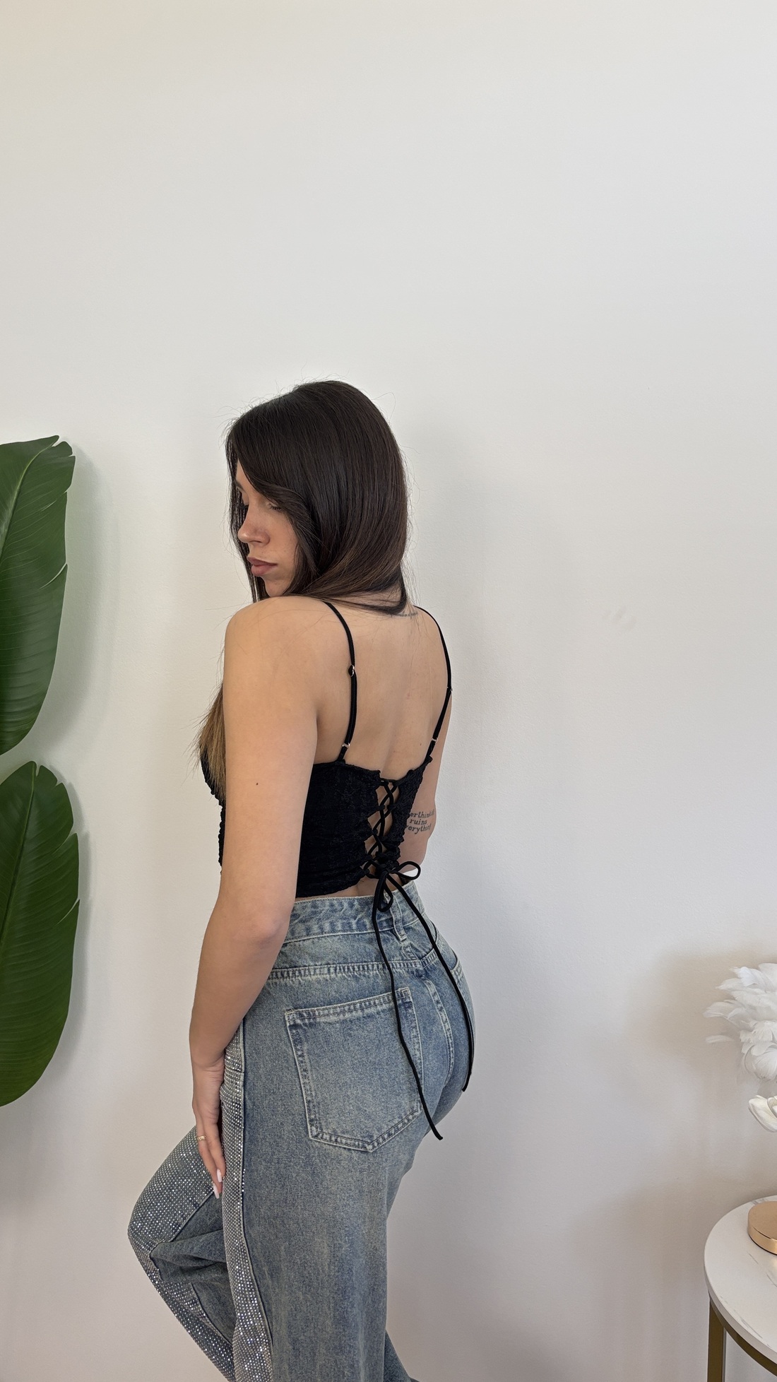 Corpetto in pizzo con spalline regolabili e lacci dietro alla schiena.
