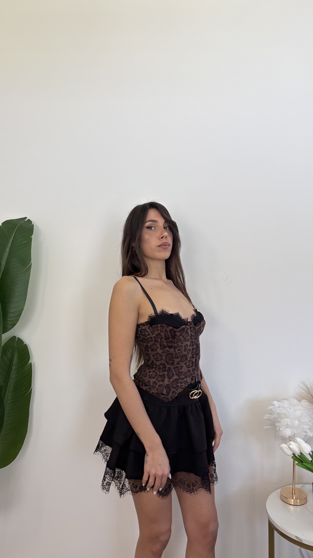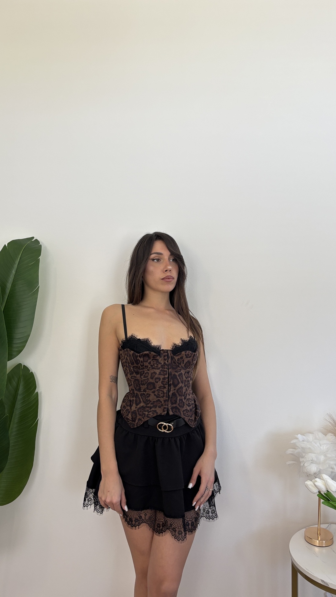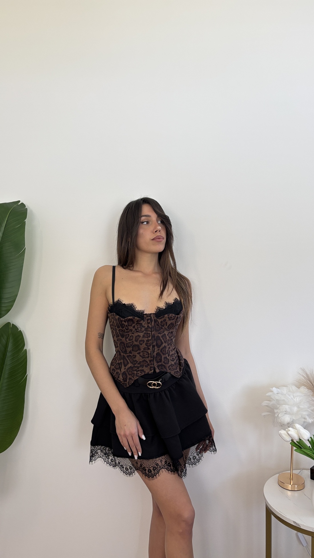 Corpetto maculato con gancini davanti, bretelle e corsetto regolabile.