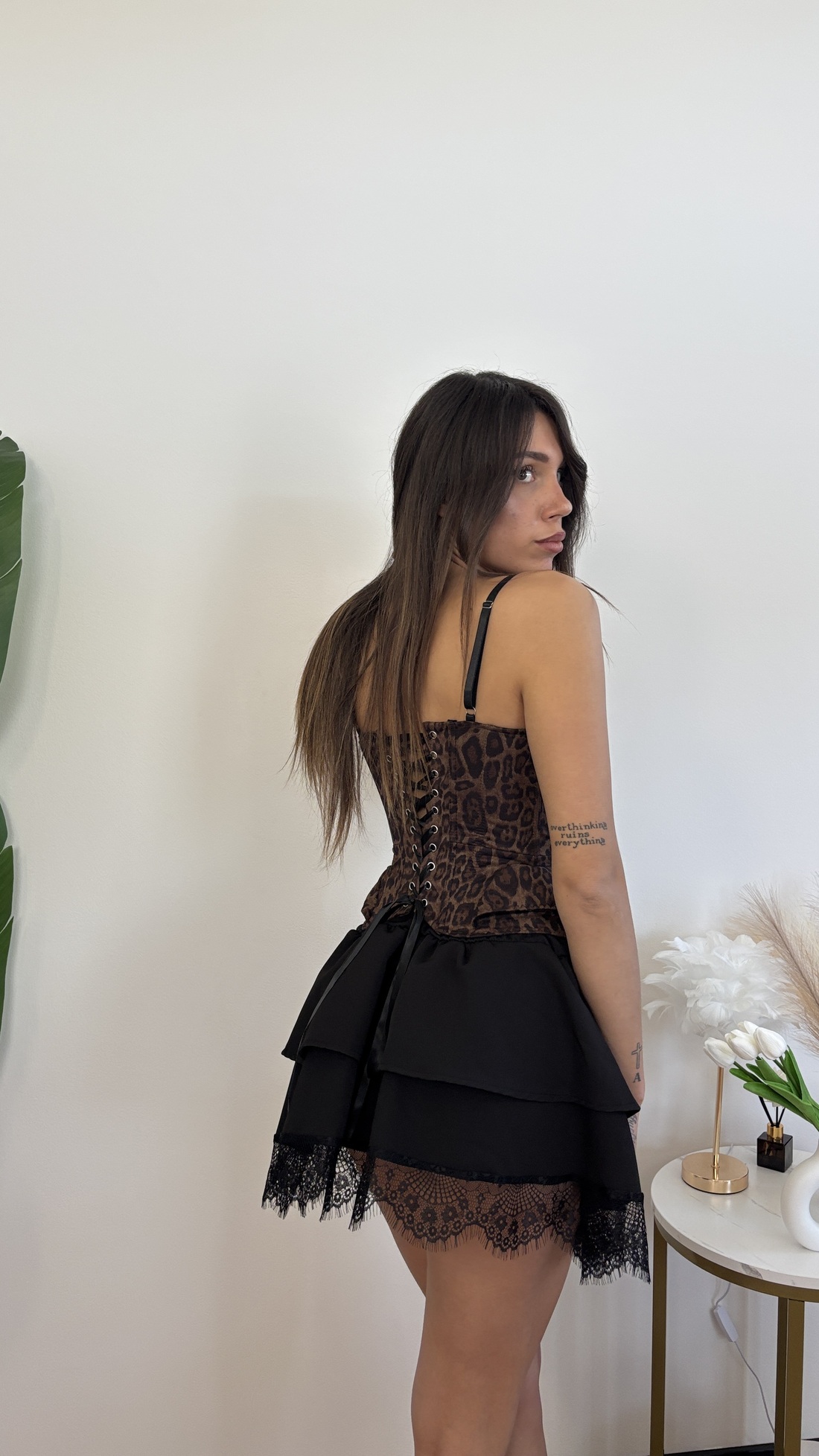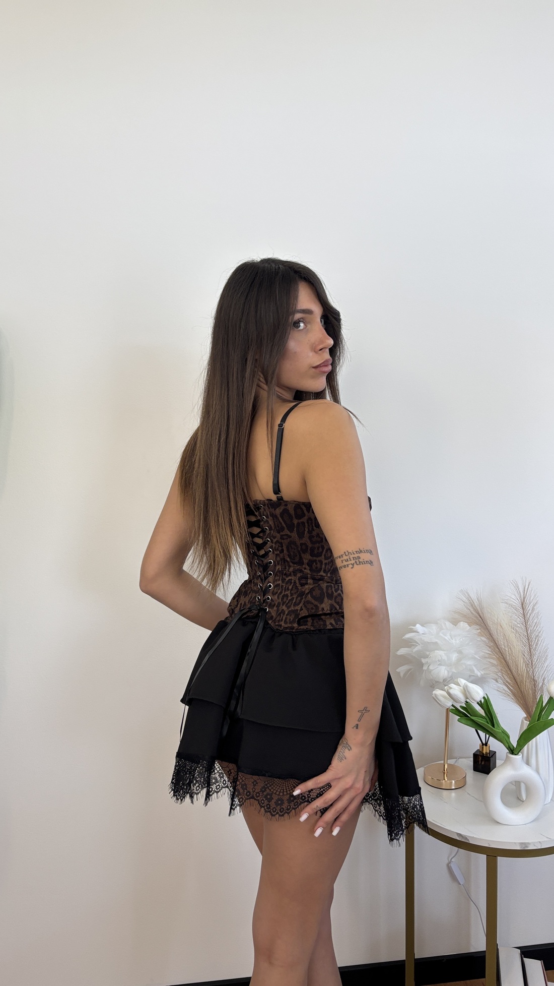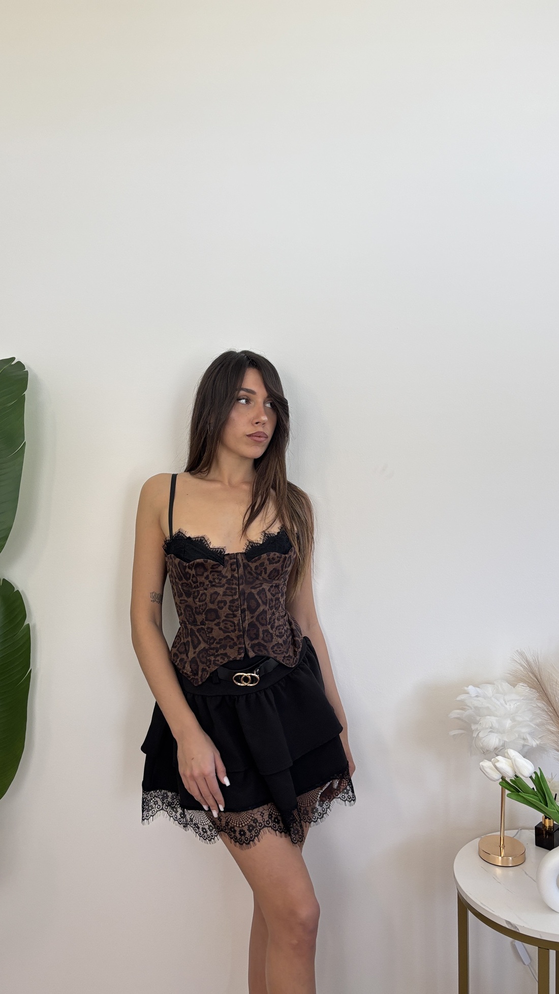 Corpetto maculato con gancini davanti, bretelle e corsetto regolabile.