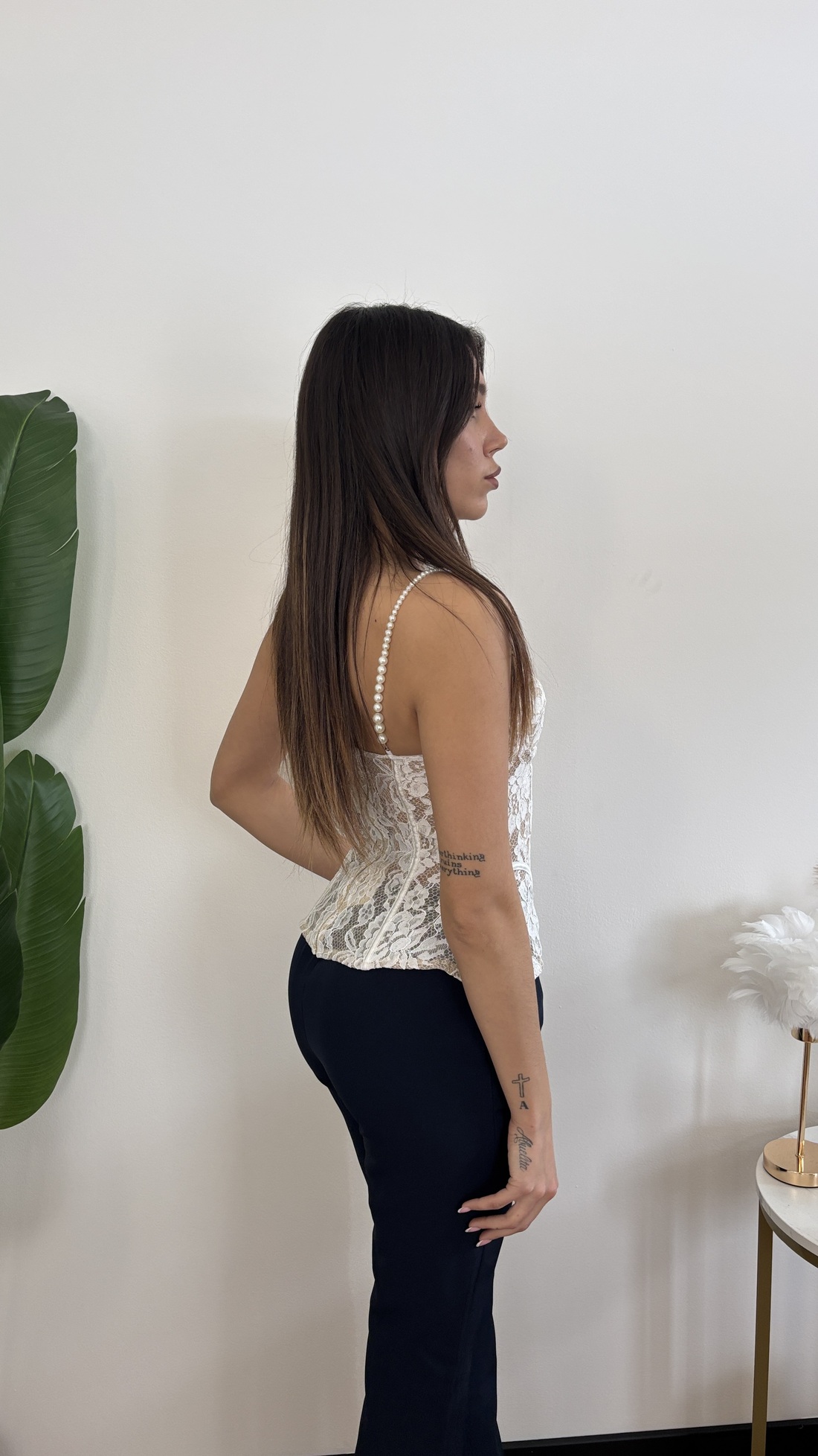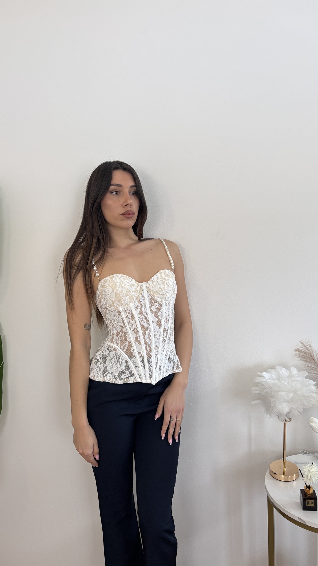 Corsetto con spalline in perla e zip dietro.